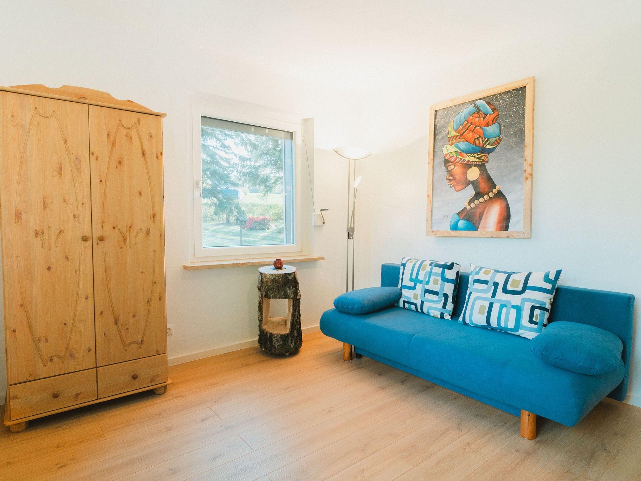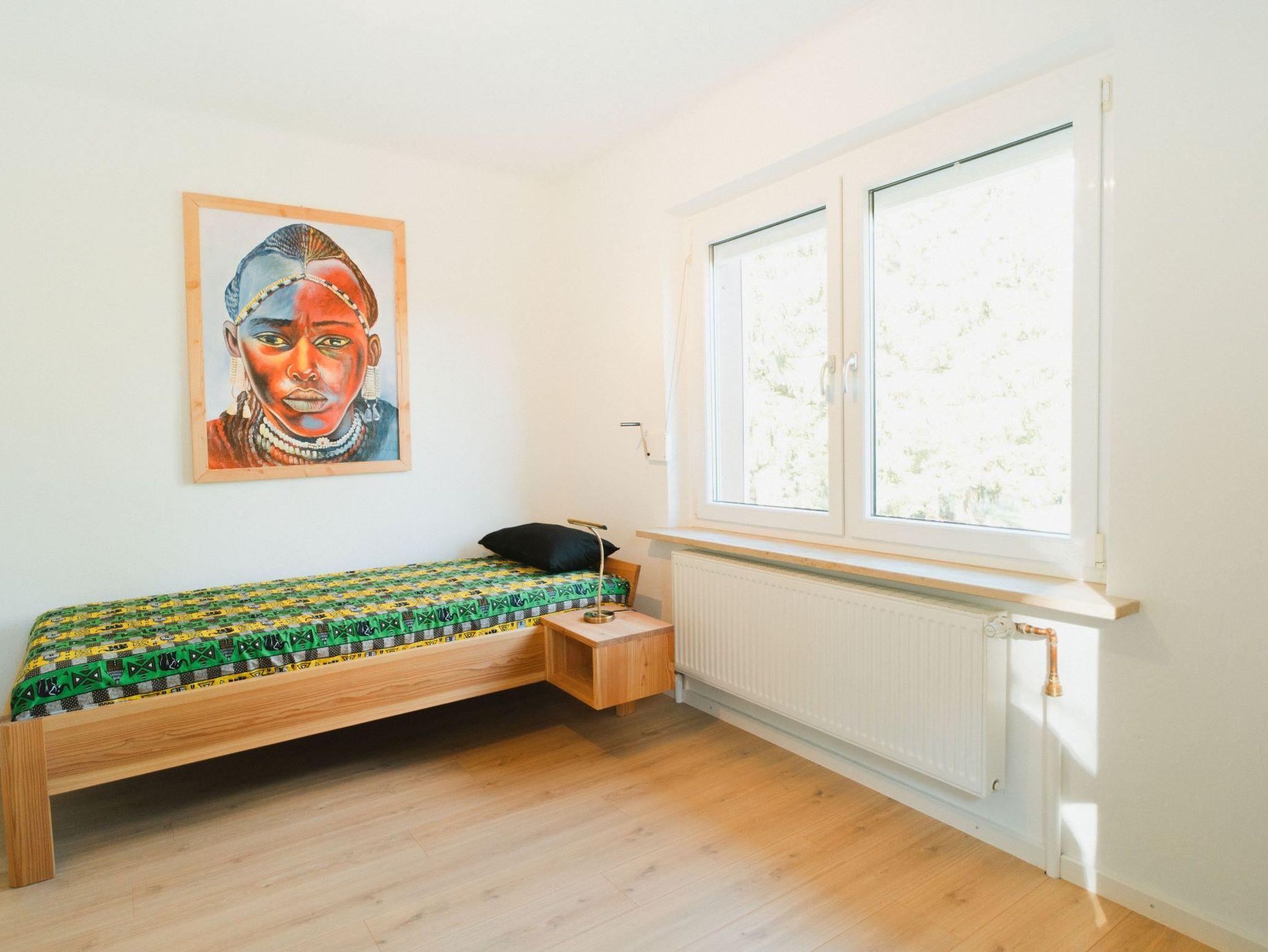 Es enthält ein vom Schreiner gebautes Einzelbett aus Lärchenholz und eine Schlafcouch.