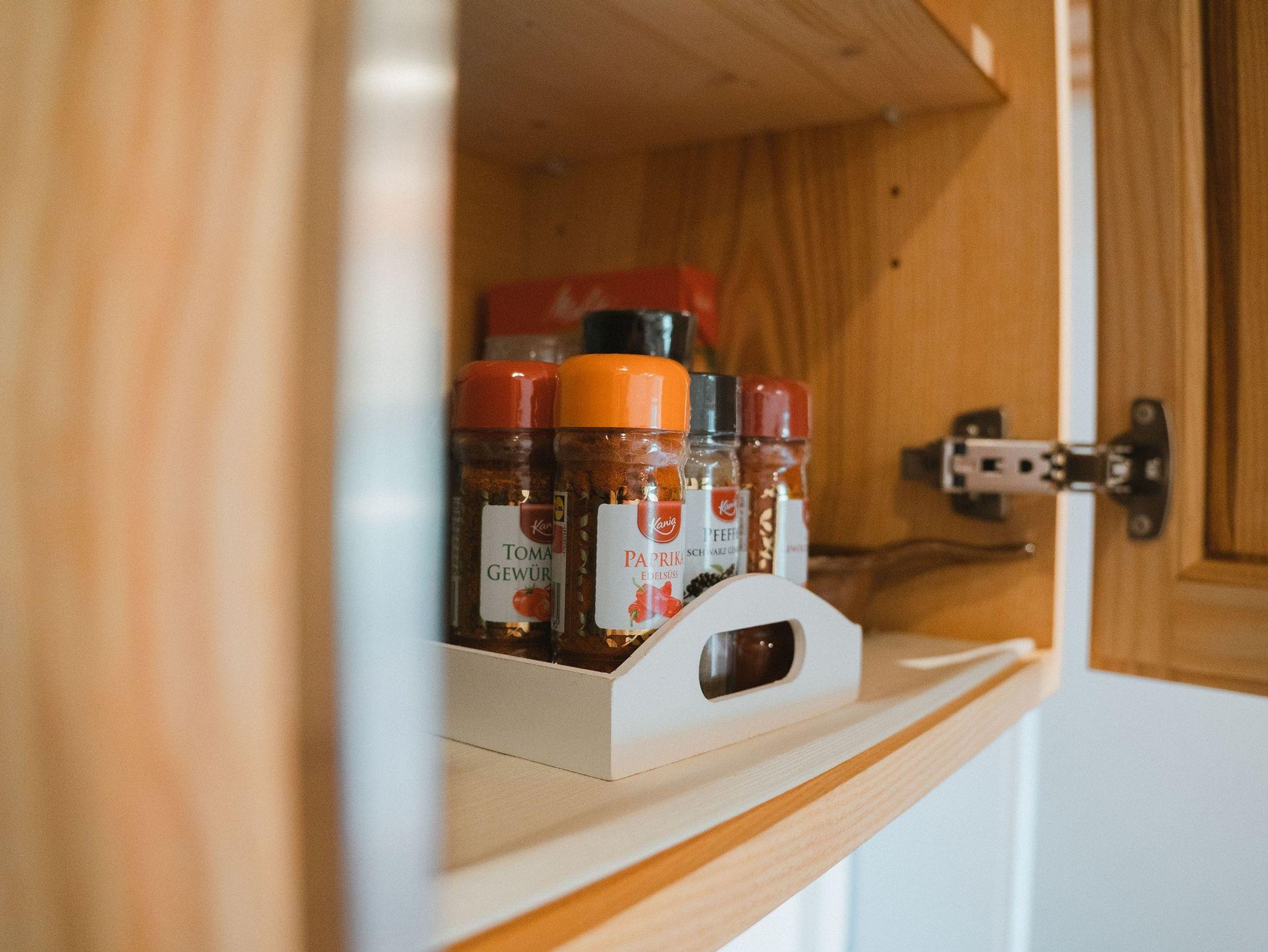 Ferner gehört eine kleine Auswahl an Gewürzen und Tee zum Kücheninventar.