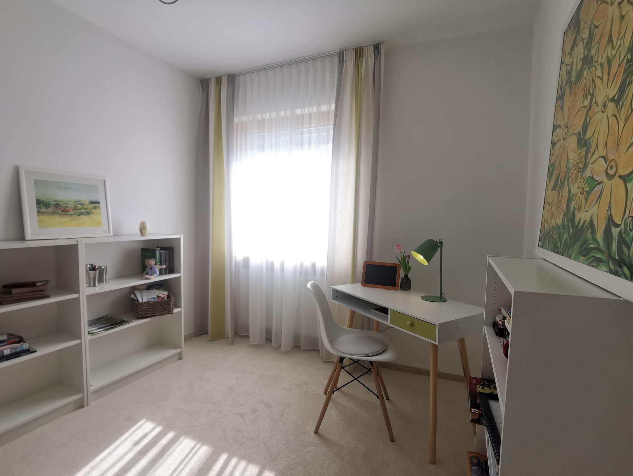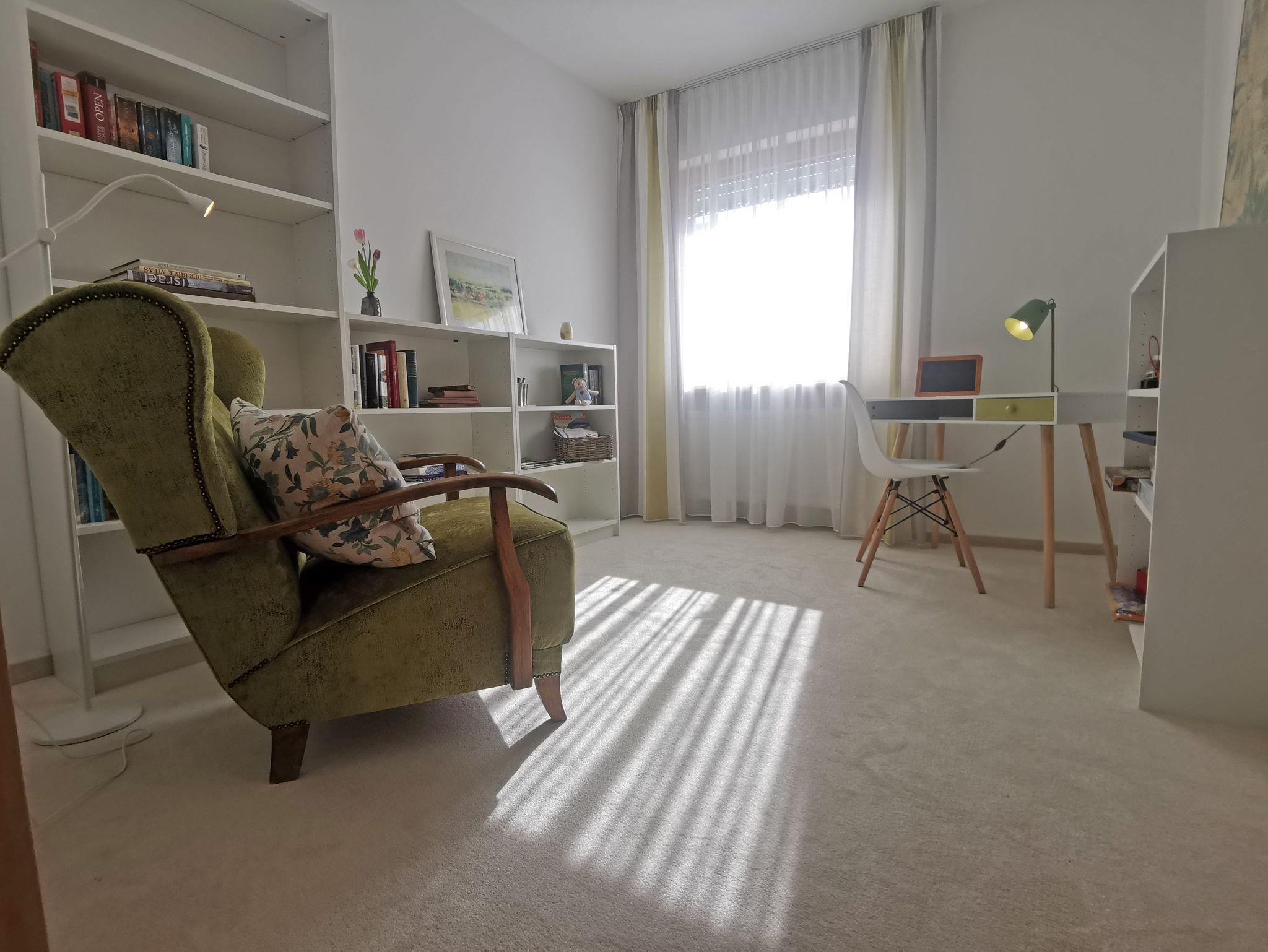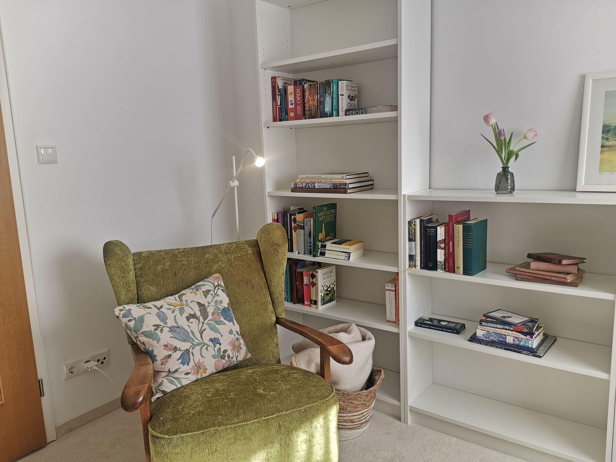 Im Erdgeschoss befindet sich ein weiterer Aufenthaltsraum, unser Lese-und Arbeitszimmer. Ebenfalls mit Blick auf den Rosengarten finden Sie hier alles um konzentriert Arbeit nachzugehen oder entspannt einige Stunden zu schmökern. Durch den Teppichboden ist der Raum sowohl im Winter als auch im Sommer sehr angenehm.