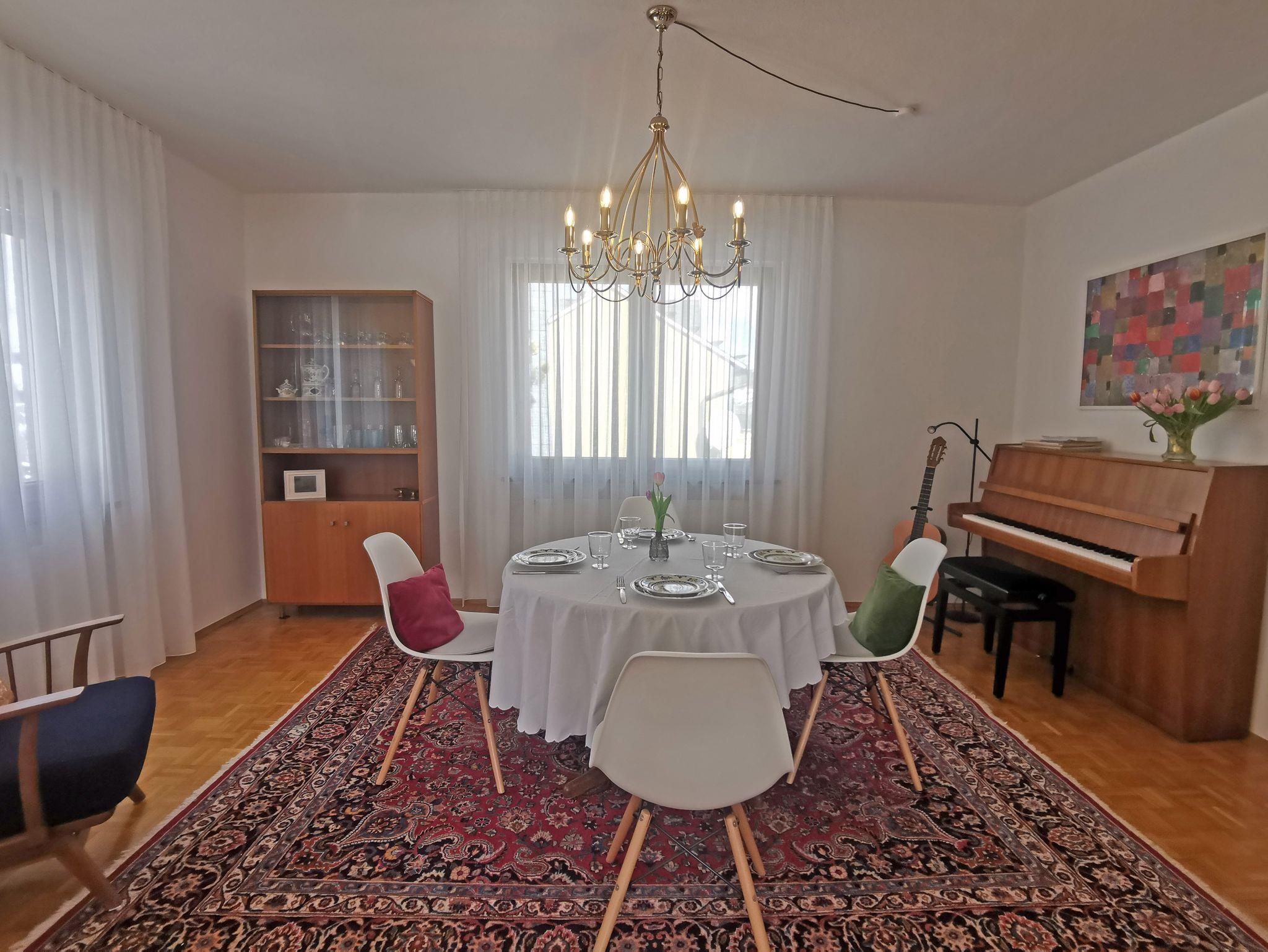 Das großzügige Esszimmer bietet Platz für bis zu 12 Besucher, mit einem ausziehbaren Tisch. Außerdem gibt es die Möglichkeit, das Klavier und die Gitarre für gemeinsame Abende zu verwenden.