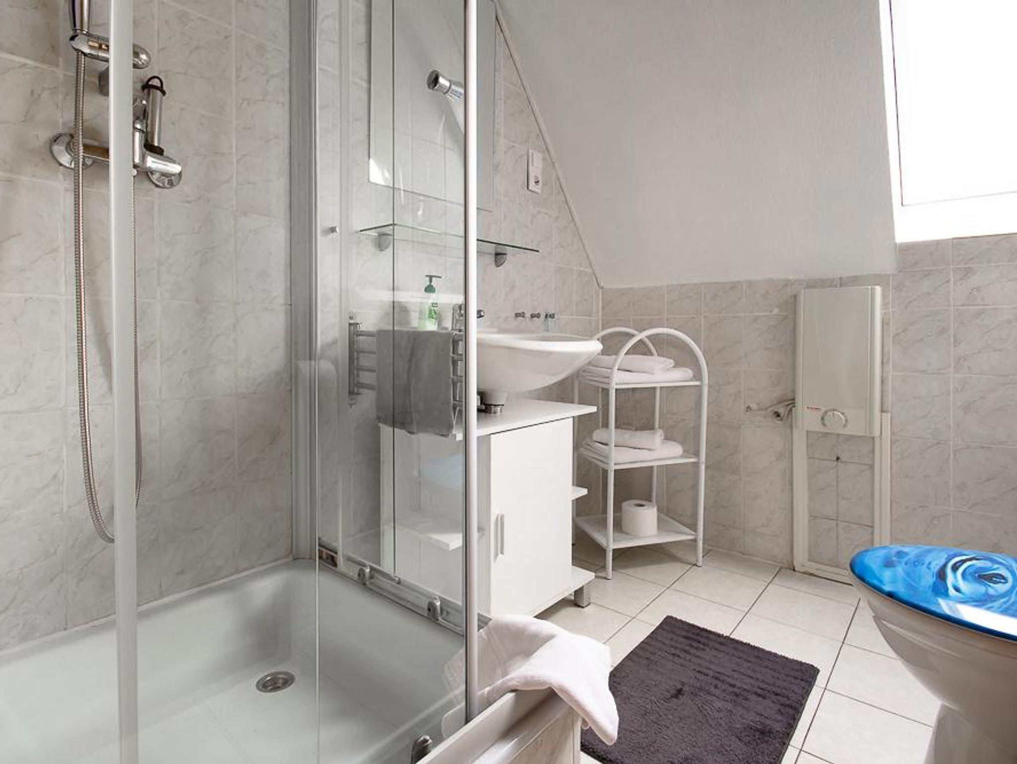 Das Badezimmer ist mit einer Dusche, großzügigem Waschbecken, beleuchtetem Spiegel und Toilette ausgestattet.