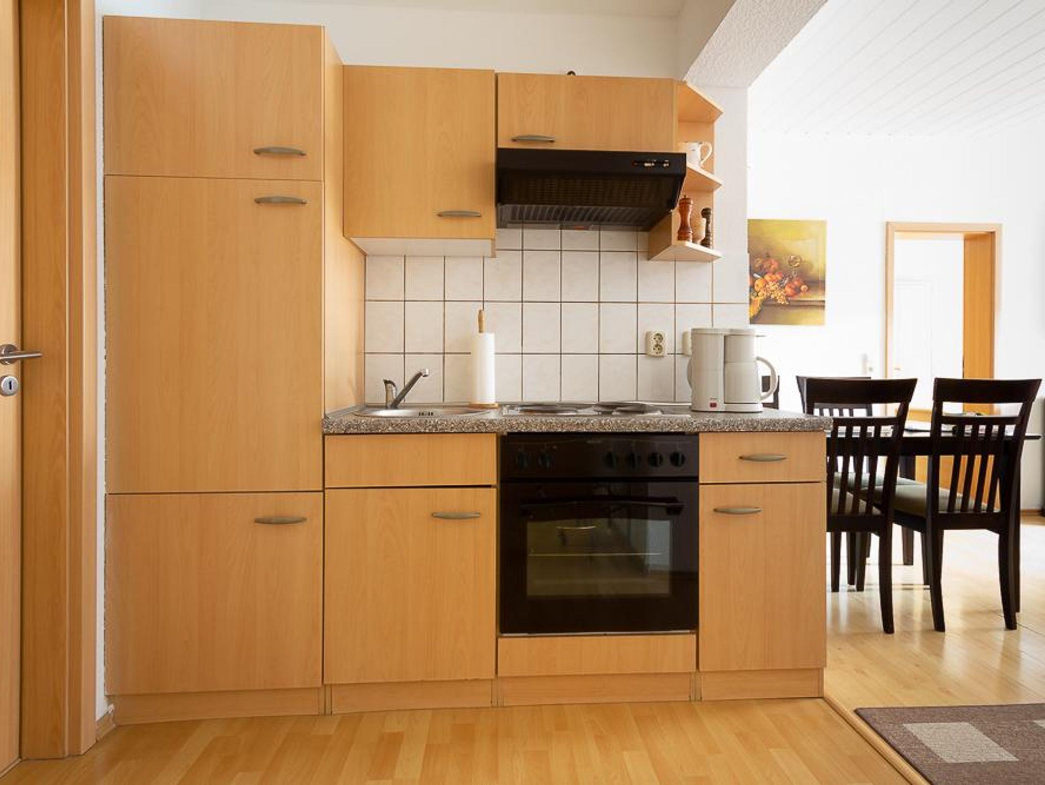 Die Ferienwohnung verfügt über eine komplett eingerichtete Wohnküche mit Geschirr, Kaffeemaschine, Wasserkocher, Elektroherd und Küchlschrank mit Gerfrierfach.