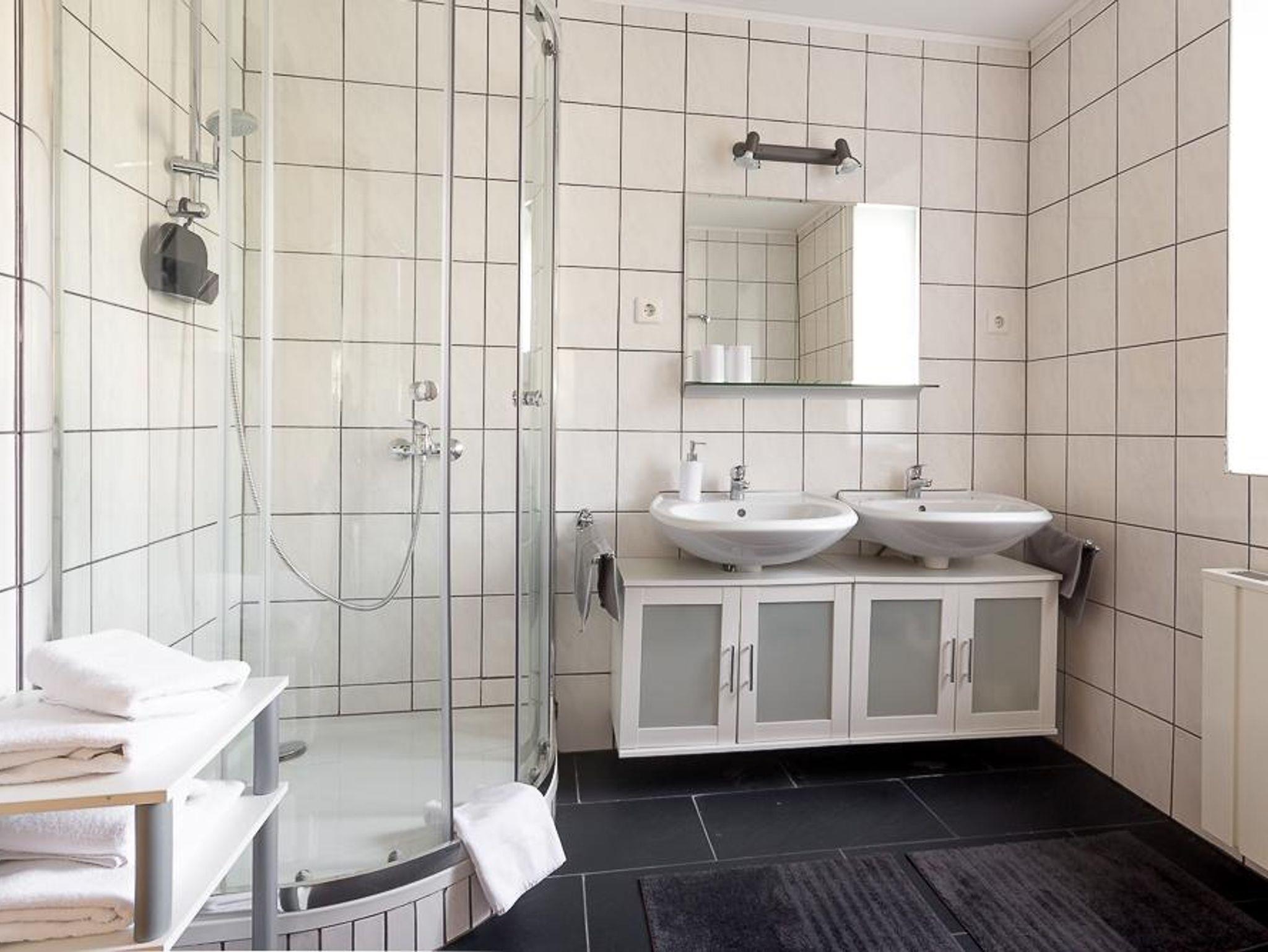 Das Badezimmer ist mit einer Dusche, großzügigem Waschbecken, beleuchtetem Spiegel und Toilette ausgestattet.