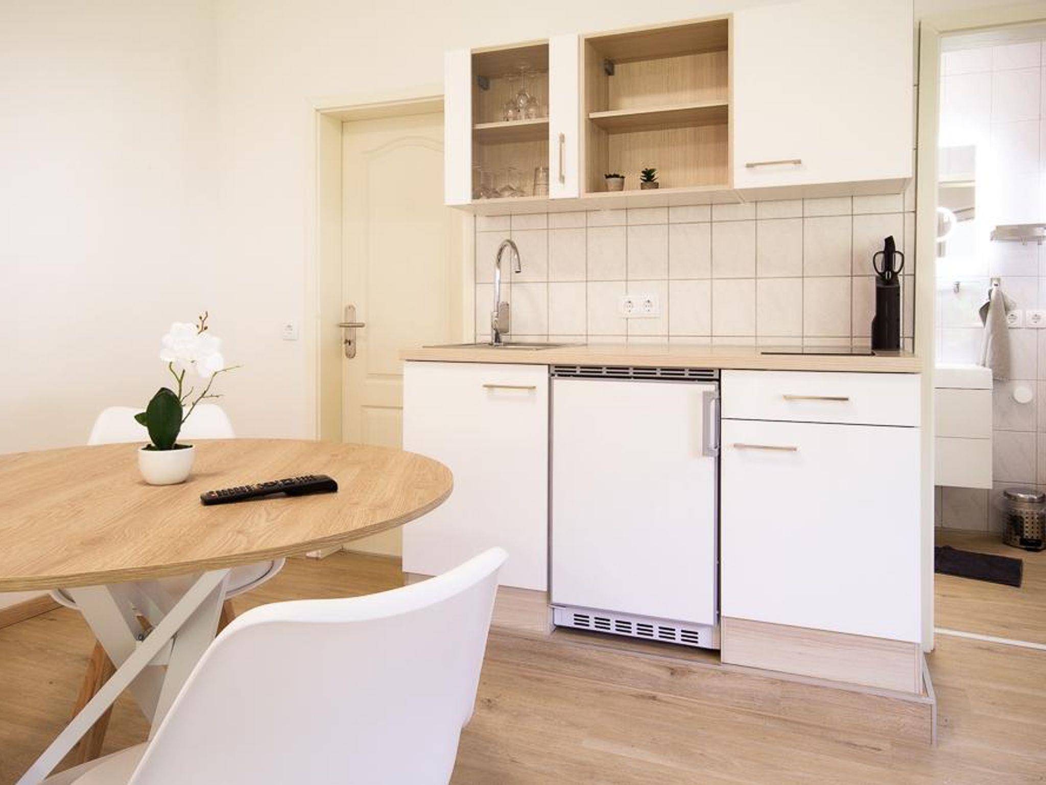 Das moderne Appartement Sommerresidenz hat eine Größe von 33 m² und ist ideal für 1-2 Personen. Das Appartement verfügt über eine komplett eingerichtete Wohnküche mit Geschirr, Kaffeemaschine, Wasserkocher, Elektroherd und Küchlschrank mit Gerfrierfach.