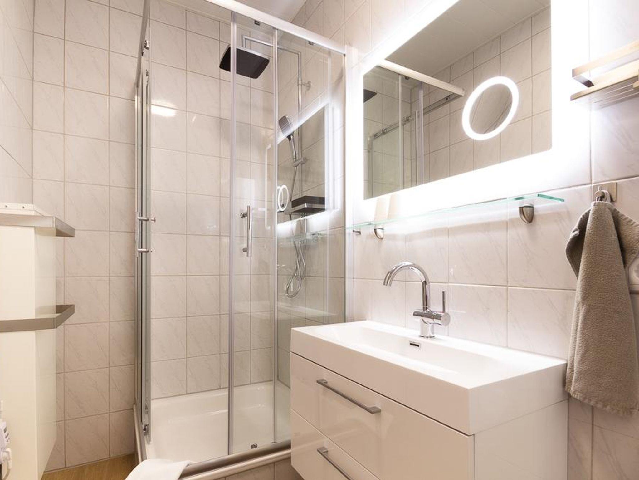 Das Badezimmer ist mit einer Dusche, großzügigem Waschbecken, beleuchtetem Spiegel und Toilette ausgestattet.