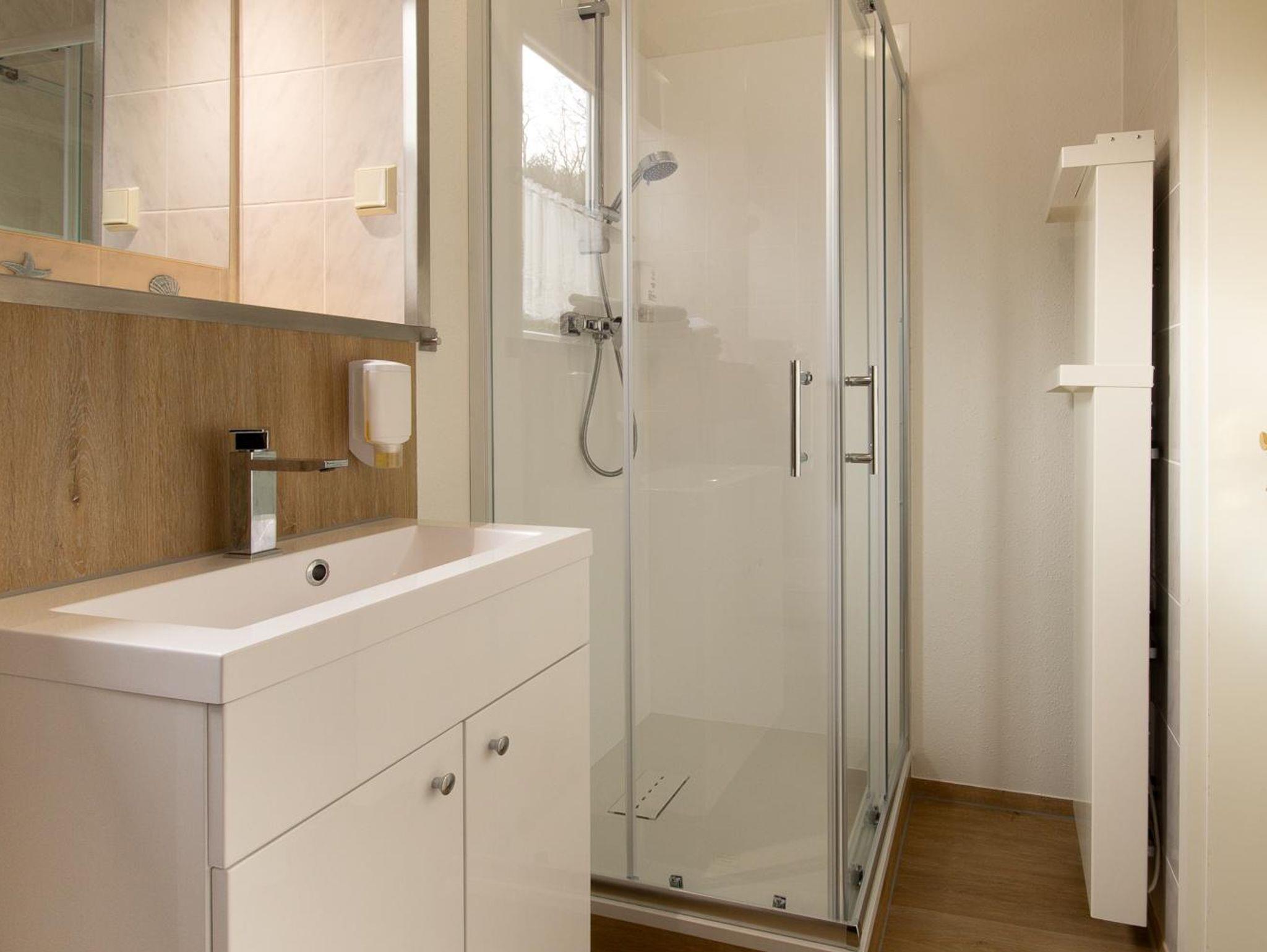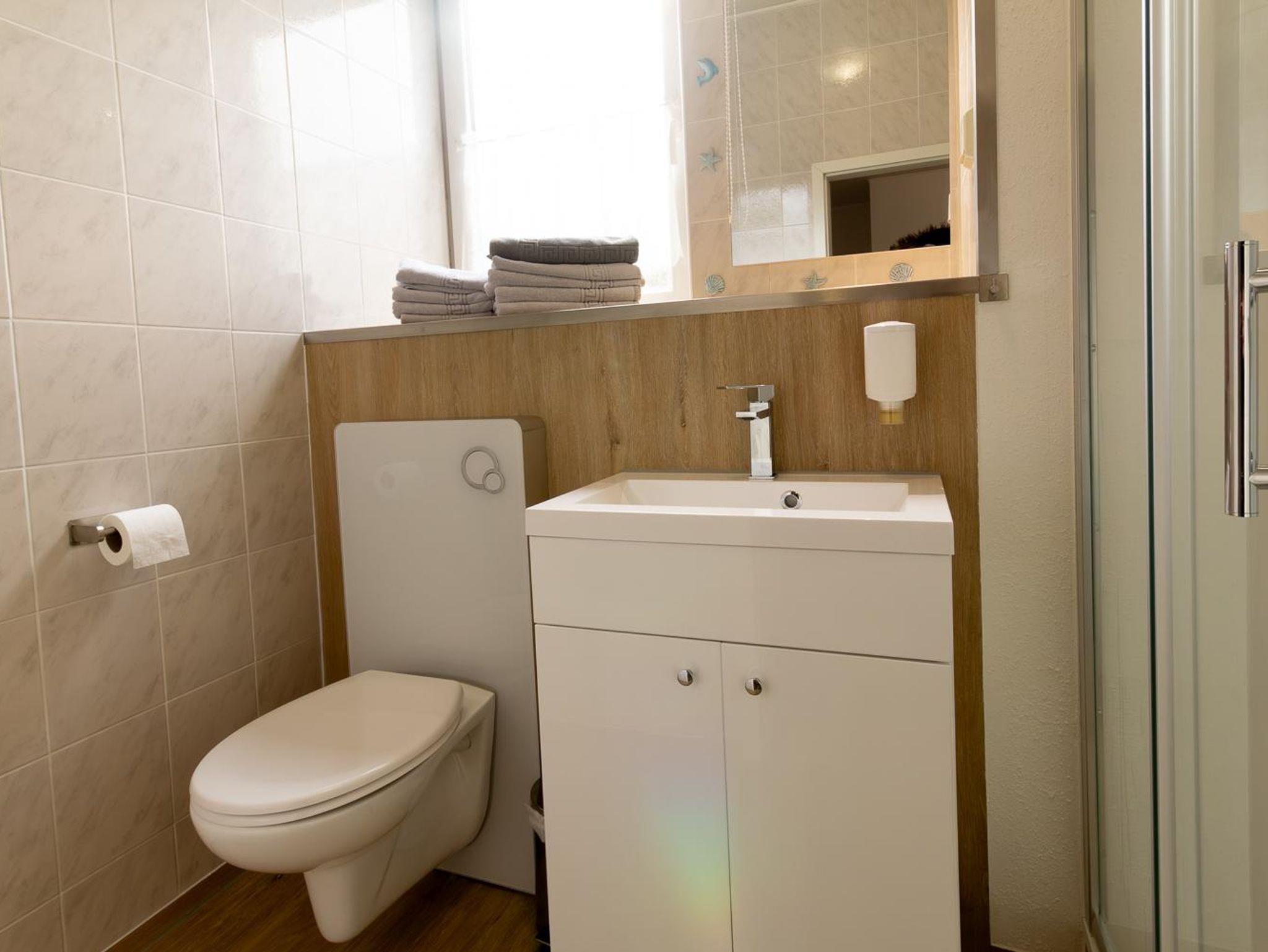 Das Badezimmer ist mit einer Dusche, großzügigem Waschbecken, beleuchteten Spiegel und Toilette ausgestattet.