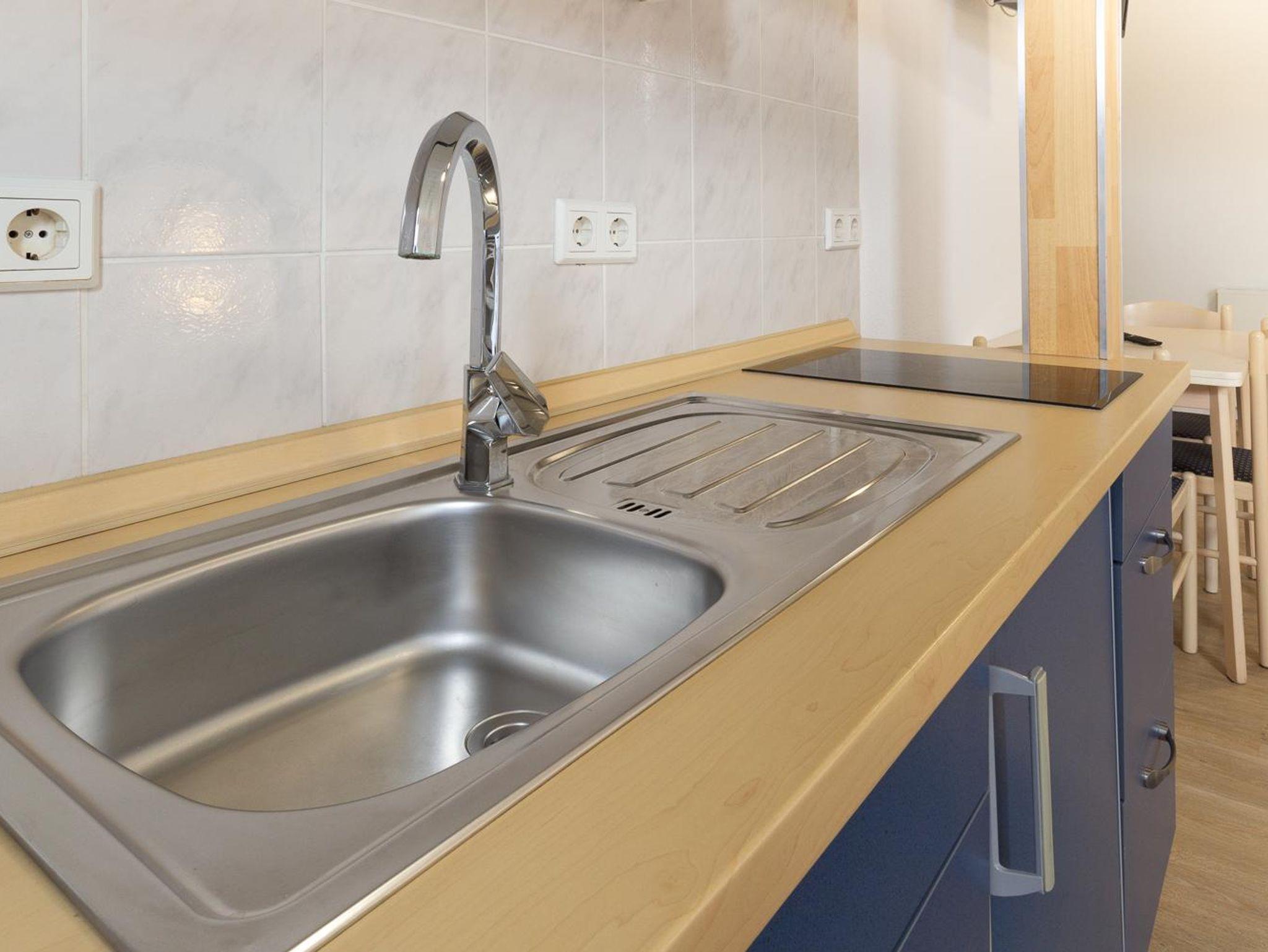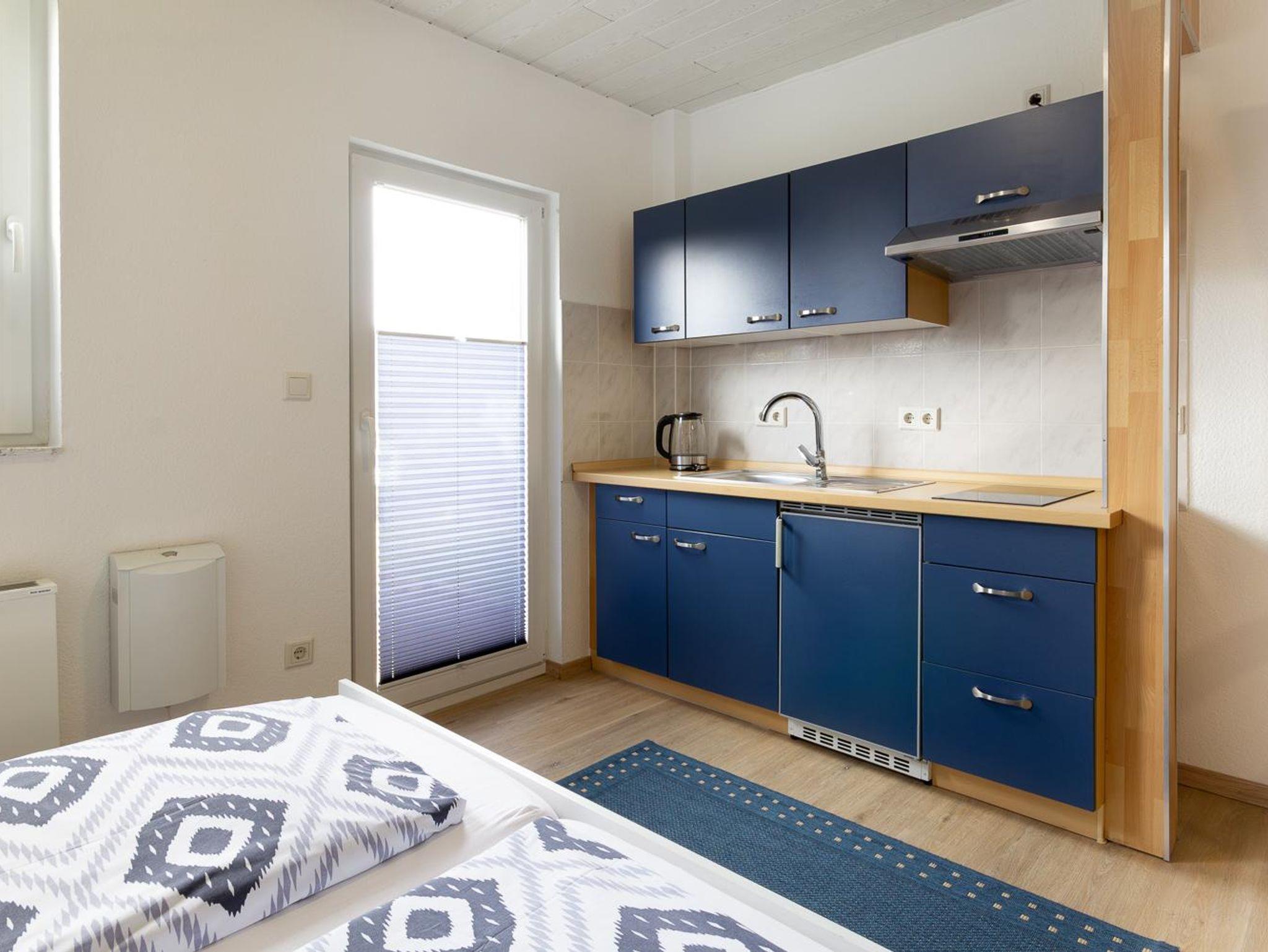 Das Appartement verfügt über eine komplett eingerichtete Wohnküche mit Geschirr, Kaffeemaschine, Wasserkocher, Elektroherd und Küchlschrank mit Gerfrierfach.