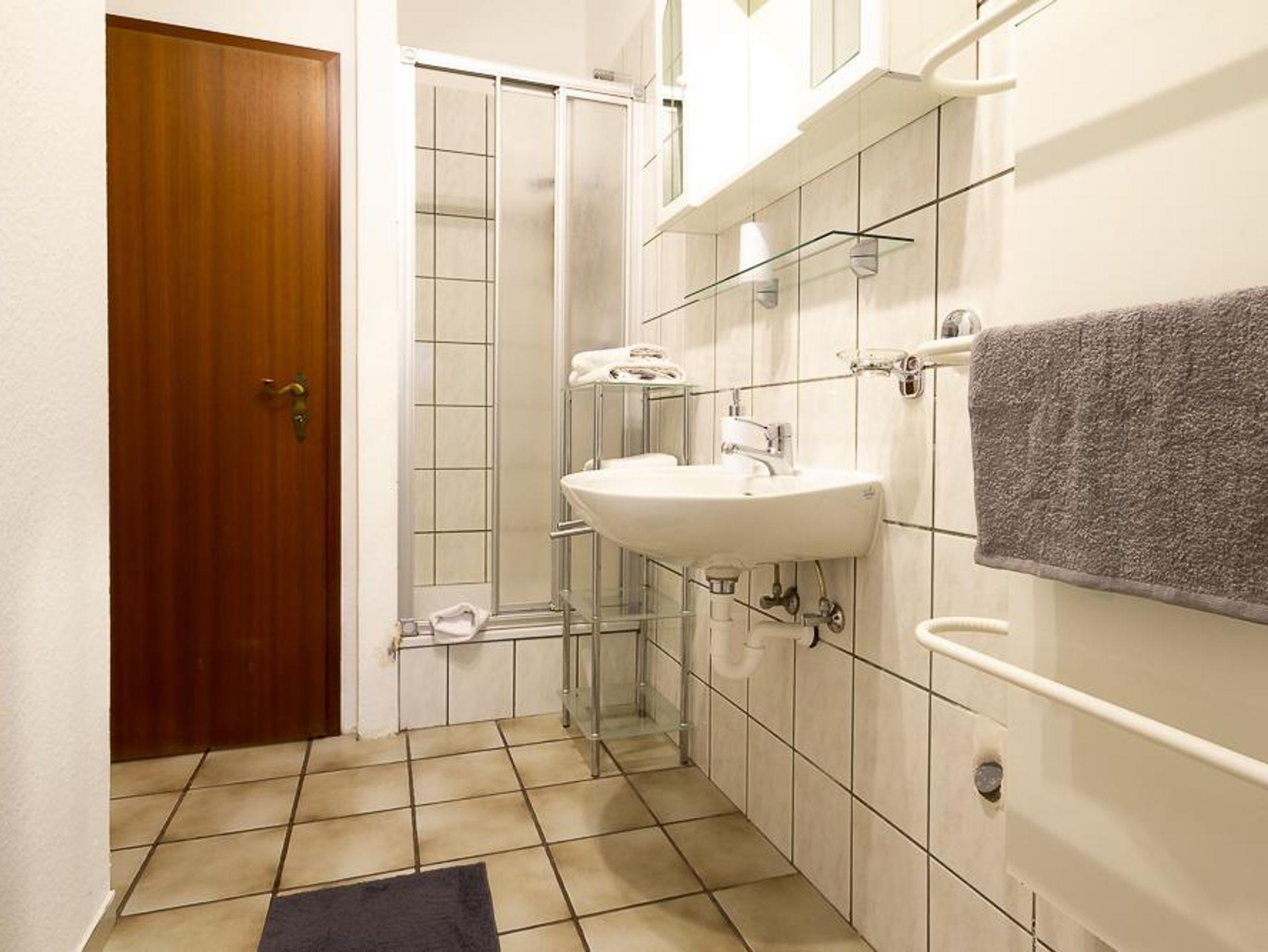 Das Badezimmer ist mit einer Dusche, großzügigem Waschbecken, beleuchtetem Spiegel und Toilette ausgestattet.