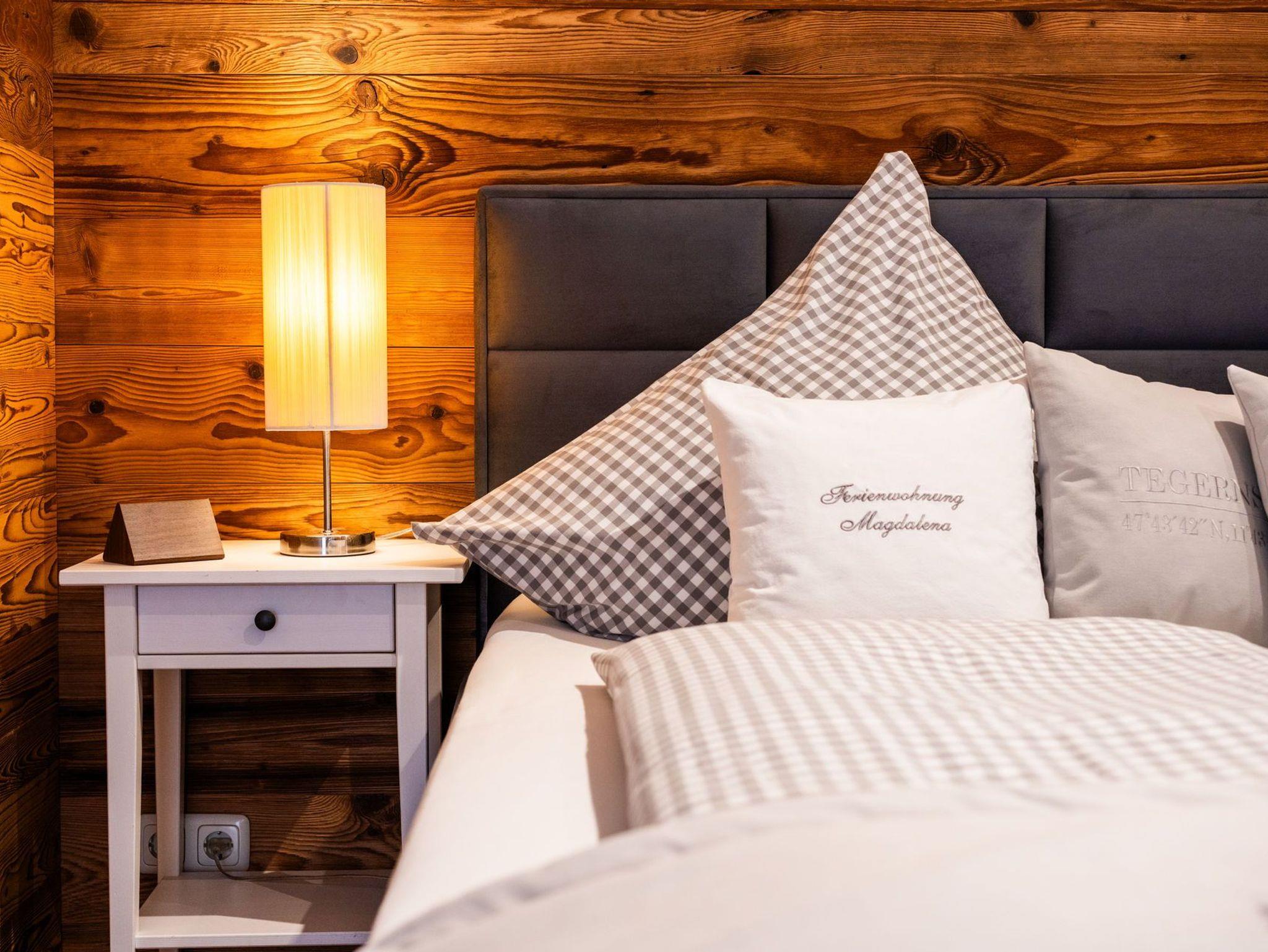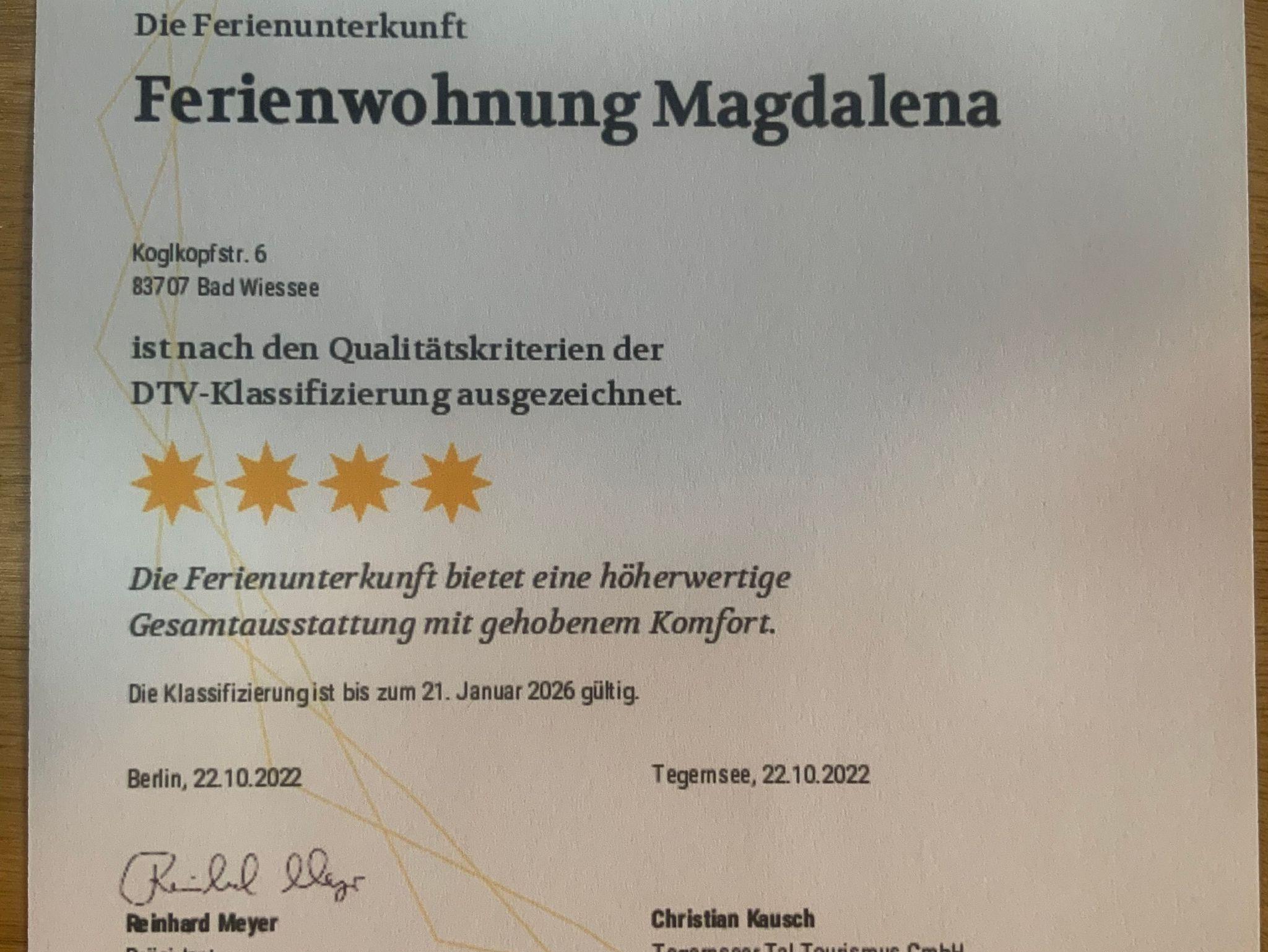 Herzlich Willkommen in Bad Wiessee am wunderschönen Tegernsee in unserer im oberbayerischen Stil ausgebauten und laufend renovierten Ferienwohnung Magdalena. Ihr Urlaubsdomizil ist hochwertig ausgestattet und bietet Ihnen jeglichen Komfort. Die ansprechend mit echtem Altholz ausgebaute Wohnung verfügt über einen gemütlichen Wohnbereich, ein Schlafzimmer mit bequemen Boxspringbett, eine separate und voll ausgestattete Küche, ein extra Esszimmer mit Lese-Ecke, ein Bad/WC mit Whirlwanne inkl. ausziehbaren Duschkopf, einen Balkon mit Sitzmöglichkeiten, Flachbild-TV inkl. Vodafone GIGA-TV, 2x Stereoradio mit CD-Player (MP3/USB/Bluetooth-fähig), privaten WLAN-Zugang und Safe. Waschmaschine und Trockner sind direkt in der Wohnung vorhanden (gegen Gebühr). Ein privater, kostenloser und videoüberwachter Parkplatz für Ihr Fahrzeug, eine KFZ E-Ladestation und eine Liegewiese mit Außengrill inkl. Sitzgarnitur befinden sich direkt am Haus. Auf Wunsch Brötchen-, Zeitungs- sowie Transferservice zum Bahnhof (gegen Gebühr). Die Tegernsee-Card mit vielen Vergünstigungen (z.B. kostenlose Nutzung des Bus- und Schifffahrtsnetzes am See) ist für jeden Gast im Preis inbegriffen.