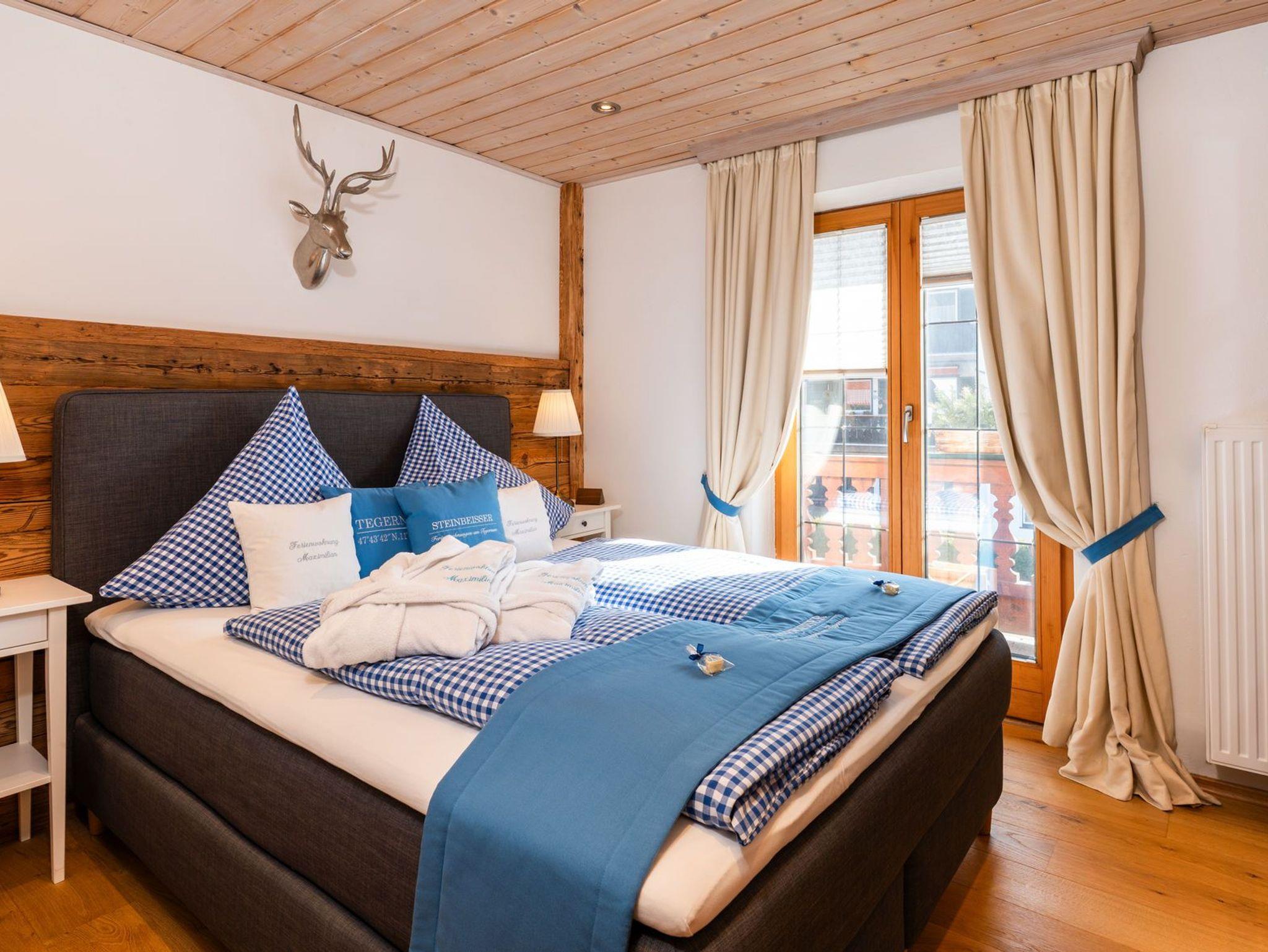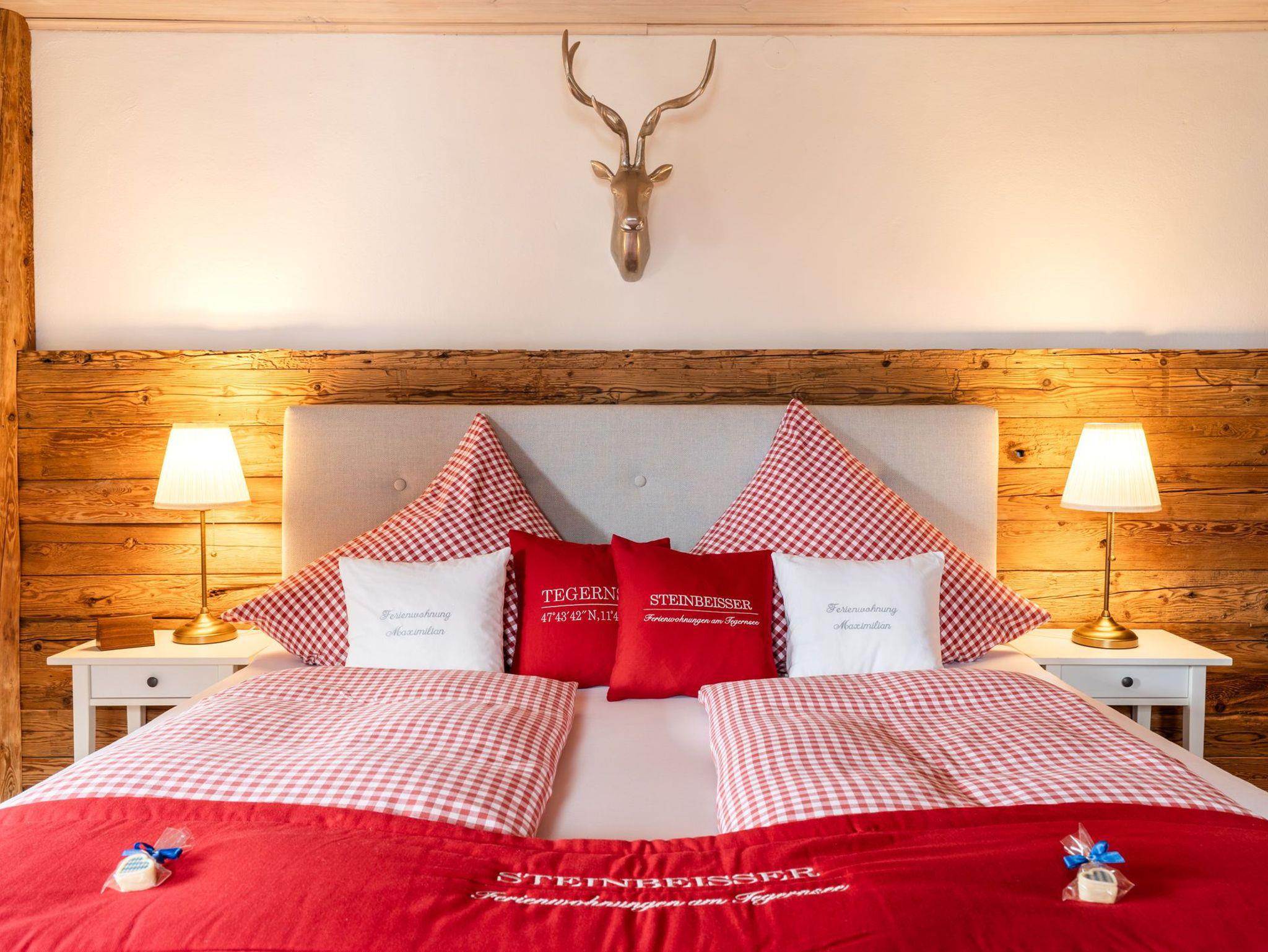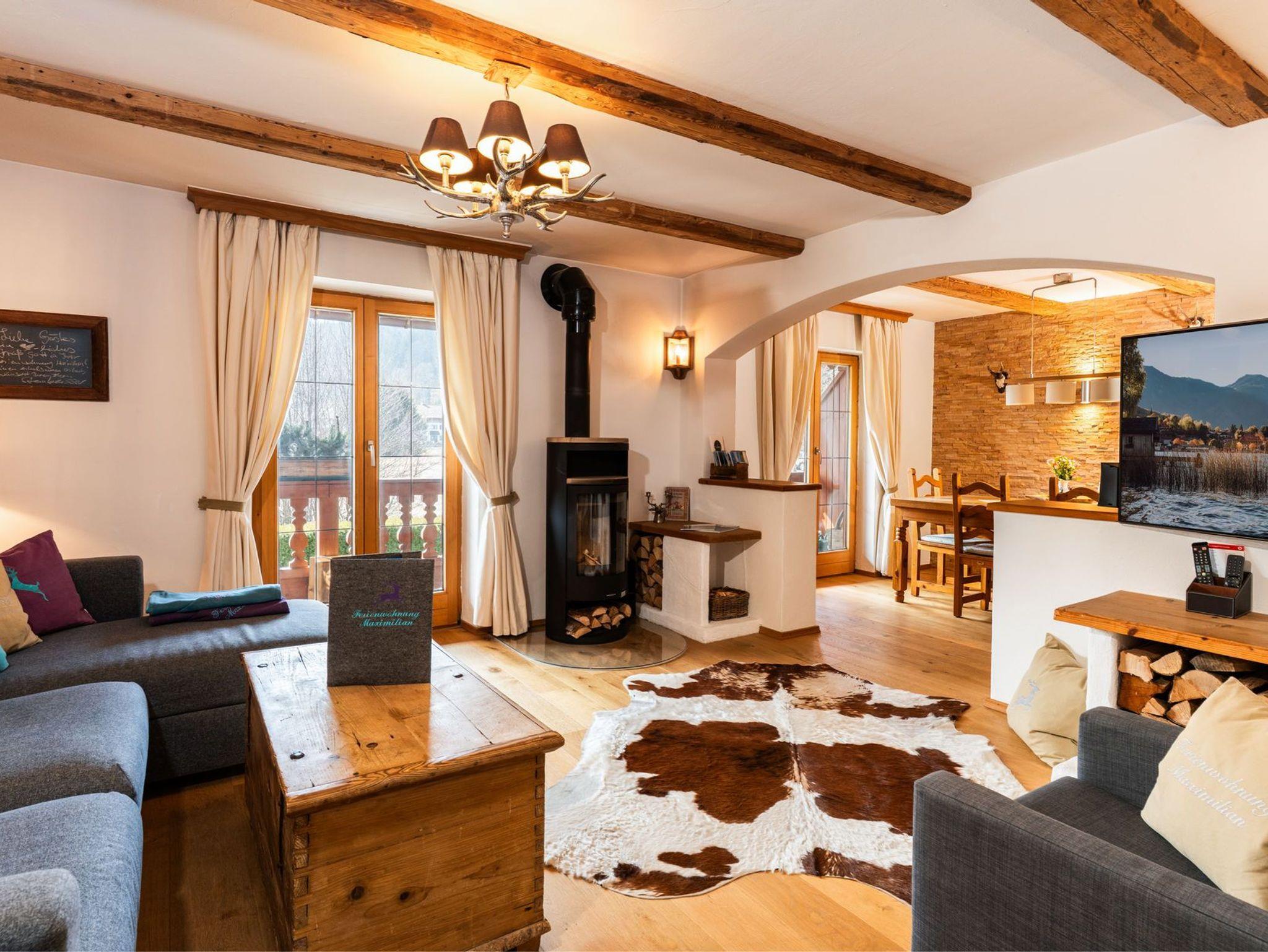 Herzlich Willkommen in Bad Wiessee am wunderschönen Tegernsee in unserer im oberbayerischen Stil laufend renovierten und gemütlichen Ferienwohnung Maximilian. Ihr Urlaubsdomizil ist hochwertig ausgestattet und bietet Ihnen jeglichen Komfort. Die ansprechend mit echtem Altholz ausgebaute Wohnung verfügt über einen großzügigen Wohn- und Essbereich mit holzbefeuertem Kamin, zwei getrennte Schlafzimmer mit bequemen Boxspringbetten, eine separate und voll ausgestattete Küche, zwei Bäder mit Regenduschen, ein extra Gäste-WC, einen umlaufenden Balkon mit Sitzmöglichkeiten, Flachbild-TV mit Vodafone GIGA-TV, Stereoradio mit CD-Player (MP3/USB/Bluetooth-fähig), privaten WLAN-Zugang und Safe. Waschmaschine und Trockner sind in der Wohnung vorhanden. (gegen Gebühr) Ein privater, kostenloser und videoüberwachter Parkplatz für Ihr Fahrzeug, eine KFZ E-Ladestation und eine Liegewiese mit Außengrill inkl. Sitzgarnitur befindet sich direkt am Haus. Auf Wunsch Brötchen-, Zeitungs- sowie Transferservice zum Bahnhof. (gegen Gebühr) Die Tegernsee-Card mit vielen Vergünstigungen (z.B. kostenlose Nutzung des Bus- und Schifffahrtsnetzes am See) ist für jeden Gast im Preis inbegriffen.