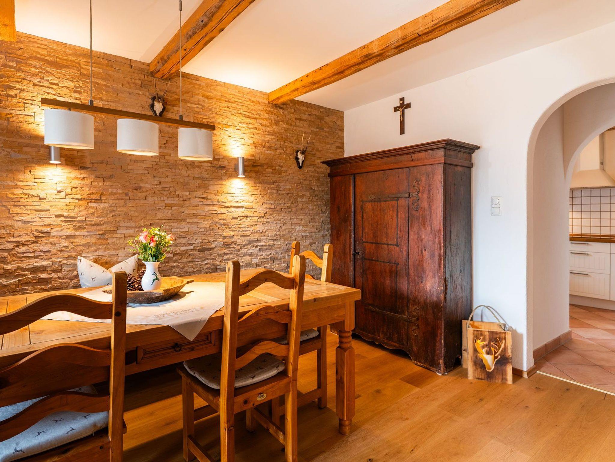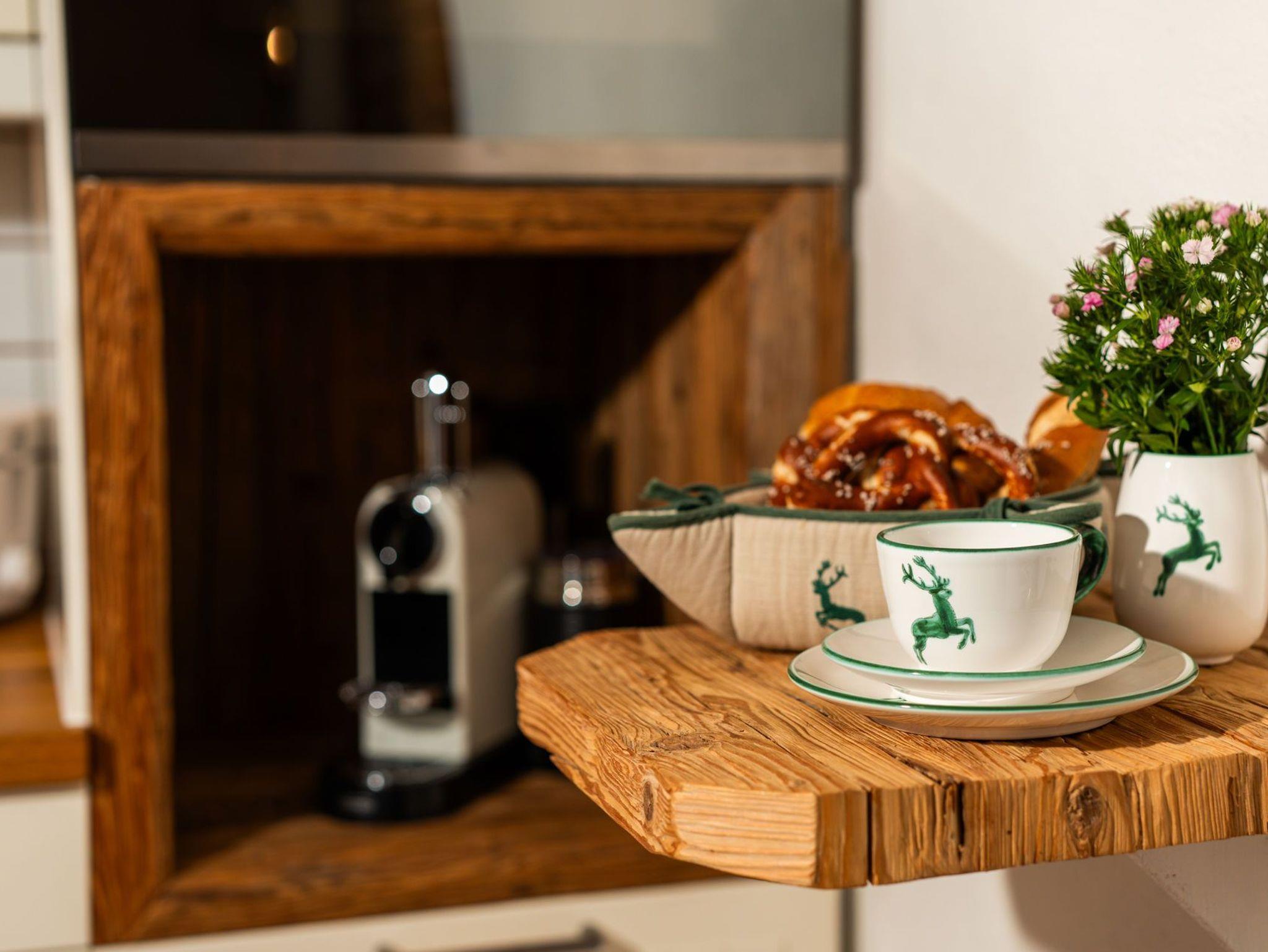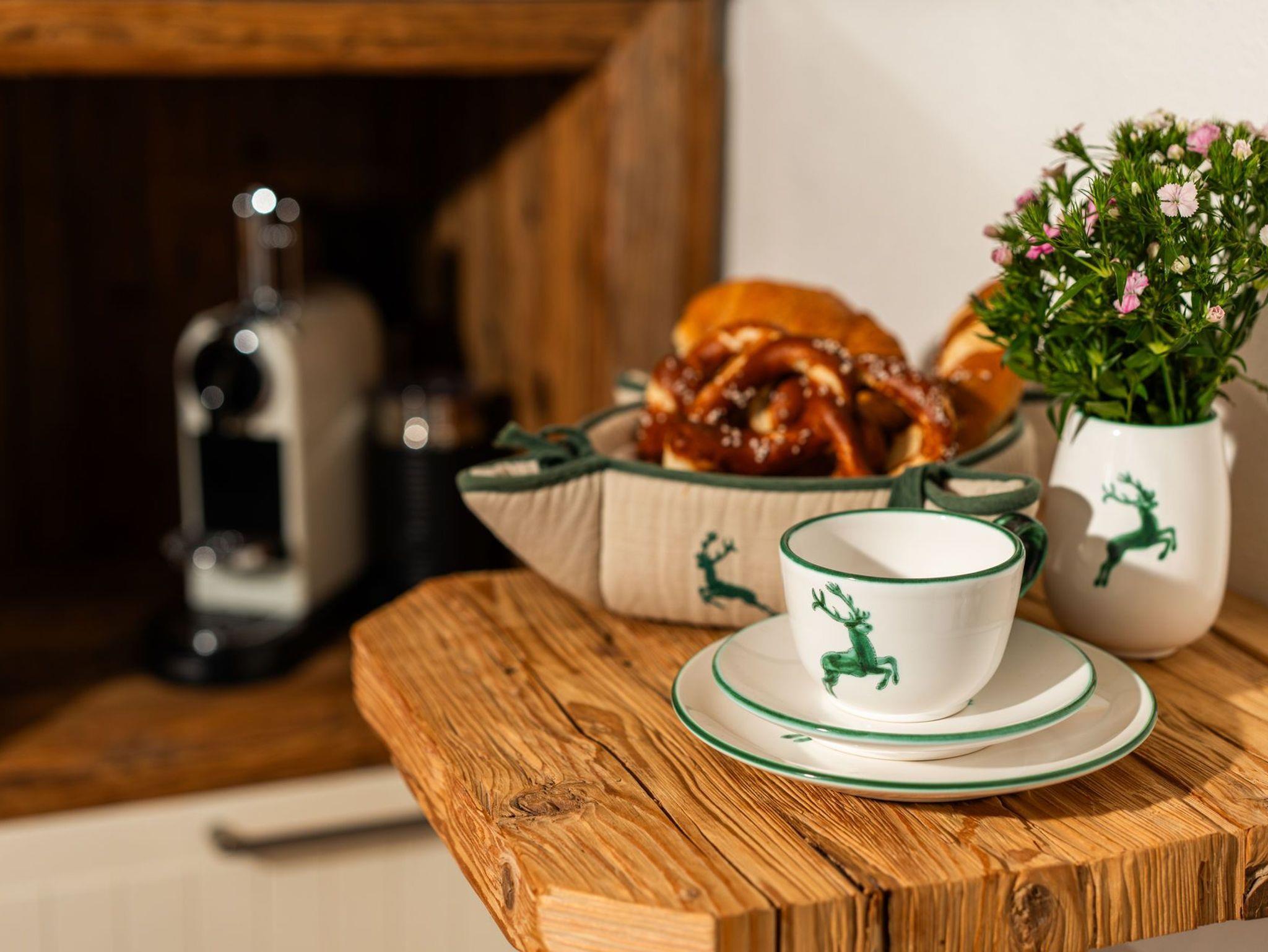 Die gemütliche und laufend renovierte ****Nichtraucherwohnung mit 4 Zimmern, separater Küche, zwei Bädern, extra Gäste-WC und Diele, erstreckt sich über das komplette 1. Obergeschoss des Hauses. Dadurch haben Sie in Ihrer Ferien-Unterkunft keine störenden Nachbarn neben sich. Hochwertig und rustikal aber modern im oberbayerischen Stil ausgebaut, werden Sie sich von Anfang an wie zu Hause fühlen. Hier treffen alte Materialien auf neue Technik. Verkleidungen und Einbauten wurden mit viel Liebe zum Detail aus echtem Altholz gefertigt, die Fußböden sind mit Landhausdielen ausgelegt. Hochwertige Stoffe schaffen eine gemütliche Atmosphäre. Im großzügigen Wohnbereich befindet sich ein holzbefeuerter Kaminofen für die kalten Tage, im daran anschließenden Esszimmer steht ein großer Holztisch für gesellige Stunden. Die voll ausgestattete Küche mit Induktionsherd, Backofen, smartem Side-by-Side Kühlschrank und Spülmaschine lässt keine Wünsche offen. Nespresso- sowie normale Kaffeemaschine, Wasserkocher und Toaster sind dort ebenso selbstverständlich wie ausreichend Geschirr und Besteck. Hier finden Sie auch eine Waschmaschine sowie einen Trockner vor (gegen Gebühr). Beide Badezimmer bieten Ihnen neben Waschtisch mit zusätzlichem Kosmetikspiegel und Haartrockner zeitgemäße Regenduschen. Auf dem überdachten und regengeschützten Balkon befinden sich ausreichend Sitzmöglichkeiten. Gerne können Sie sich aber auch auf der Liegewiese hinter dem Haus mit einem guten Buch entspannen. Liegestühle, Gartenmöbel und ein Außengrill stehen dort zu Ihrer freien Verfügung. Frische Bettwäsche, kuschelige Bademäntel und Handtücher sowie Endreinigung sind im Preis enthalten, ebenso wie die Tegernsee-Card für jeden Gast.