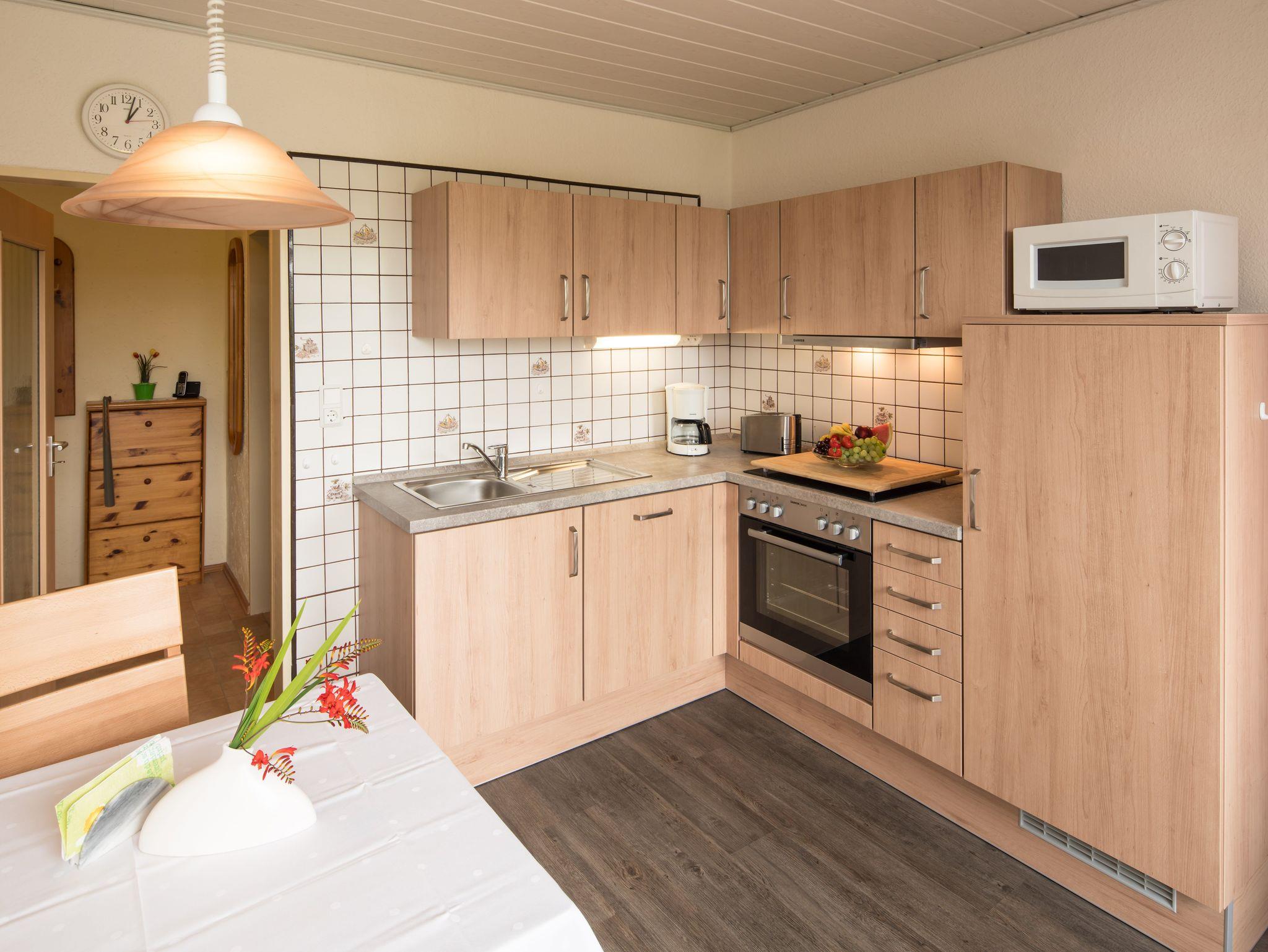 Die Ferienwohnungen Margerite und Tulpe bestehen aus einem Wohn-/Schlafraum und einer komplett eingerichteten Küche mit Sitzecke. In der Küche befindet sich eine Spülmaschine, Mikrowelle, ***Kühl-/Gefrierkombination und ein Herd mit Backofen.