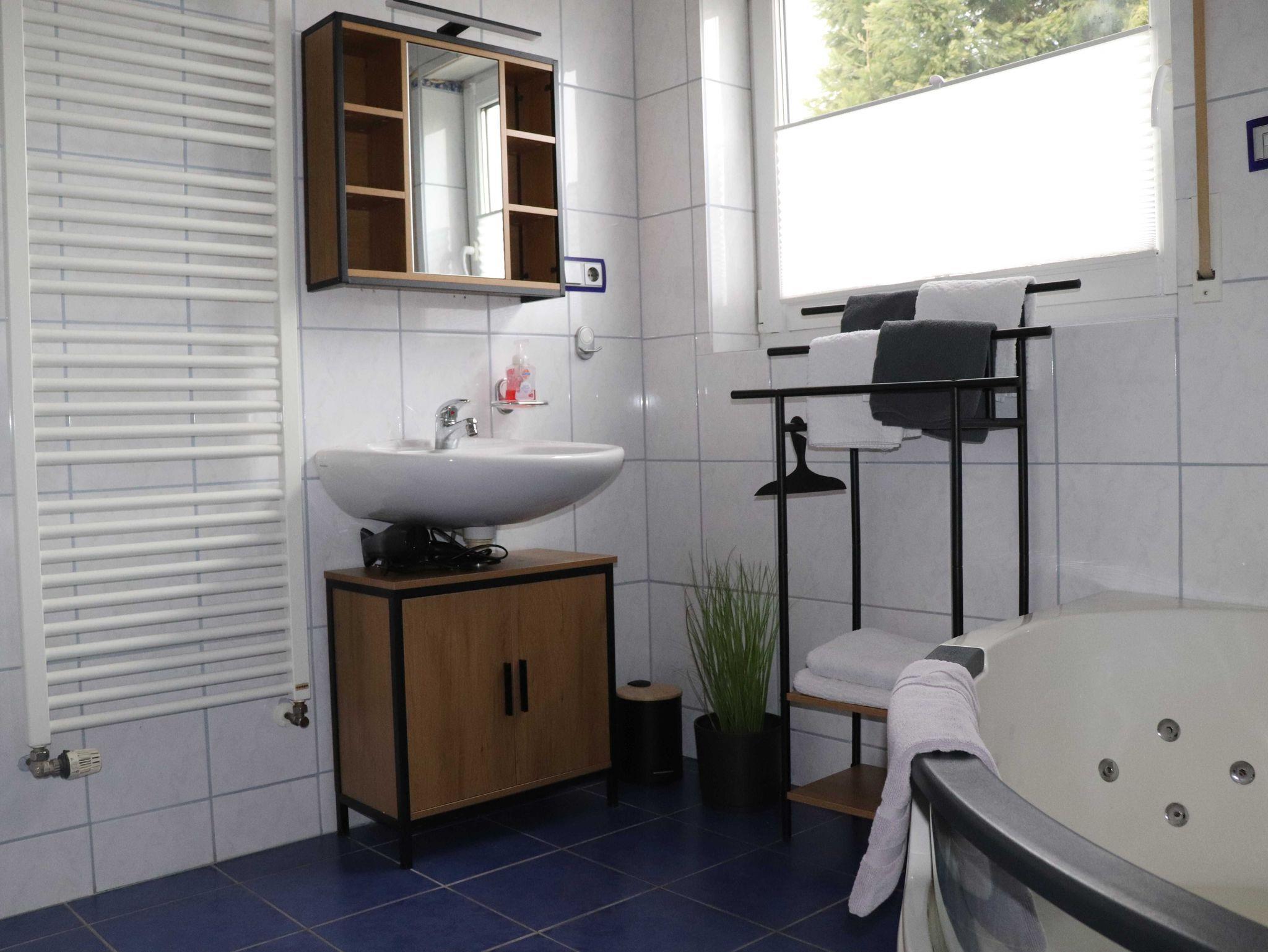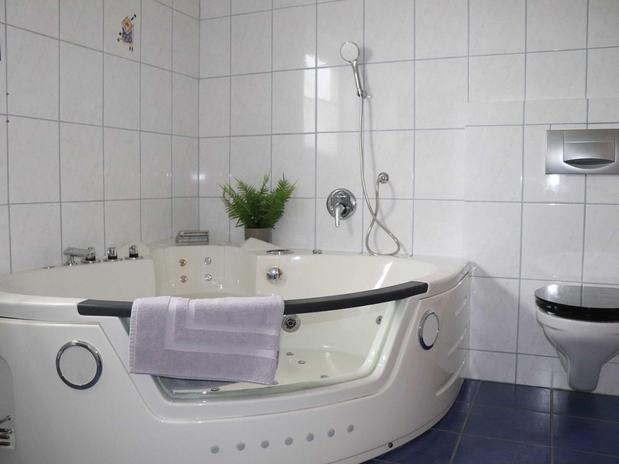 Das helle Bad mit einer Dusche zum Erfrischen ,und eine grossen Badewanne laden zum Verweilen ein.