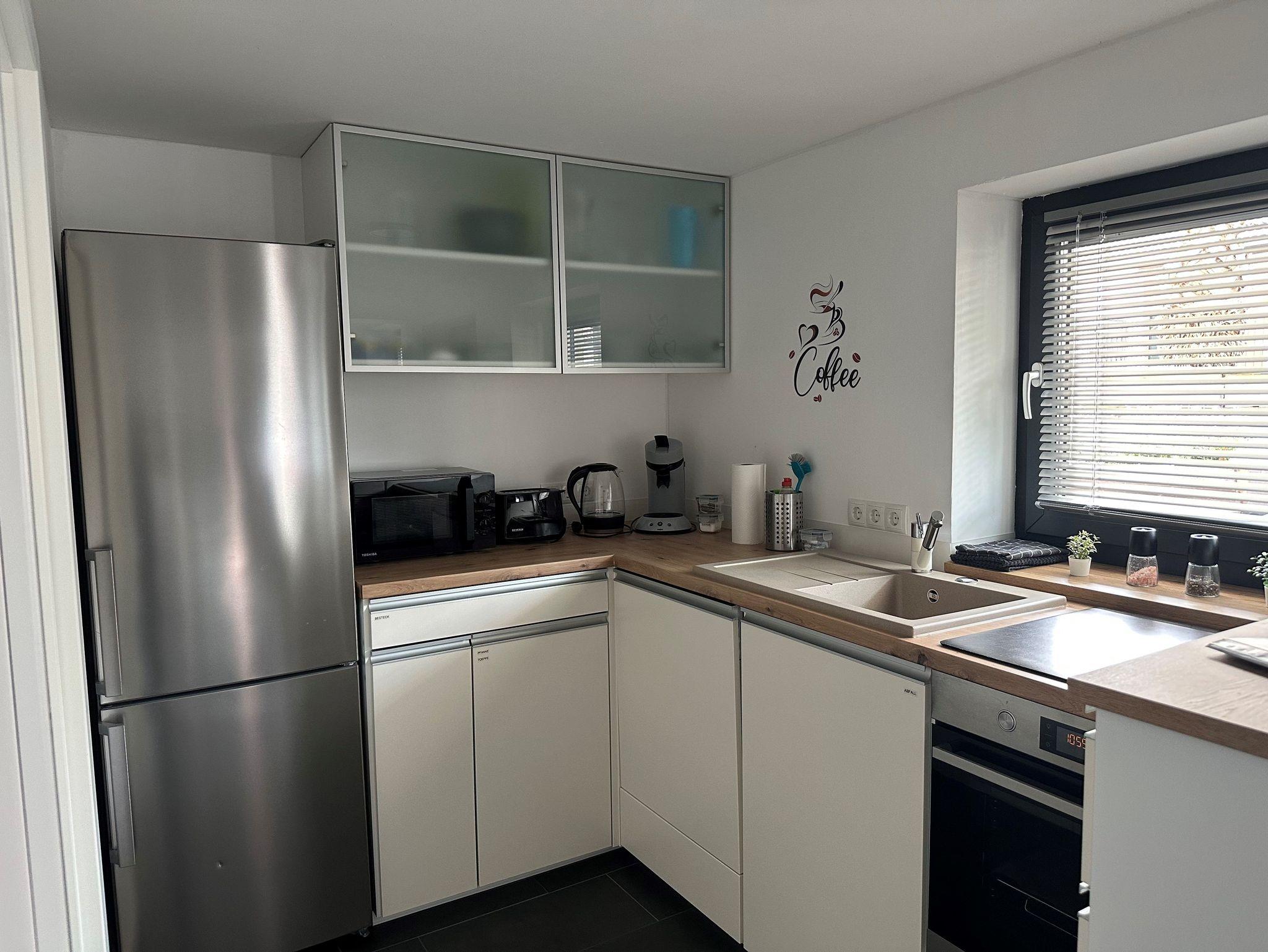 Die Küche ist mit einem großen Kühlschrank inkl. Gefrierfächern, Spülmaschine, Wasserkocher, Toaster, Mikrowelle, einer Senseo Kaffeemaschine sowie einem Backofen mit 4-Zonen-Induktions-Kochfeld ausgestattet. Die komplett mit Geschirr, Pfannen, Töpfen, Schüsseln usw. ausgestattete Küche lädt zum gemütlichen Kochen ein.