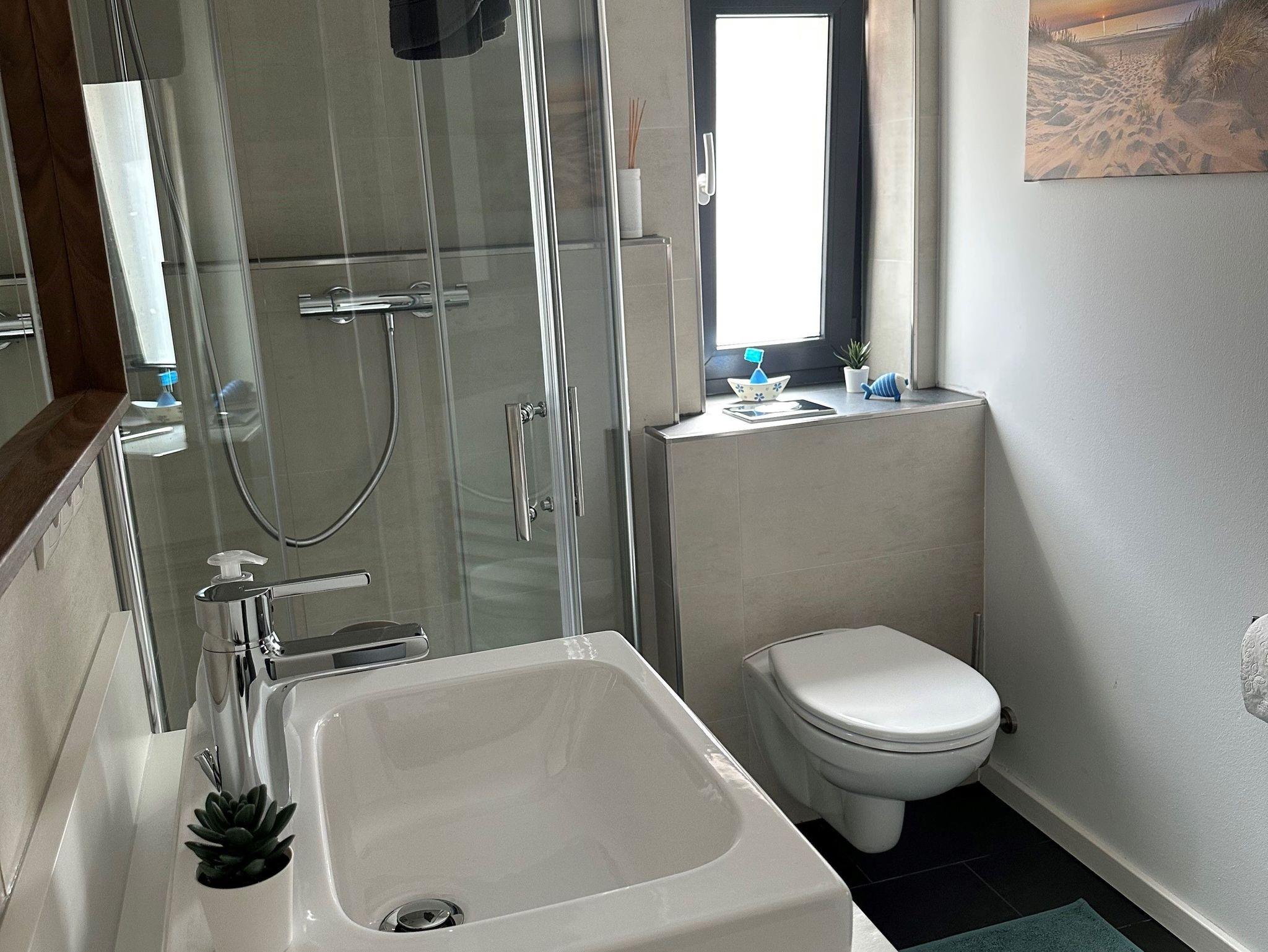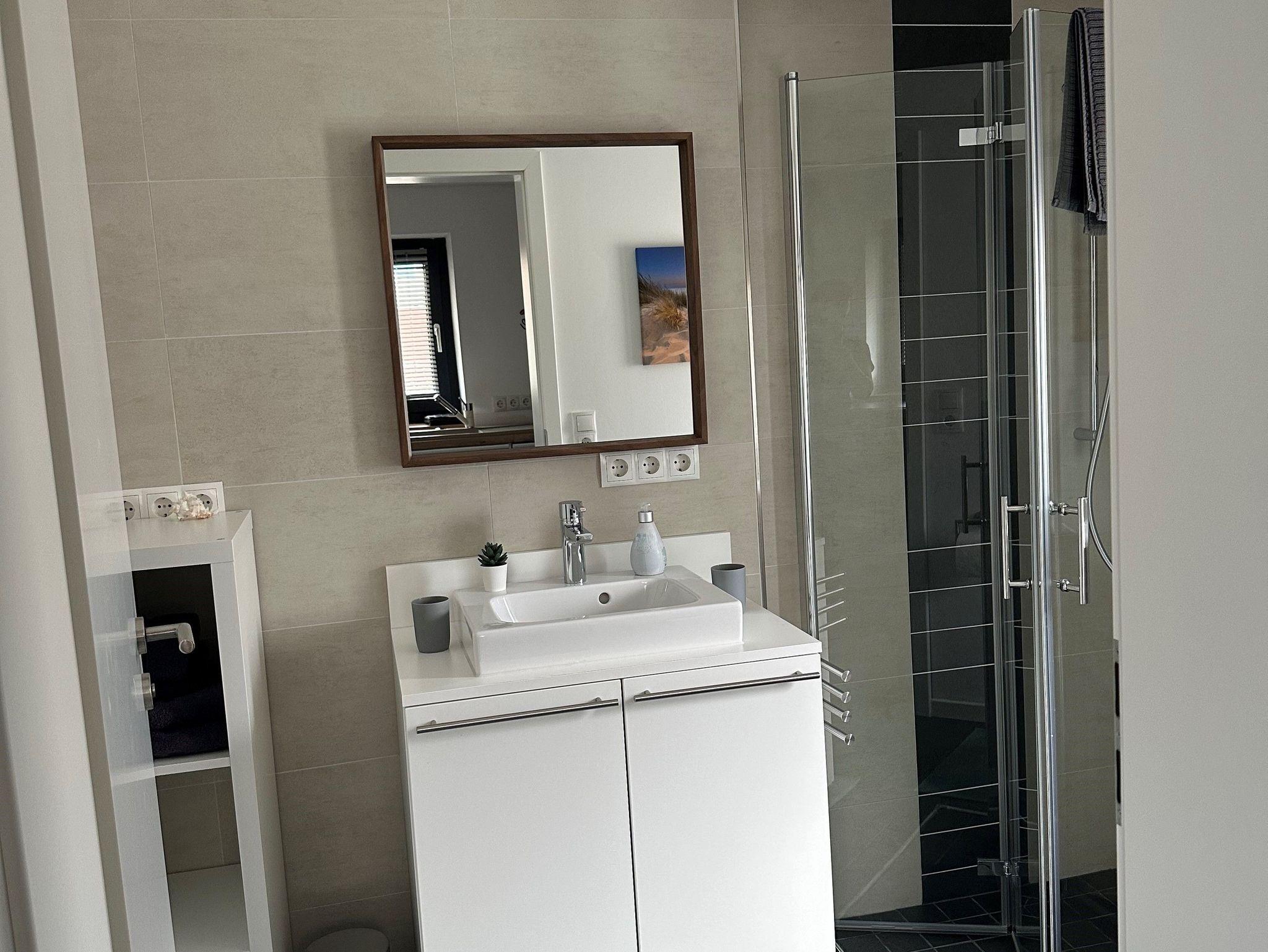 Das Badezimmer verfügt über eine begehbare Dusche, ein Waschbecken mit Spiegel, einen Haarfön, ein WC und ein Regal zur Aufbewahrung Ihrer persönlichen Sachen. Ebenso steht ein Wäscheständer zum Trocknen Ihrer Badekleidung nach dem eventuellen Besuch der Therme zur Verfügung.