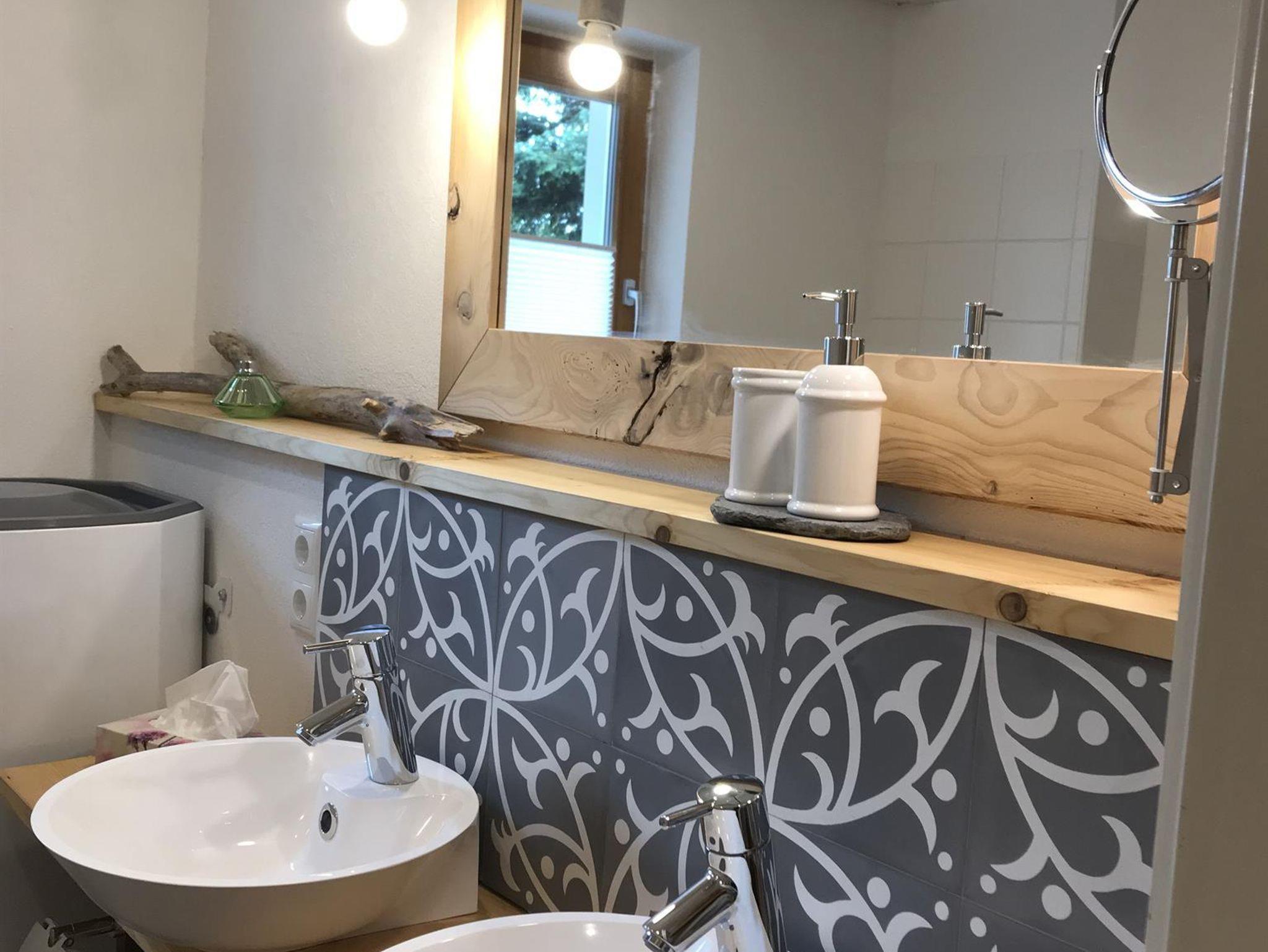 • Bad mit zwei Waschbecken, Regendusche, WC, Waschmaschine, Föhn und Handtücher