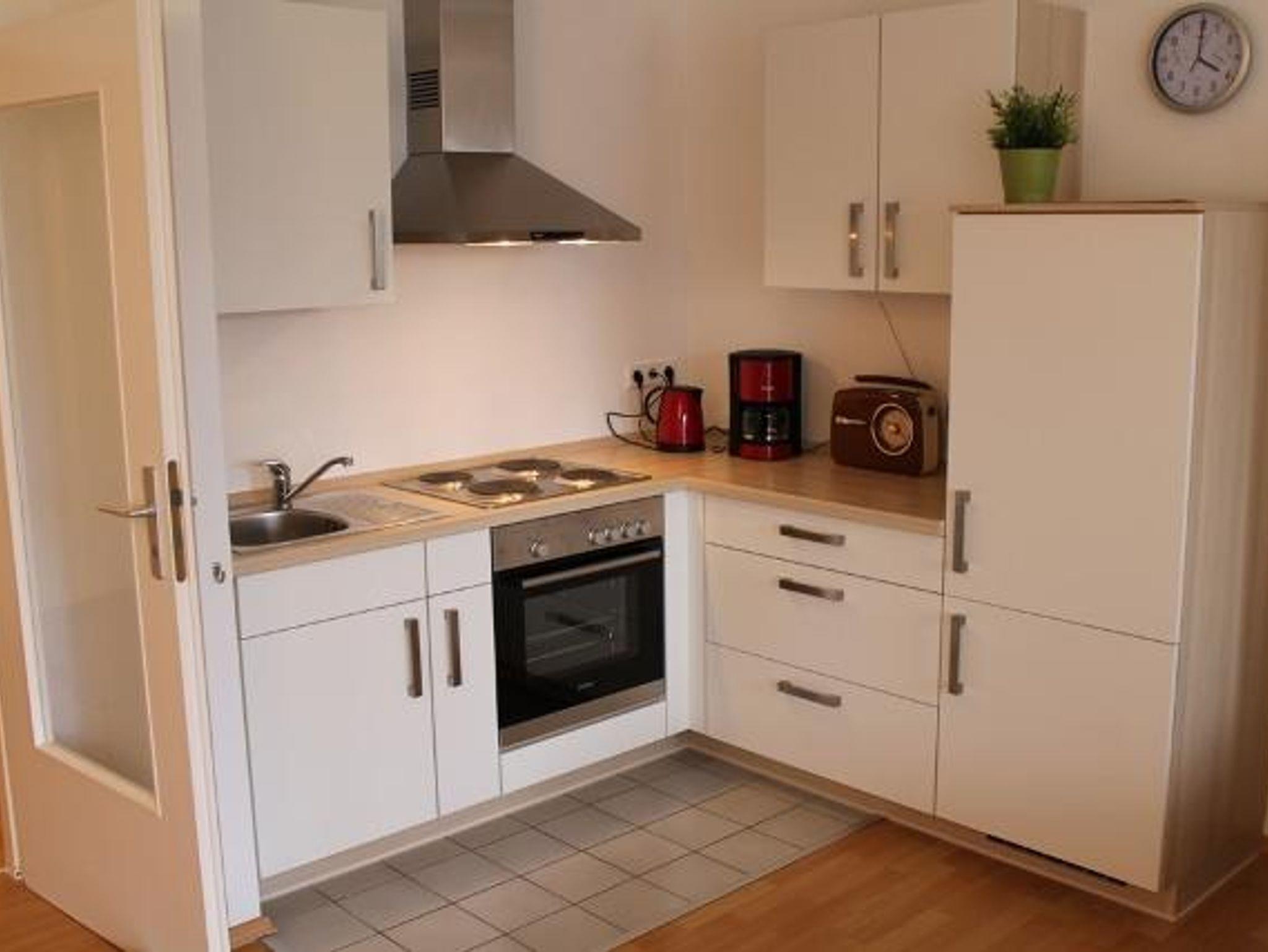 Das Appartement vereint Wohnen, Essen, Kochen und Schlafen in harmonischer Weise. Die Küche verfügt über einen Hochkühlschrank mit Gefrierfach, Herd, Backofen, Wasserkocher, Kaffeemaschine und Toaster. Das Doppelbett, 200 x 180, hat getrennte Matratzen.