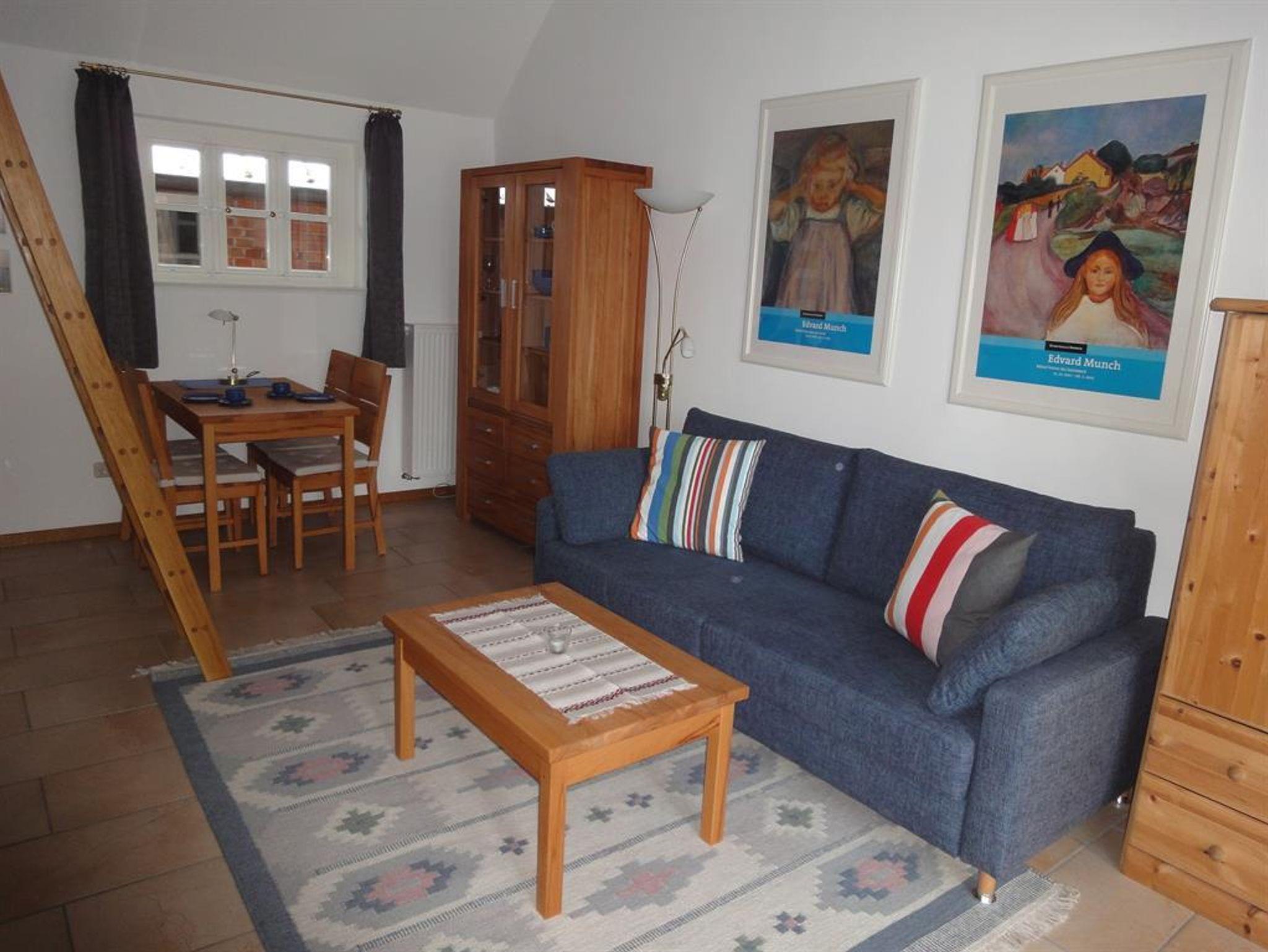 Unsere Einraum-Ferienwohnung ist ebenerdig und ca. 30qm groß. Im Wohnraum befinden sich Küche und Essplatz, das Sofa, verwandelt sich für die Nacht in ein großes Bett(2X2m), der Fernseher (Sat:) versteckt sich im Bauernschrank. Über eine Leiter klettert man auf die Galerie, die zusätzliche Schlafmöglichkeit bietet. Das Badezimmer ist mit Dusche und WC ausgestattet. Zur Wohnung gehören eine Terasse mit Gartenmöbeln und ein Autostellplatz.