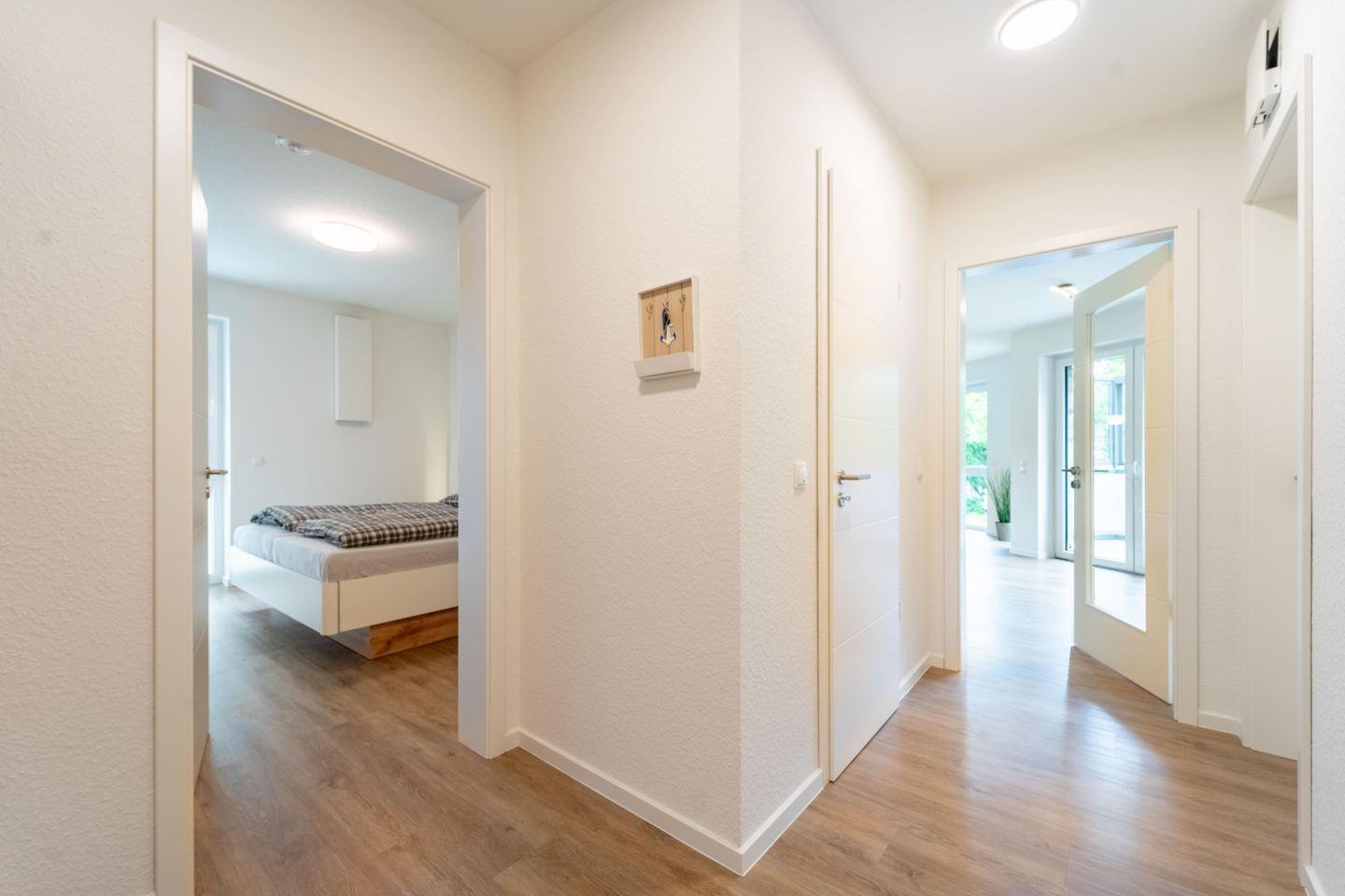 Die Ferienwohnung „Weißer Weg“ bietet auf 81 qm modernen Komfort und viel Platz für bis zu vier Personen. Der offene Wohnbereich mit großer Fensterfront und Zugang zum Balkon ist hell und freundlich gestaltet. Hier befinden sich eine gut ausgestattete Küche mit Ofen, Geschirrspüler, Herd, Kühlschrank und Gefrierschrank, ein Essbereich und ein gemütliches Wohnzimmer mit großem Smart TV. Die Wohnung verfügt über zwei Schlafzimmer – eines mit einem komfortablen Doppelbett und das andere mit zwei Einzelbetten – sowie ein modernes Badezimmer mit bodengleicher Dusche.