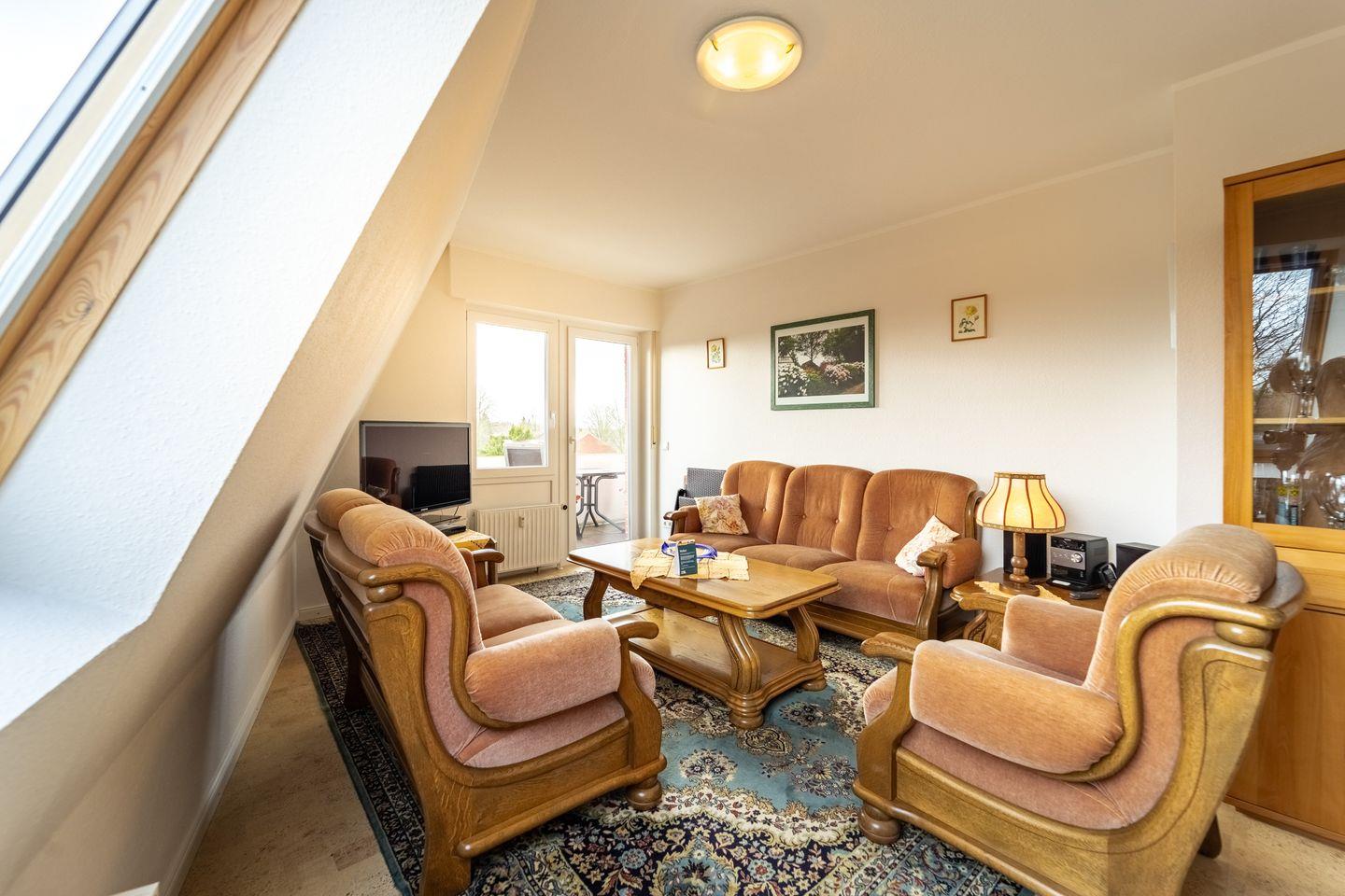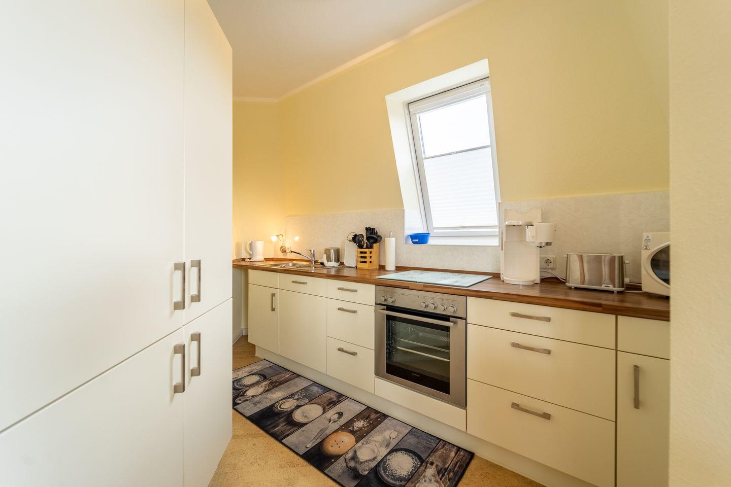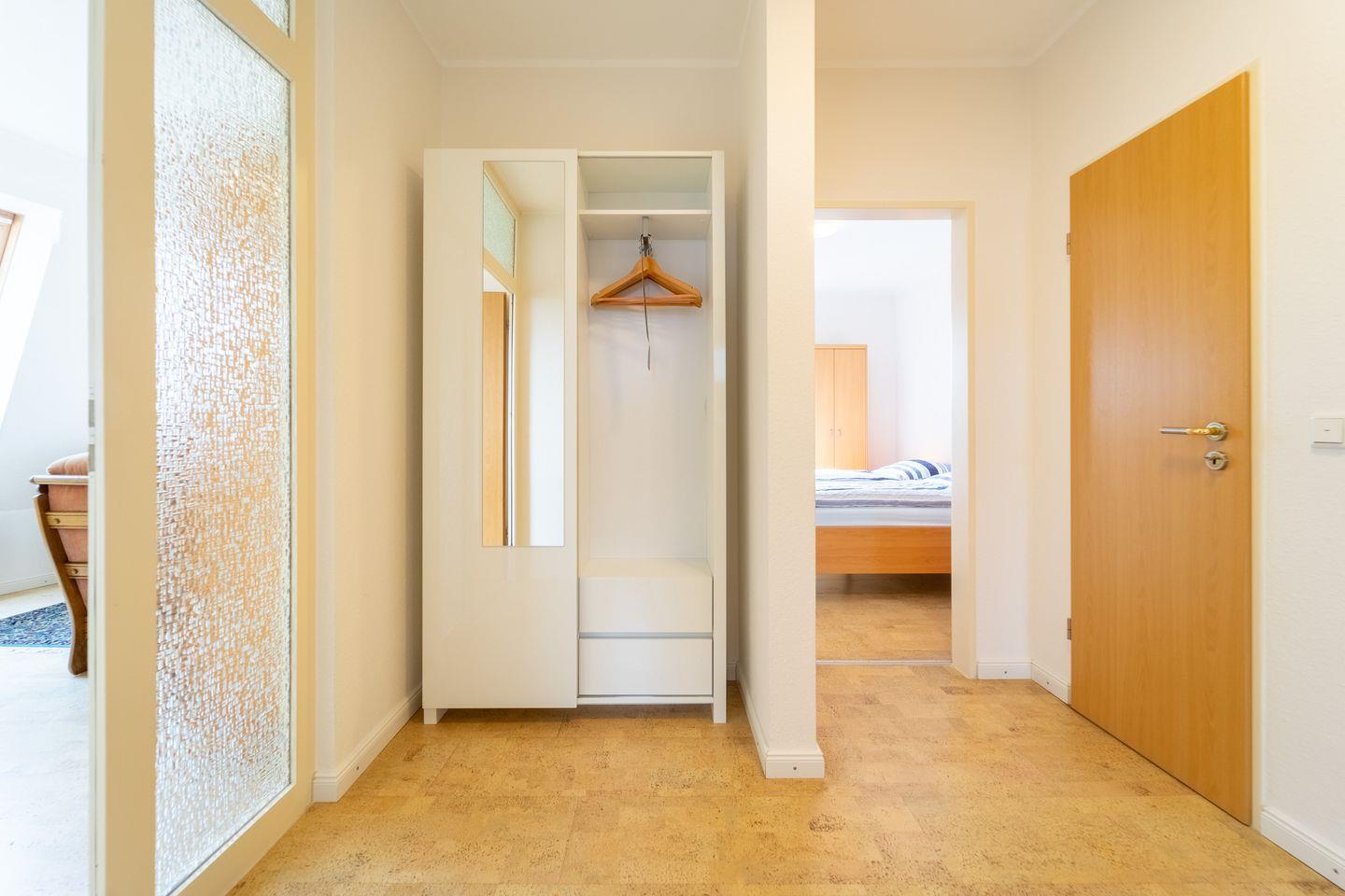 Die Wohnung ist für bis zu drei Personen geeignet und verfügt über zwei separate Schlafzimmer – eines mit Doppelbett, das andere mit Einzelbett. Der offene Wohn- und Essbereich mit einer voll ausgestatteten Küche schafft eine einladende Atmosphäre für gemeinsame Stunden. Das Badezimmer ist modern gestaltet und mit einer bodengleichen Dusche ausgestattet, die besonders komfortabel und auch für Senioren angenehm zu nutzen ist.