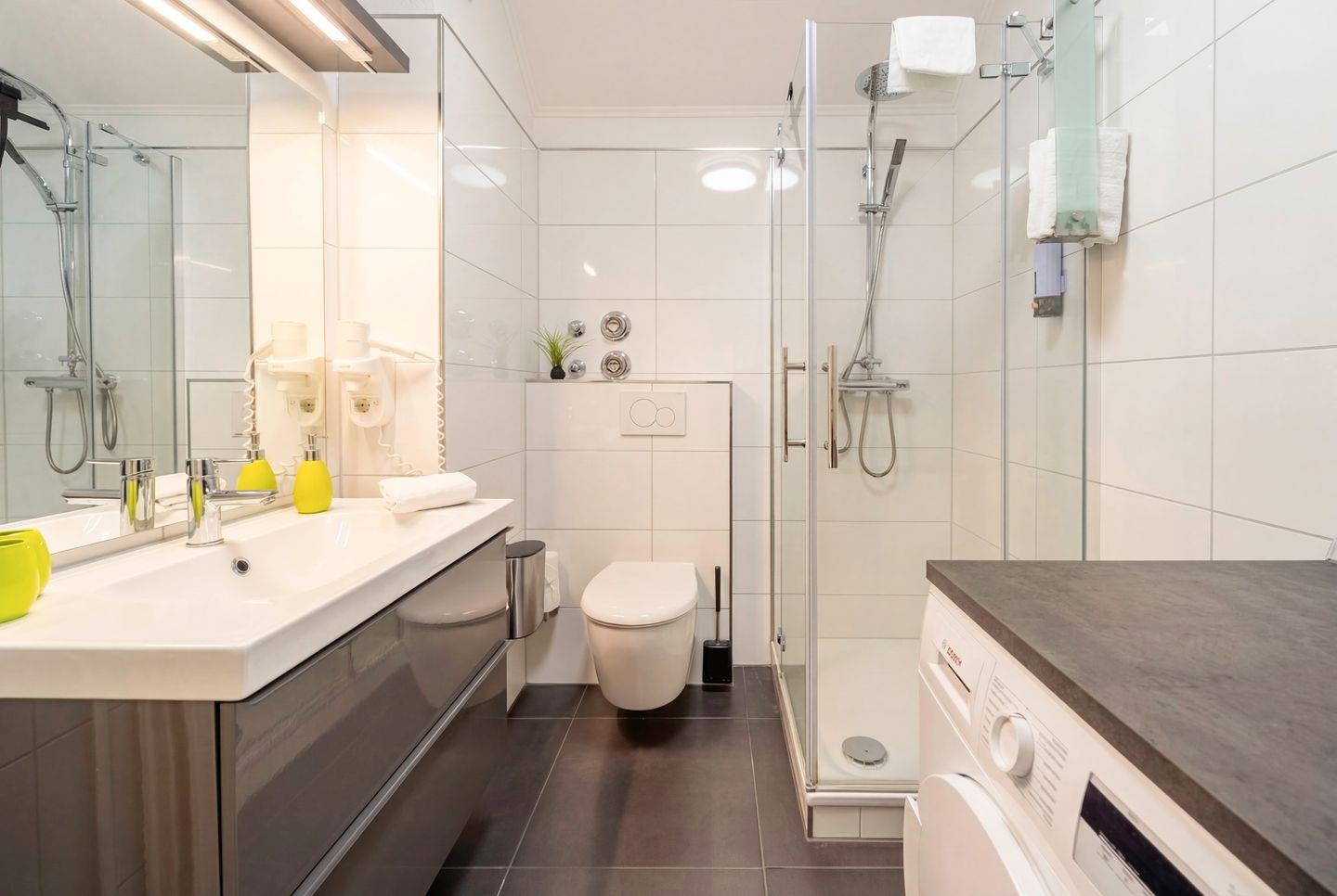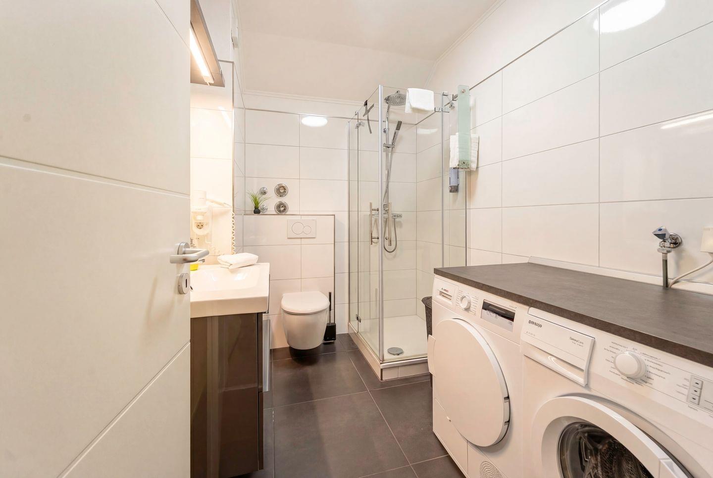 Das Schlafzimmer ist gemütlich eingerichtet und verfügt über ein komfortables Doppelbett. Badezimmer und Küche entsprechen dem Standard größerer Einheiten: modern, gepflegt und sehr gut ausgestattet. Eine Waschmaschine und ein eigener Trockner stehen ebenfalls zur Verfügung.