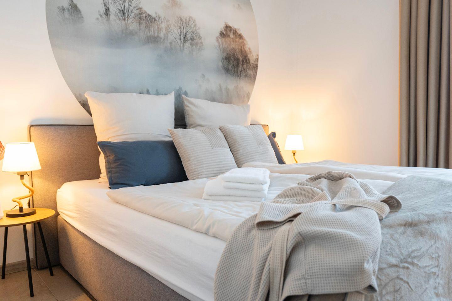 Du kannst deinen Tag mit leckerem Kaffee beginnen und all die schönen Annehmlichkeiten dieses Apartments genießen, inklusive der großen Terrasse mit exklusivem Seeblick, großzügigem Sitzbereichen für 4 Personen, einem Grill und einer Sauna auf der Anlage sowie einer tollen Aussicht in die Natur.