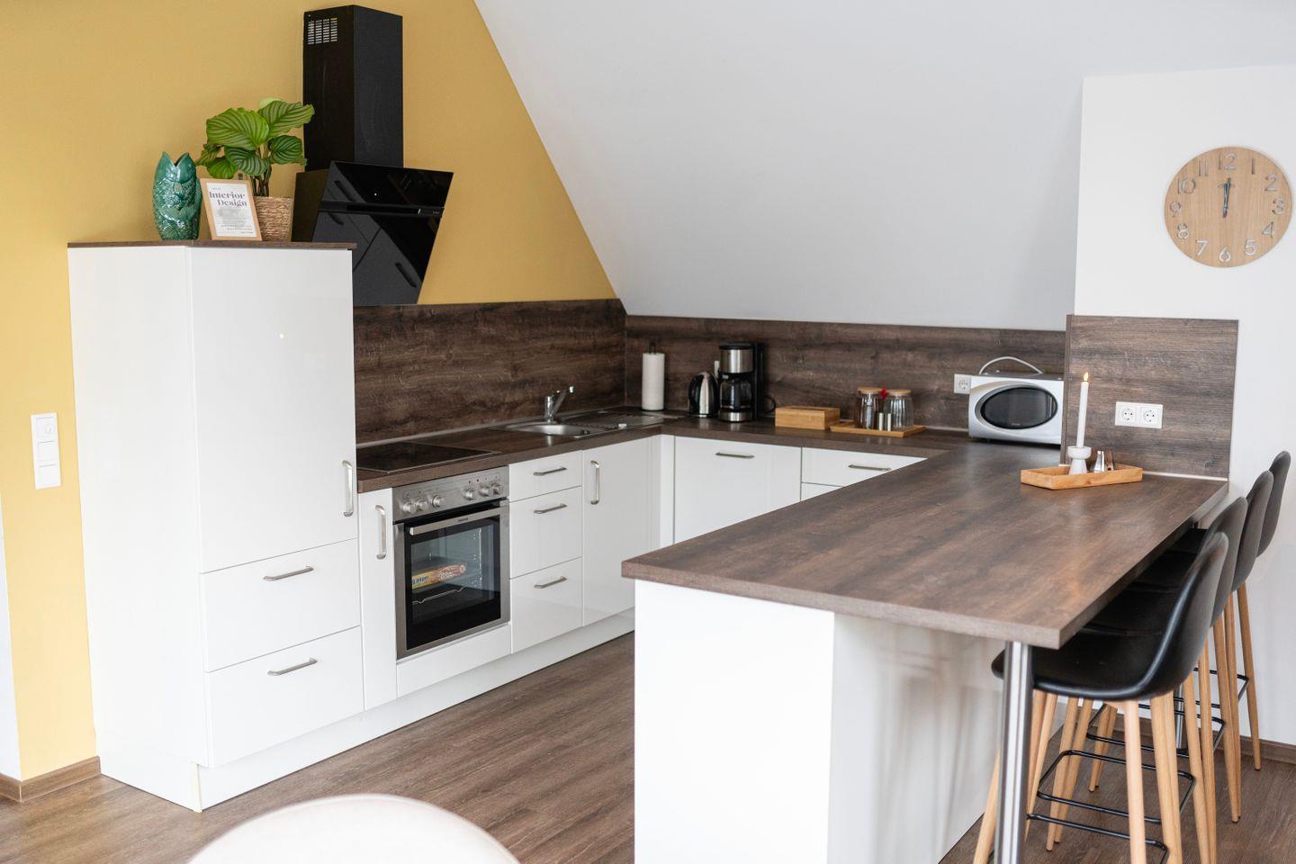 Die Küche ist voll ausgestattet mit Herd, Kühlschrank, Backofen, Spülmaschine, Mikrowelle und allem, was Du zum Kochen brauchst. Zusätzlich steht eine Waschmaschine zur Verfügung.