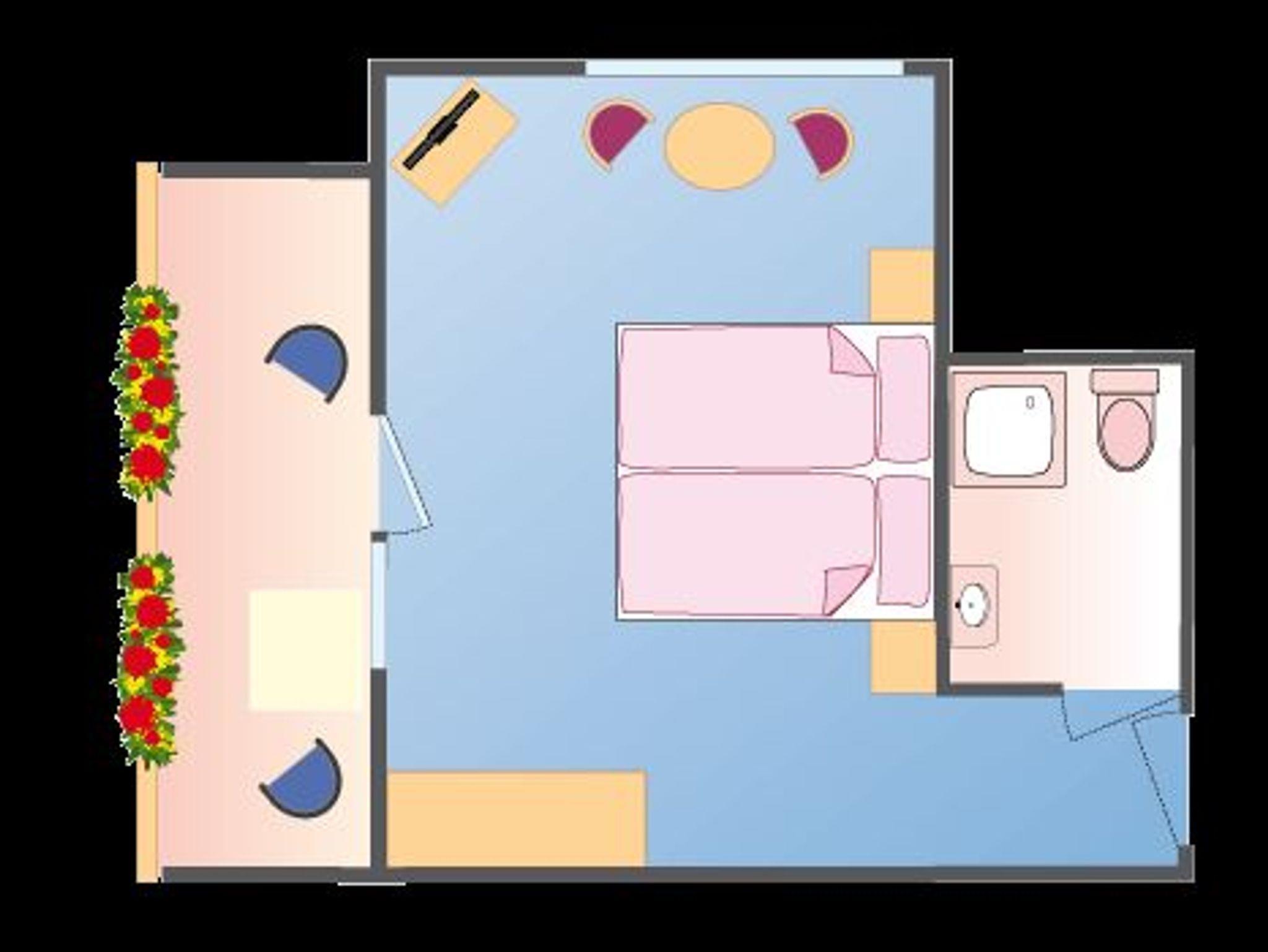 Doppelzimmer mit Balkon liegt zur Ostseite und hat eine Größe von 22qm. Zur Ausstattung gehören ein Badezimmer mit Dusche oder Badewanne, Föhn, Kabel-TV, Minibar und einen Safe.