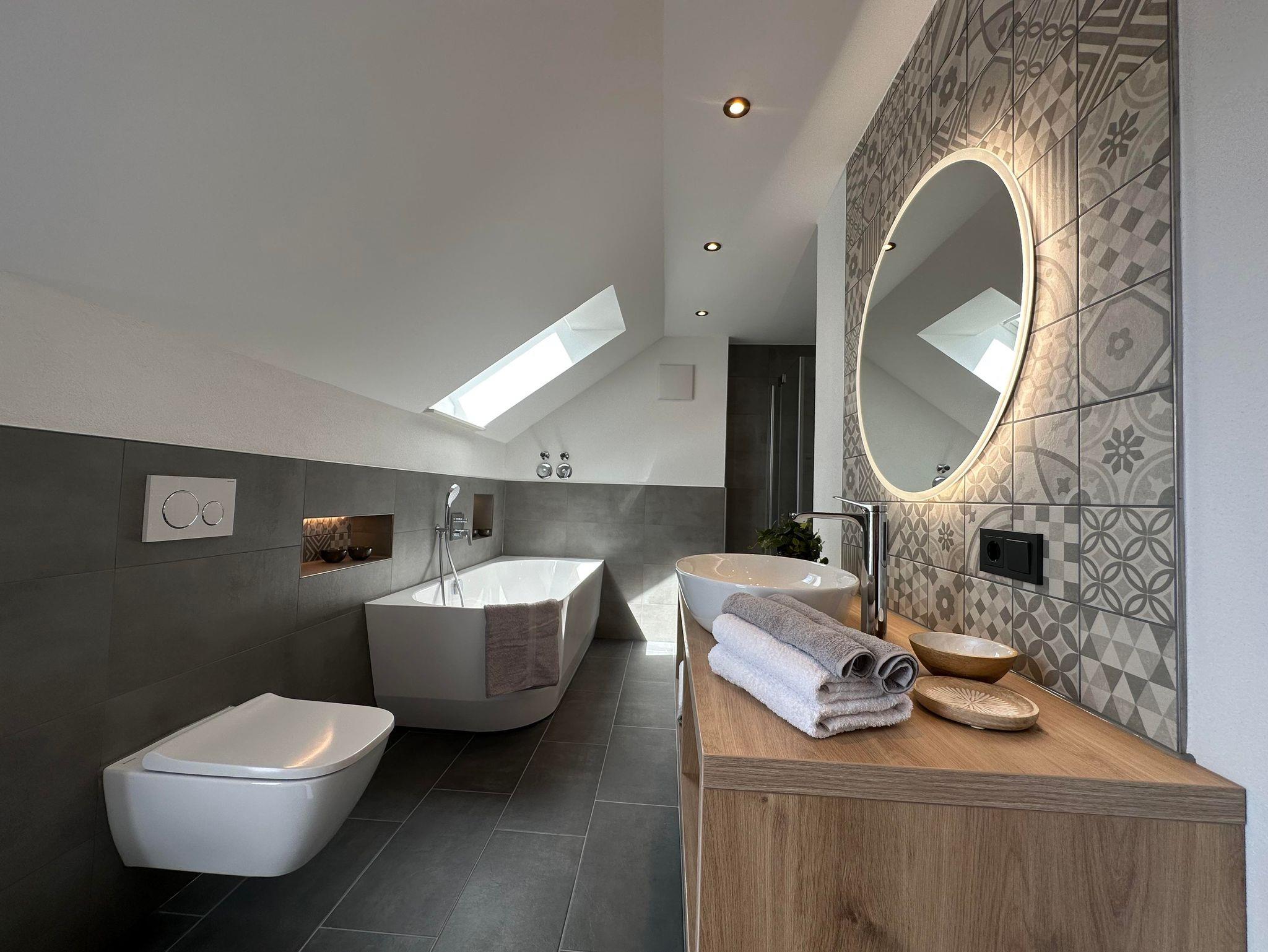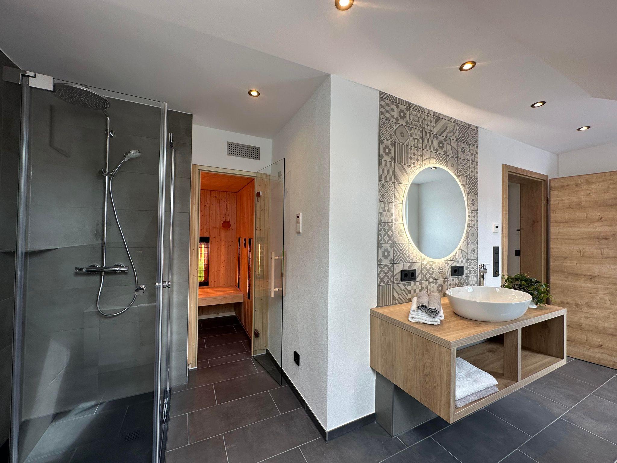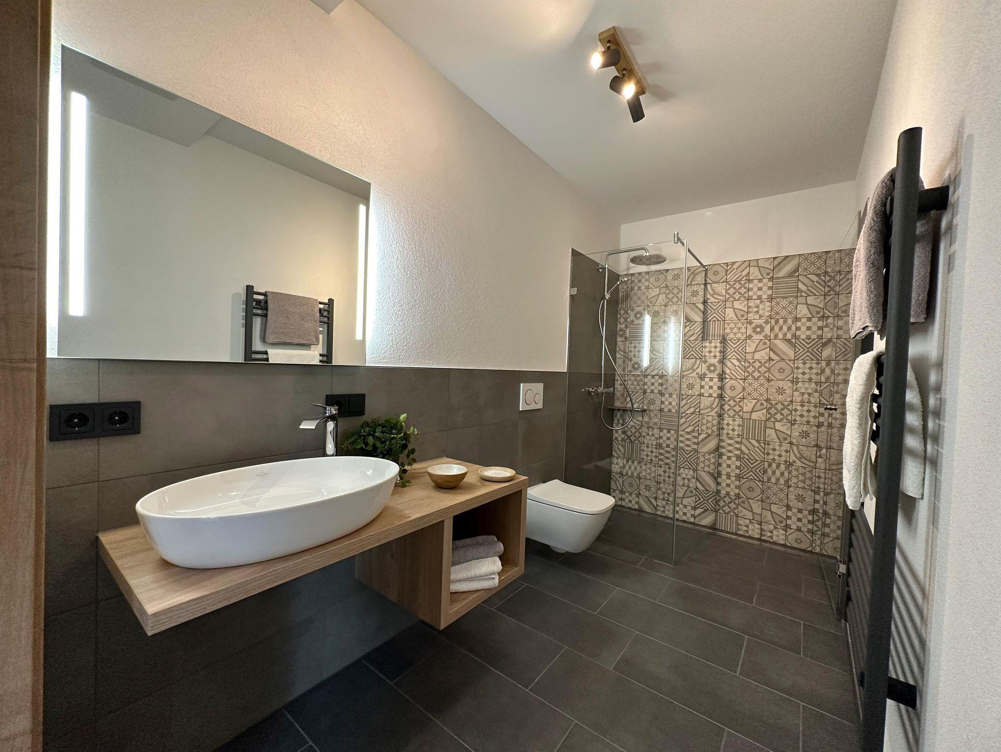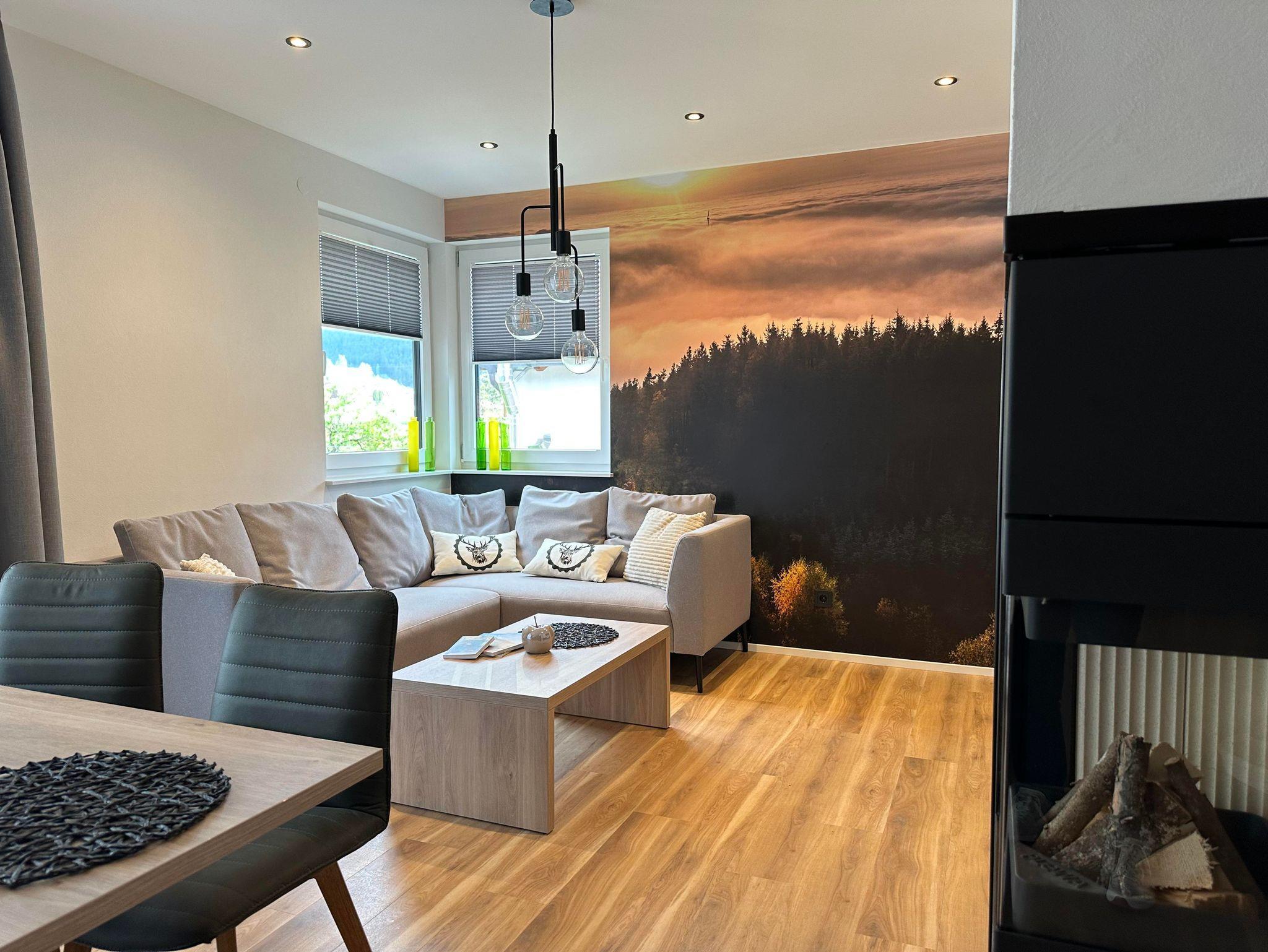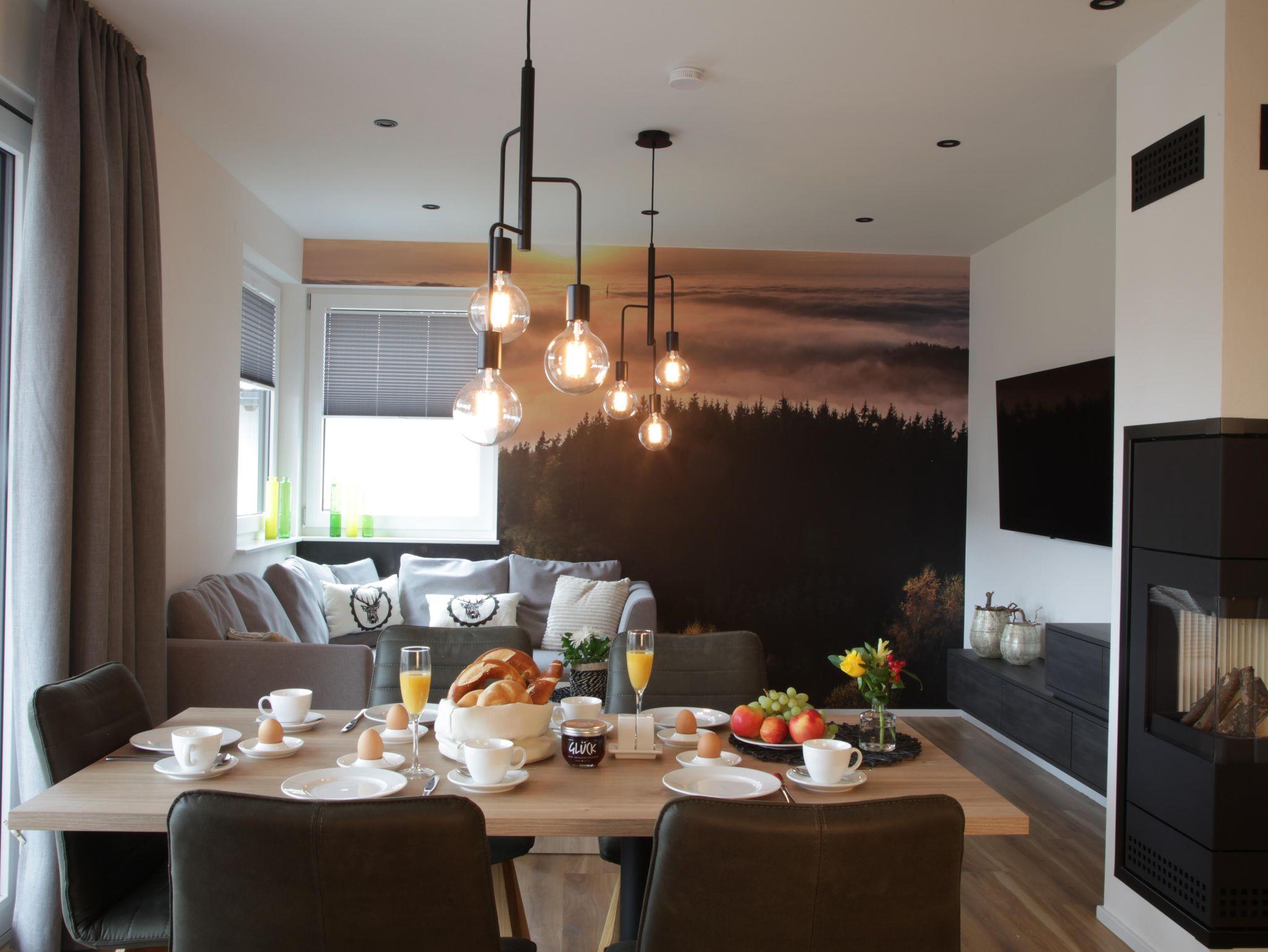 Die 123 m² große Fewo mit Fußbodenheizung ist modern und mit Wohlfühlcharakter eingerichtet. Das EG ist barrierefrei und besteht aus einem Wohn-Esszimmer mit Kaminofen, einer komplett ausgestatteten Küche, einem Bad und einem Schlafzimmer mit einem Doppelbett 180x200 cm mit TV. Ein Einzelzimmer, ein Schlafzimmer mit einem Bett 160x200 cm mit TV und ein Bad mit Infrarotkabine befinden sich im DG.