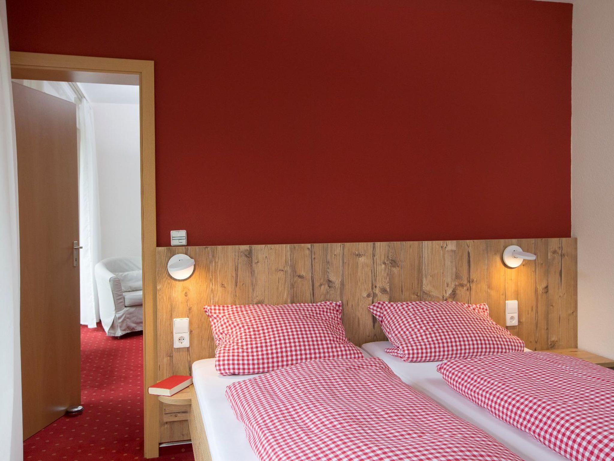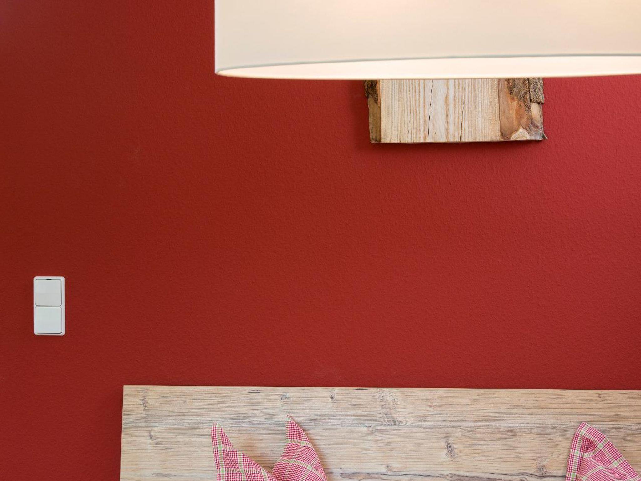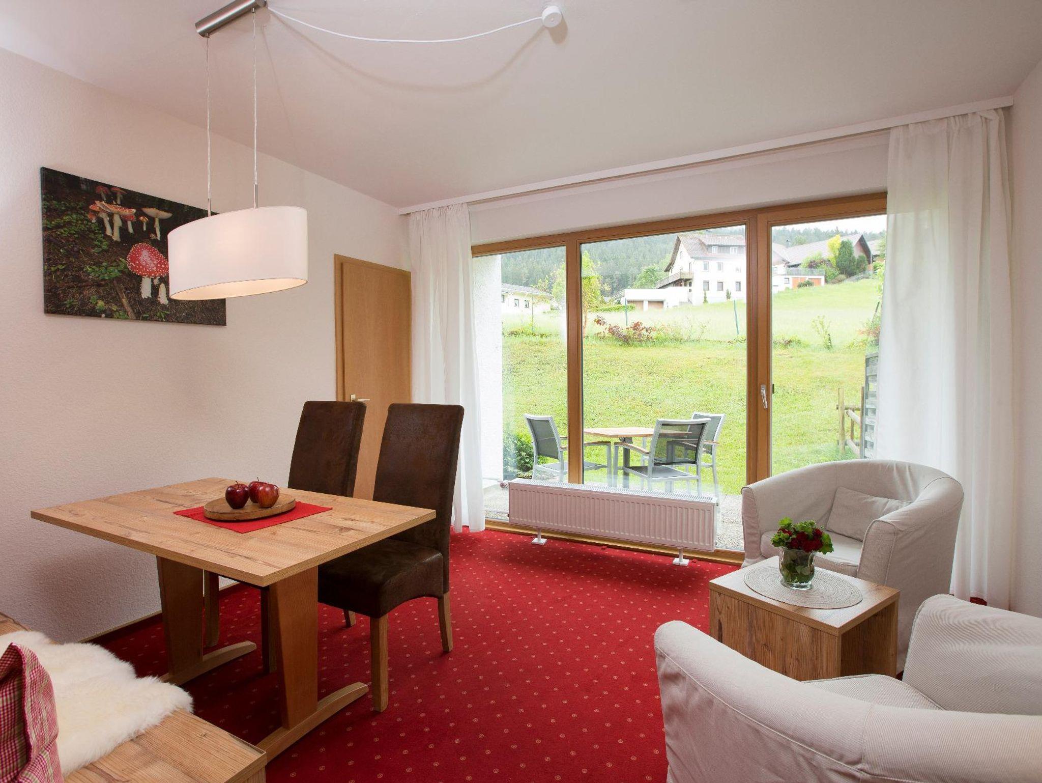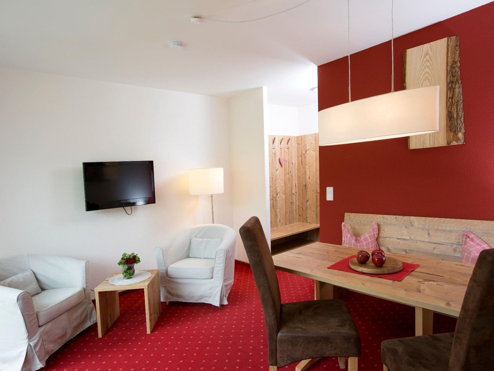 Grün sind die tiefen Wälder, rot die Wände in der neu eingerichteten, modernen Ferienwohnung. Wer sagt, dass die schönsten Urlaubsfotos nur draußen gemacht werden sollen? Wohnung mit getrennten Wohn/Schlafzimmer, kleiner Küche, Bad mit Dusche/WC, Terrasse.