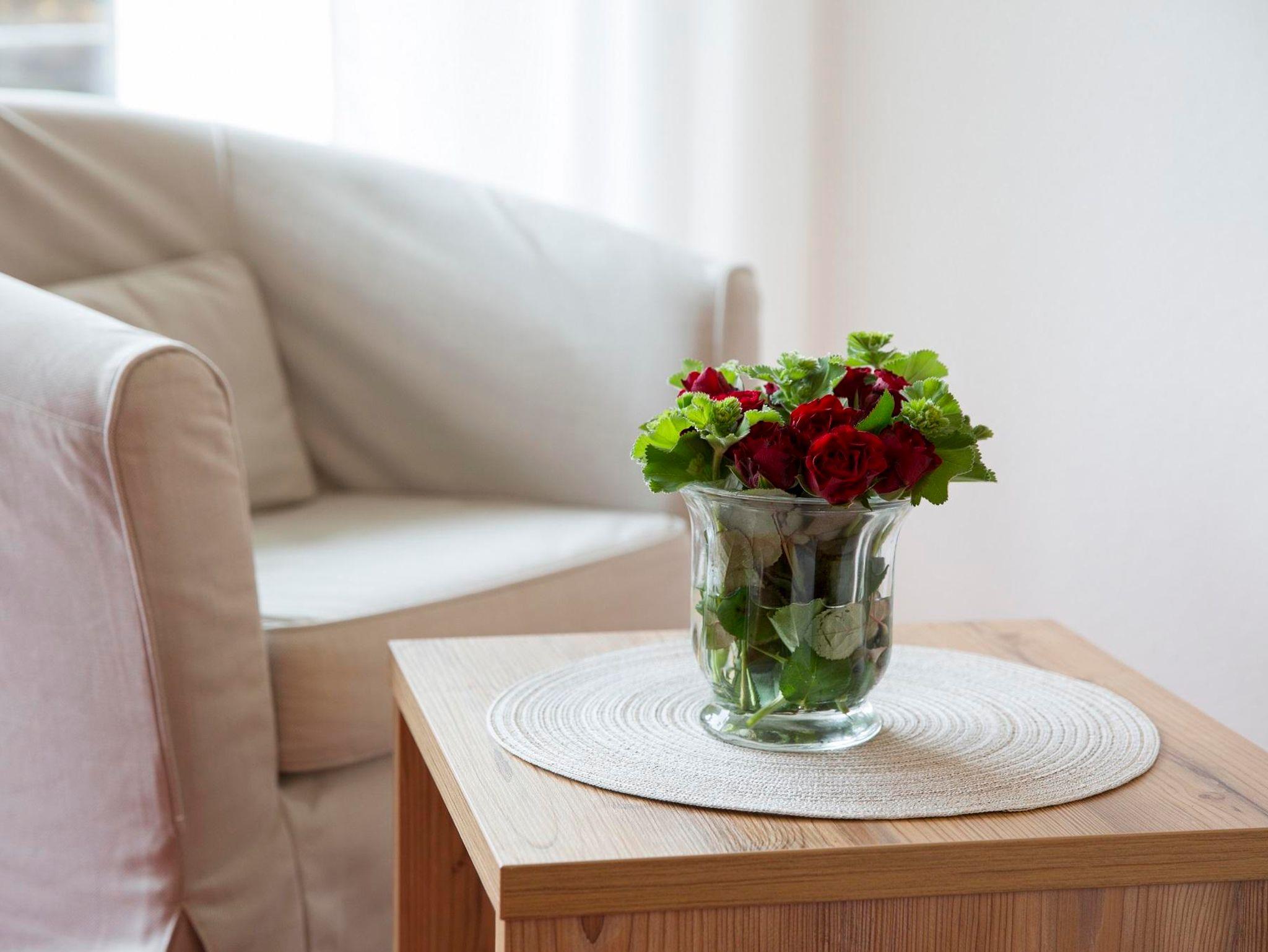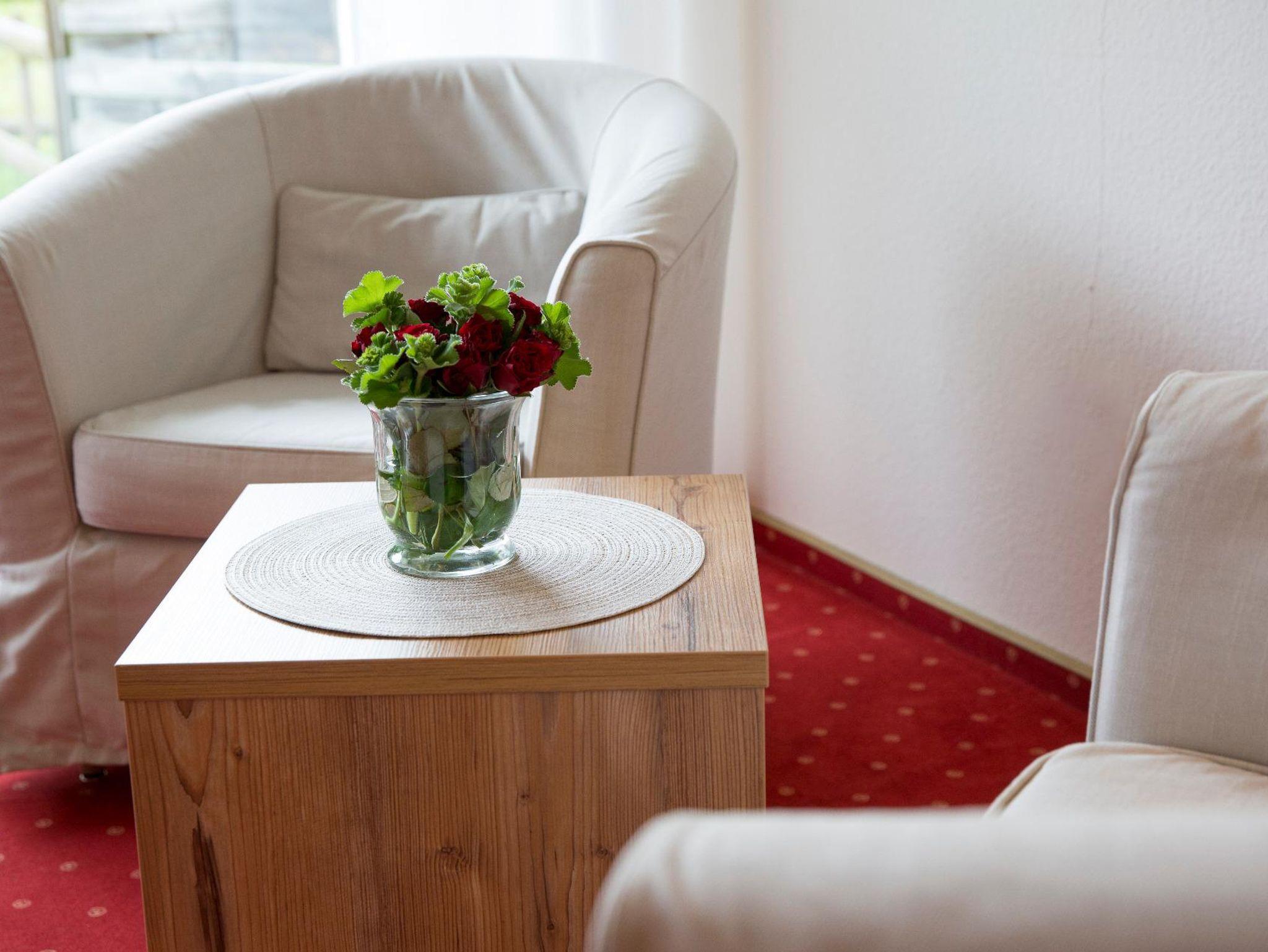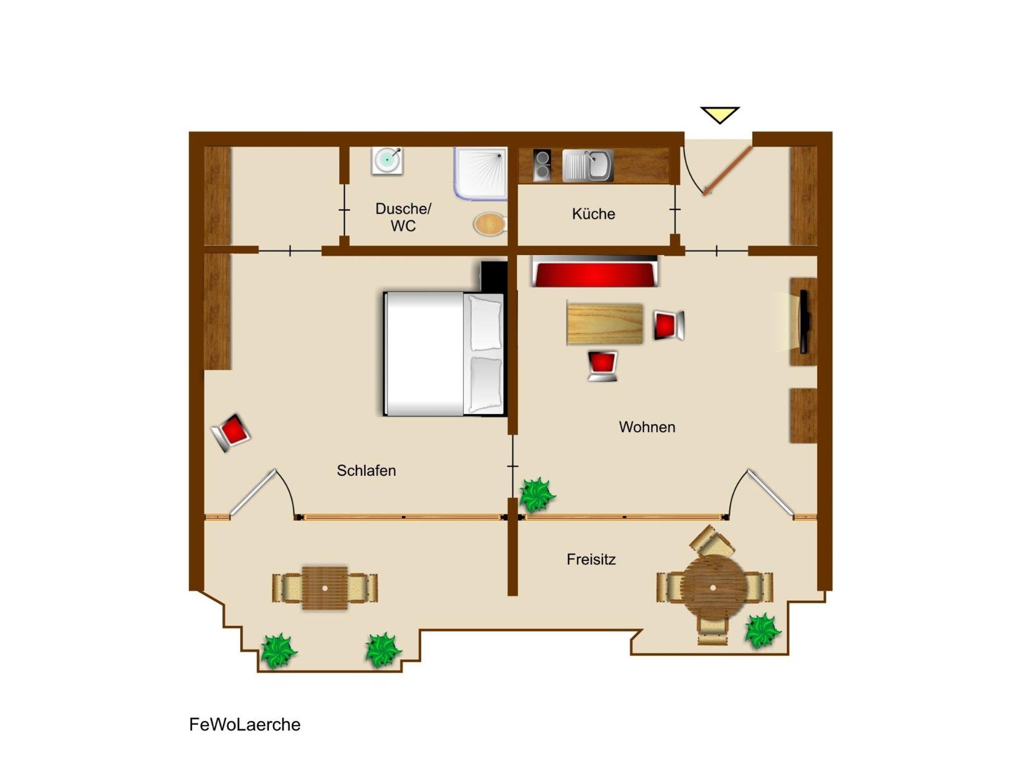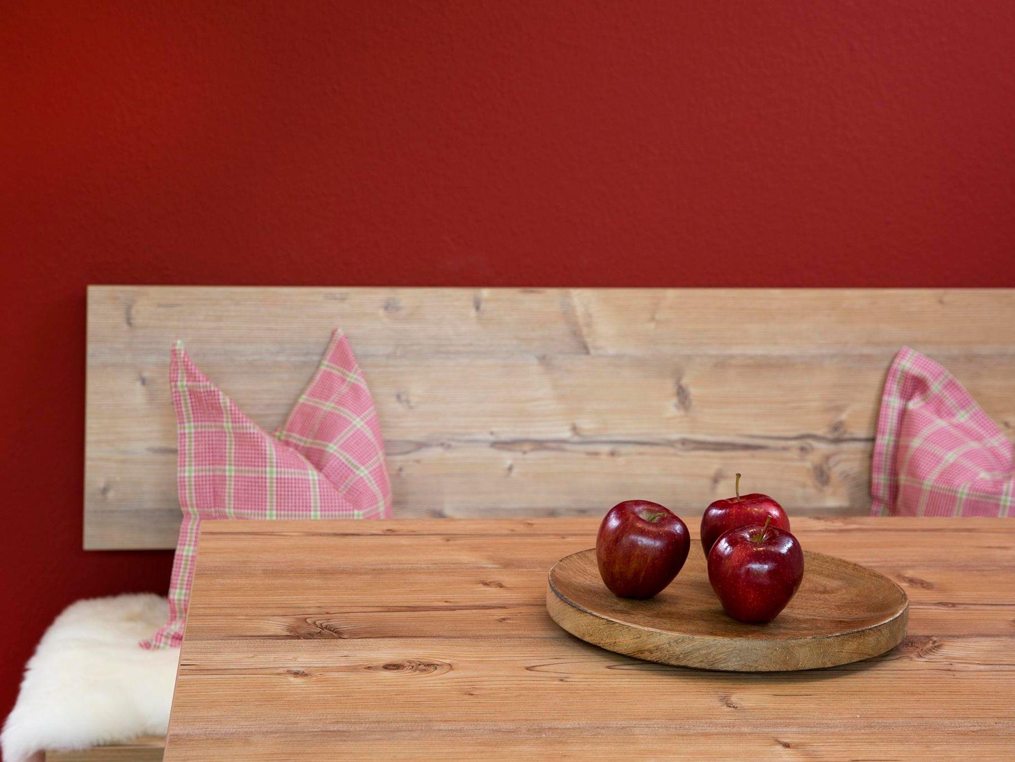 Grün sind die tiefen Wälder, rot die Wände in der neu eingerichteten, modernen Ferienwohnung. Wer sagt, dass die schönsten Urlaubsfotos nur draußen gemacht werden sollen? Wohnung mit getrennten Wohn/Schlafzimmer, kleiner Küche, Bad mit Dusche/WC, Terrasse.