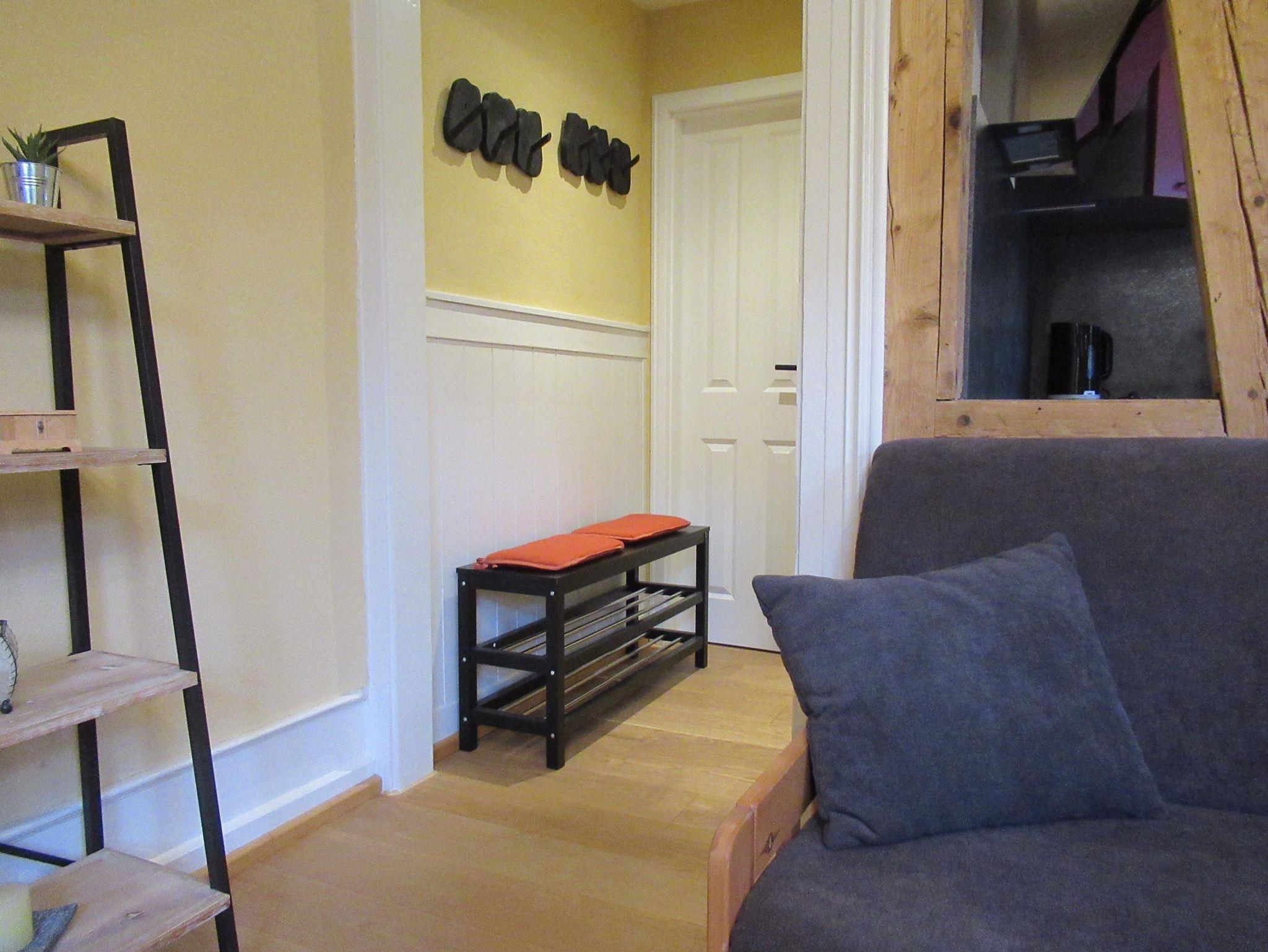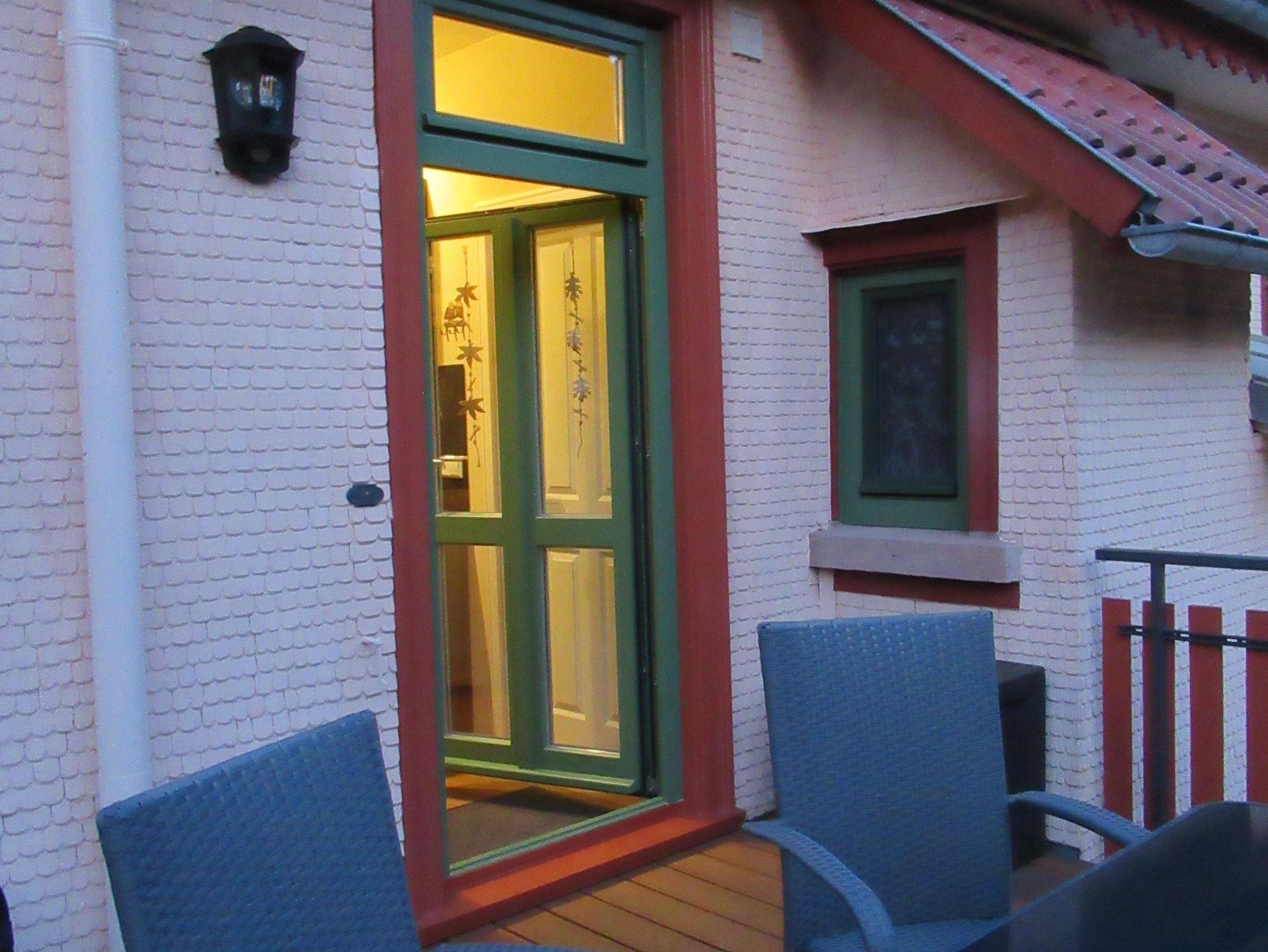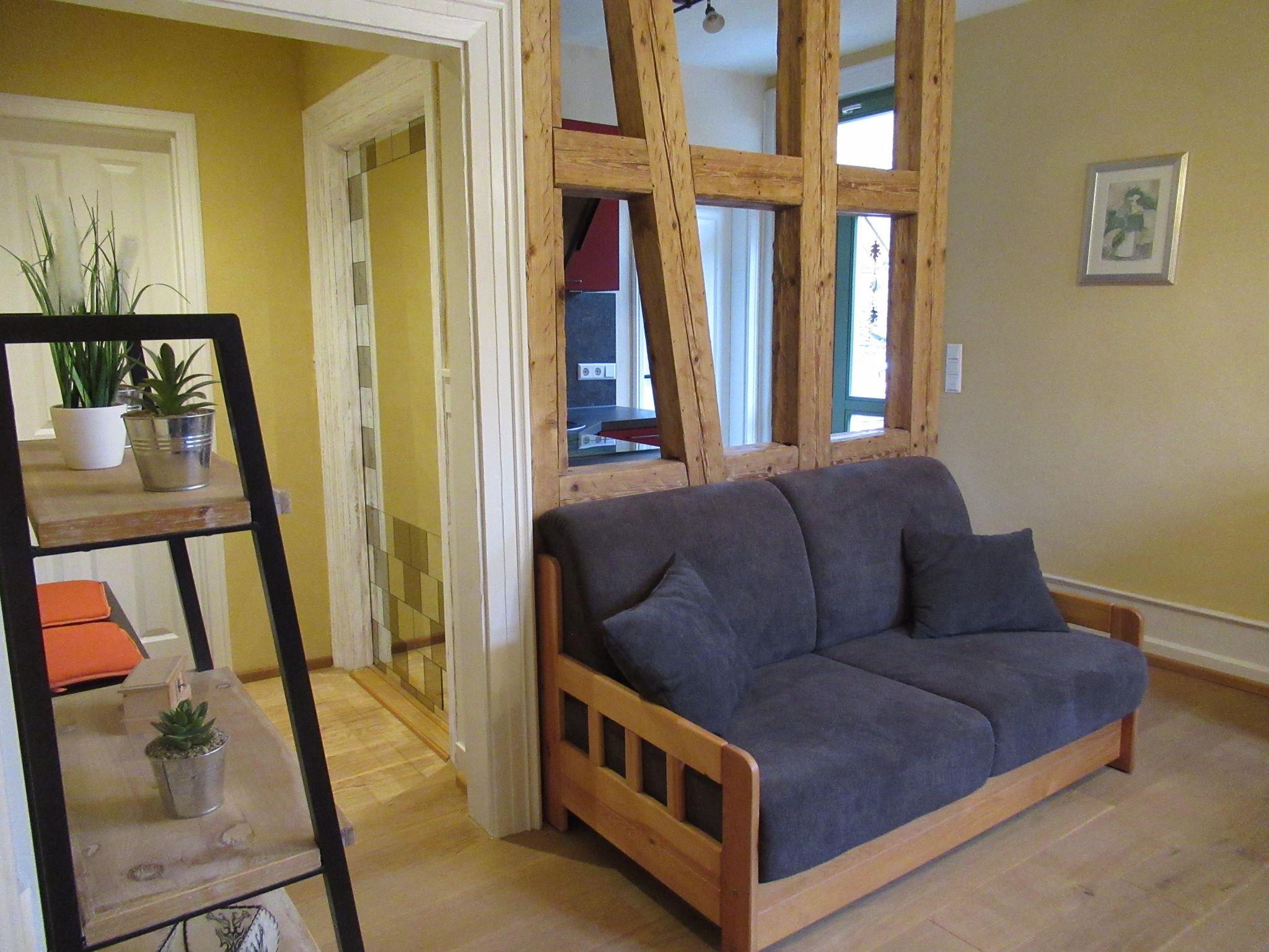 Die Ferienwohnung befindet sich im 1. Obergeschoss. Eine komfortable Wendeltreppe führt auf den großen Balkon. Von hier aus gelangen Sie in die kompakte Küche. Rechts befindet sich das Tageslichtbad mit großer Dusche. Der links angrenzende Wohn-/Essbereich ist durch ein offenes Fachwerk von der Küche getrennt. Direkt anschließend liegt das Schlafzimmer. Von hier aus erreichen Sie das Kinderzimmer.