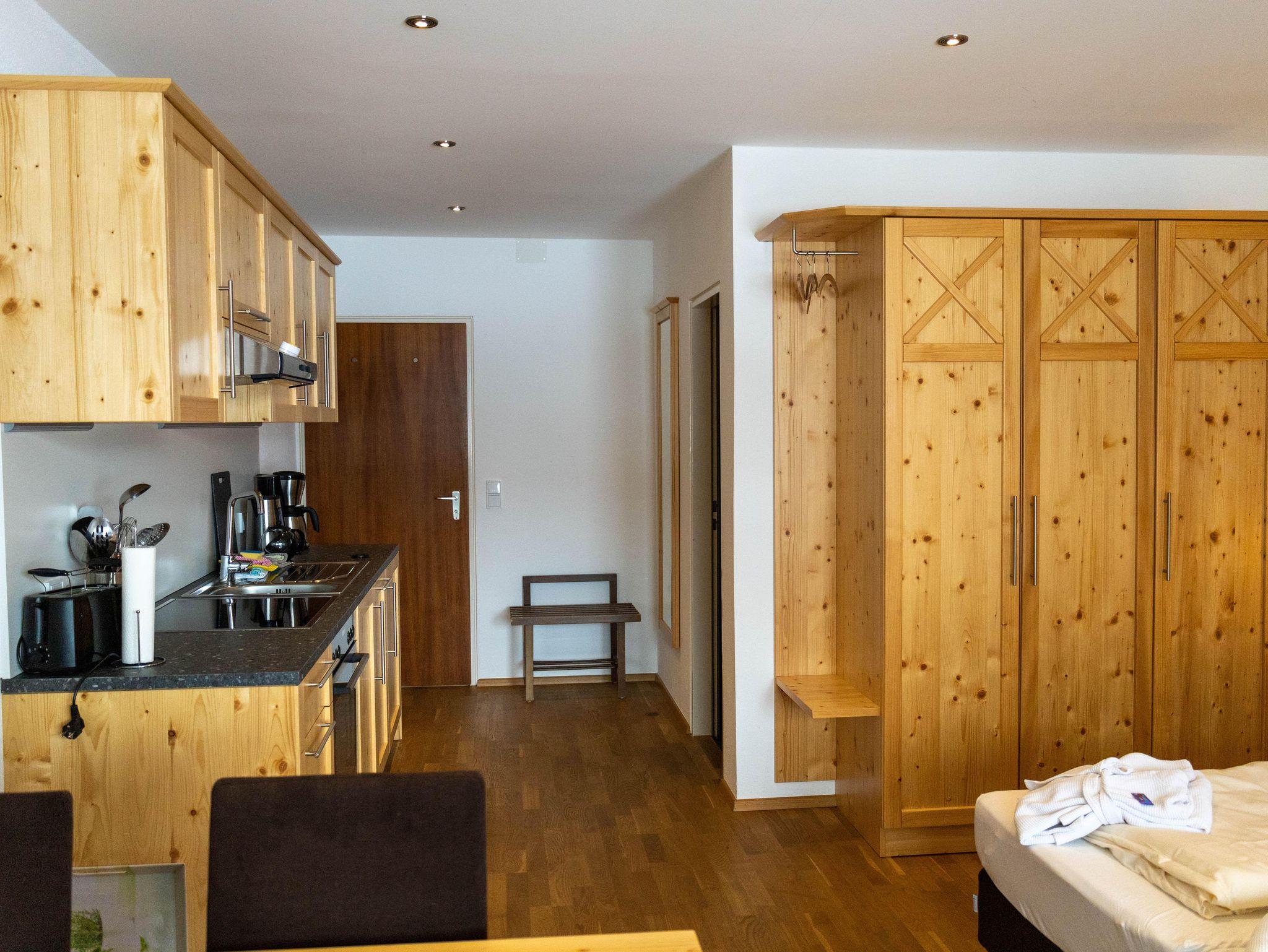 2-Zimmer-Ferienwohnung Alpenrose mit 49m², Südbalkon, herrlicher Ausblick, großer Wohn-Schlafraum mit Sitzecke, Küchenzeile und extra Schlafzimmer mit getrennten Betten.