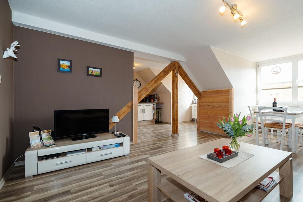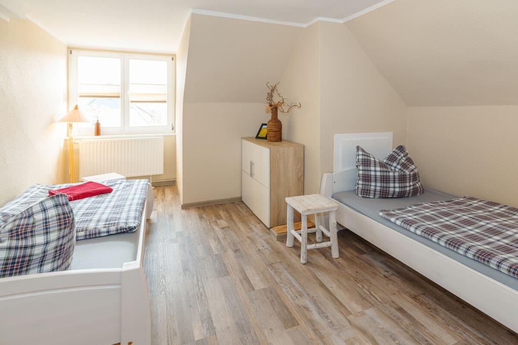Welcome to the holiday apartment "Zur Prinzenschule"! The charming holiday apartment on the 2nd floor has two bedrooms with a double bed or two single beds (through room) and a cozy living area. On approx. 63 m² you can make yourself comfortable in the garden corner after hikes or bike tours or just put your feet up. In addition to the 2 bedrooms, the holiday apartment consists of a modern, fully equipped open kitchen (with toaster, coffee machine, kettle, dishwasher, refrigerator, etc.), bathroom with shower and toilet, free WiFi and TV. Children (cot and highchair are available) are welcome guests in the non-smoking residence. A parking space for your vehicle is available.