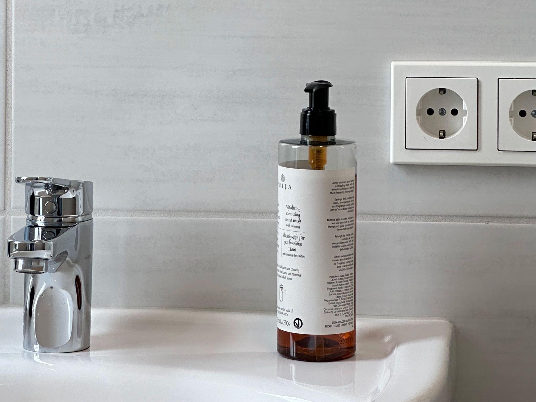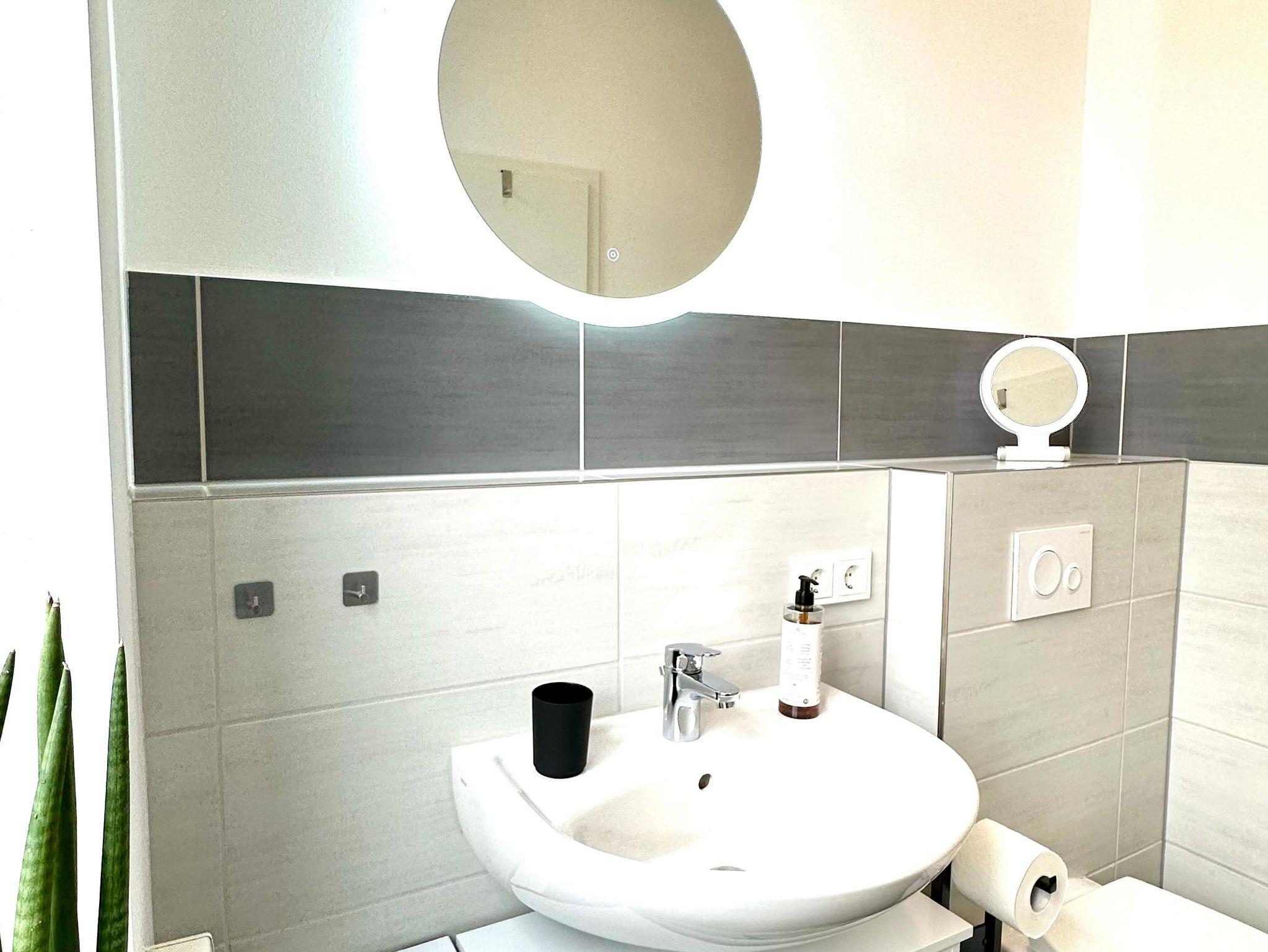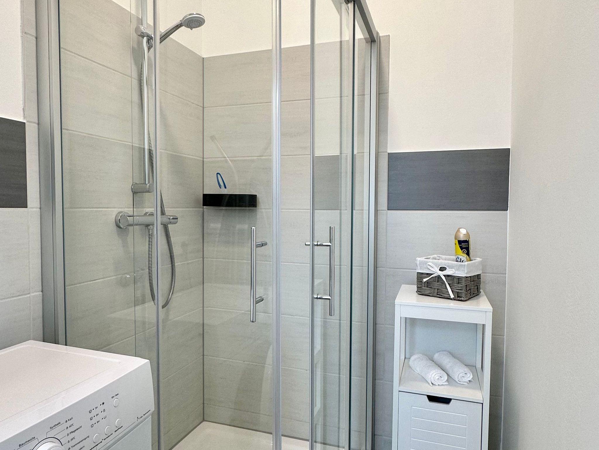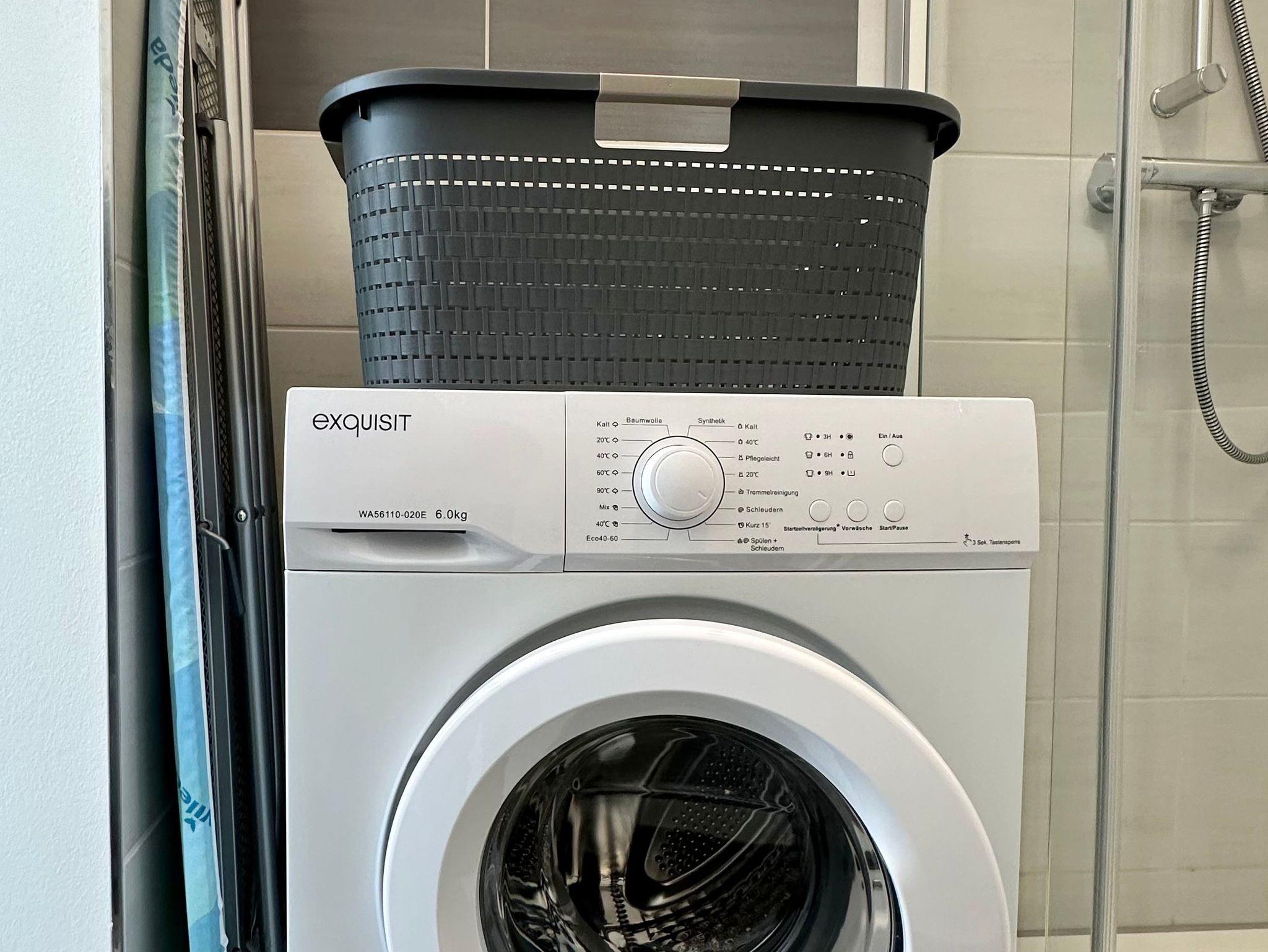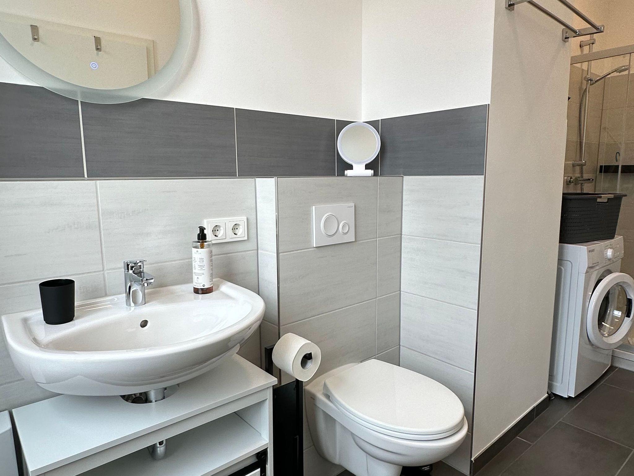 Das geschmackvolle Badezimmer ist mit einer Duschkabine, Haartrockner, einer Waschmaschine und Handseife sowie WC-Papier ausgestattet.