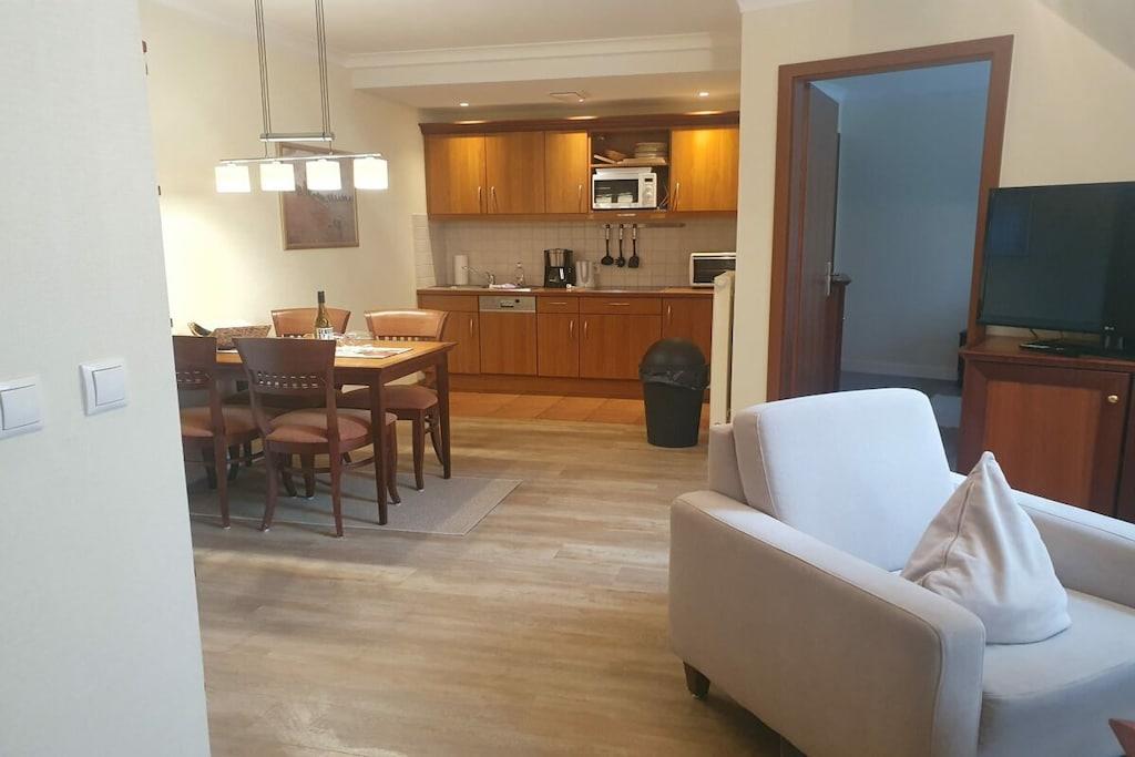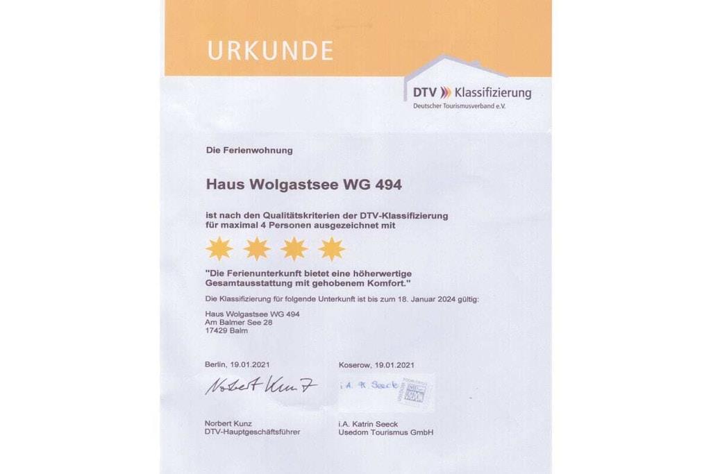 Ferieleiligheten «Haus Wolgastsee» ligger på Usedom, i Tysklands mest solrike region, rett ved Achterwasser/Balmer See. Den er omtrent 72 m² stor og har stue/spisestue med kjøkkenkrok, to soverom med LED-TV og to bad. Badene har gulvvarme. Den sørvendte, skjermede balkongen, badet i solskinn fra morgen til kveld, tilbyr en vakker utsikt. Balkongen er møblert med stoler, et bord og en parasoll for fire personer. En miniovn er tilgjengelig for baking, grilling og risting av rundstykker. Et sykkeloppbevaringsrom ligger i inngangspartiet. Gratis Wi-Fi er tilgjengelig. Alternativt kan brød og rundstykker bestilles og kjøpes i hotellresepsjonen.
