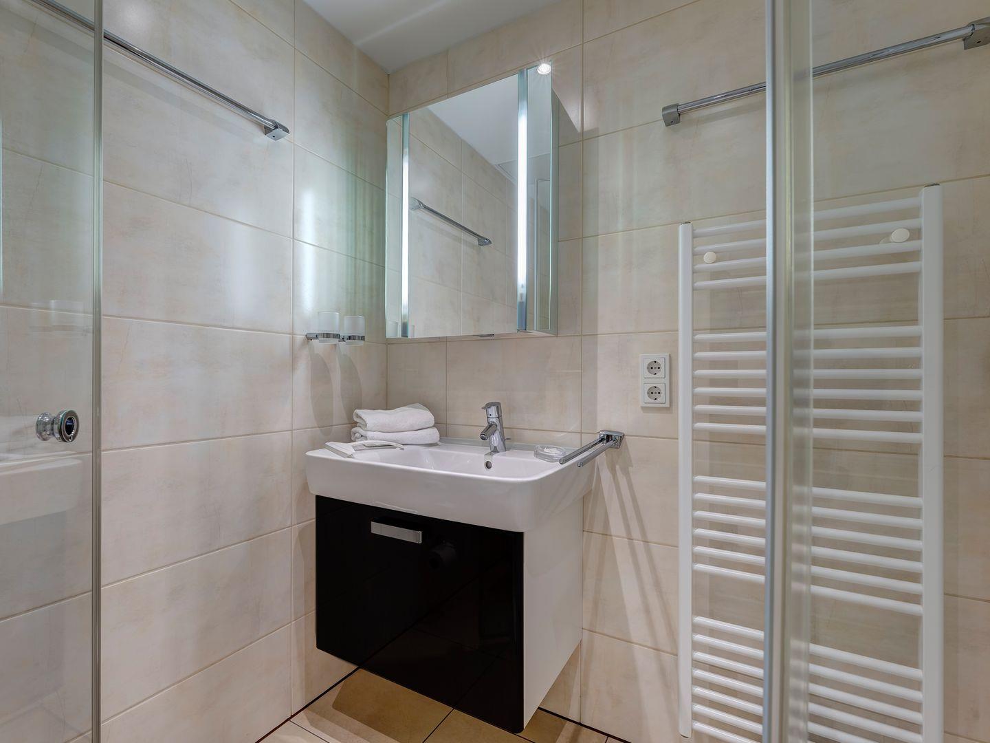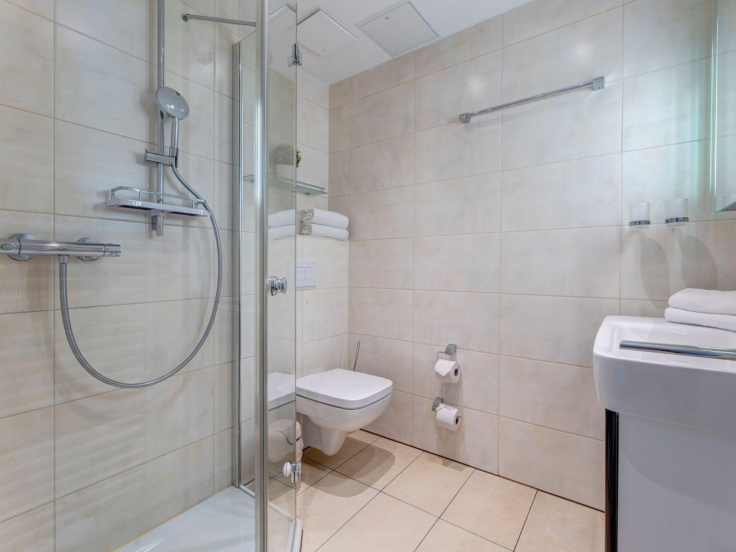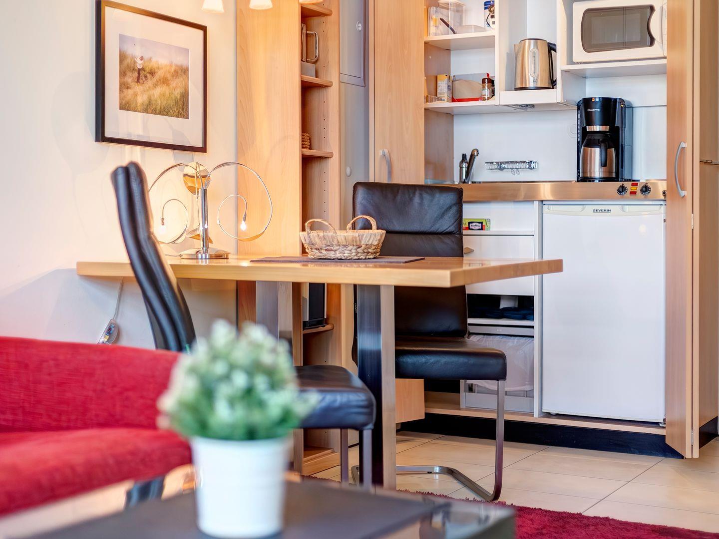 Zur Wohnung gehört ein praktischer Abstellraum im Hausflur, der Ihnen zusätzlichen Stauraum bietet. Das moderne Badezimmer lädt zum Entspannen ein, und die Pantryküche ist komplett ausgestattet, um Ihren Aufenthalt so angenehm wie möglich zu gestalten.