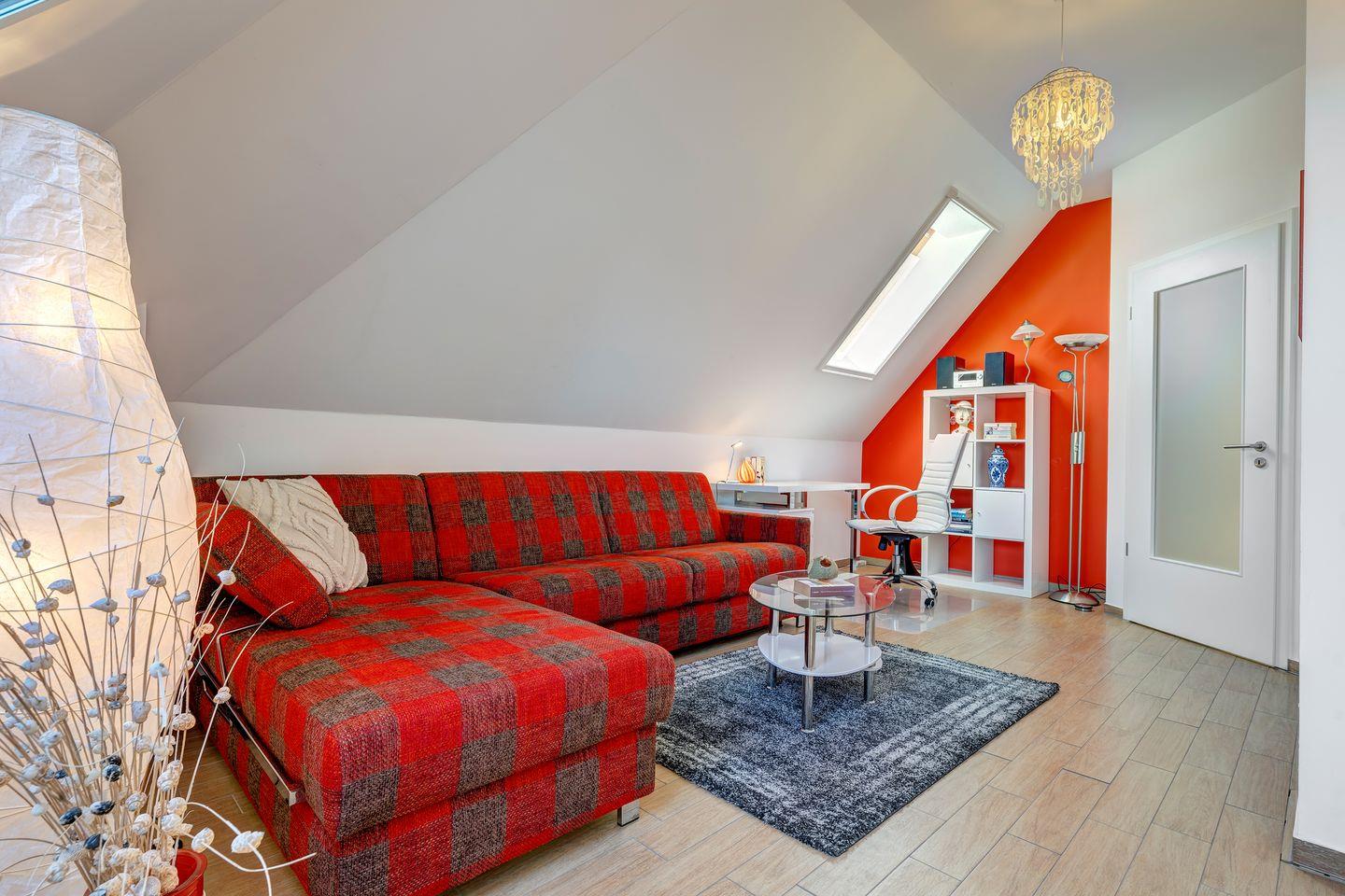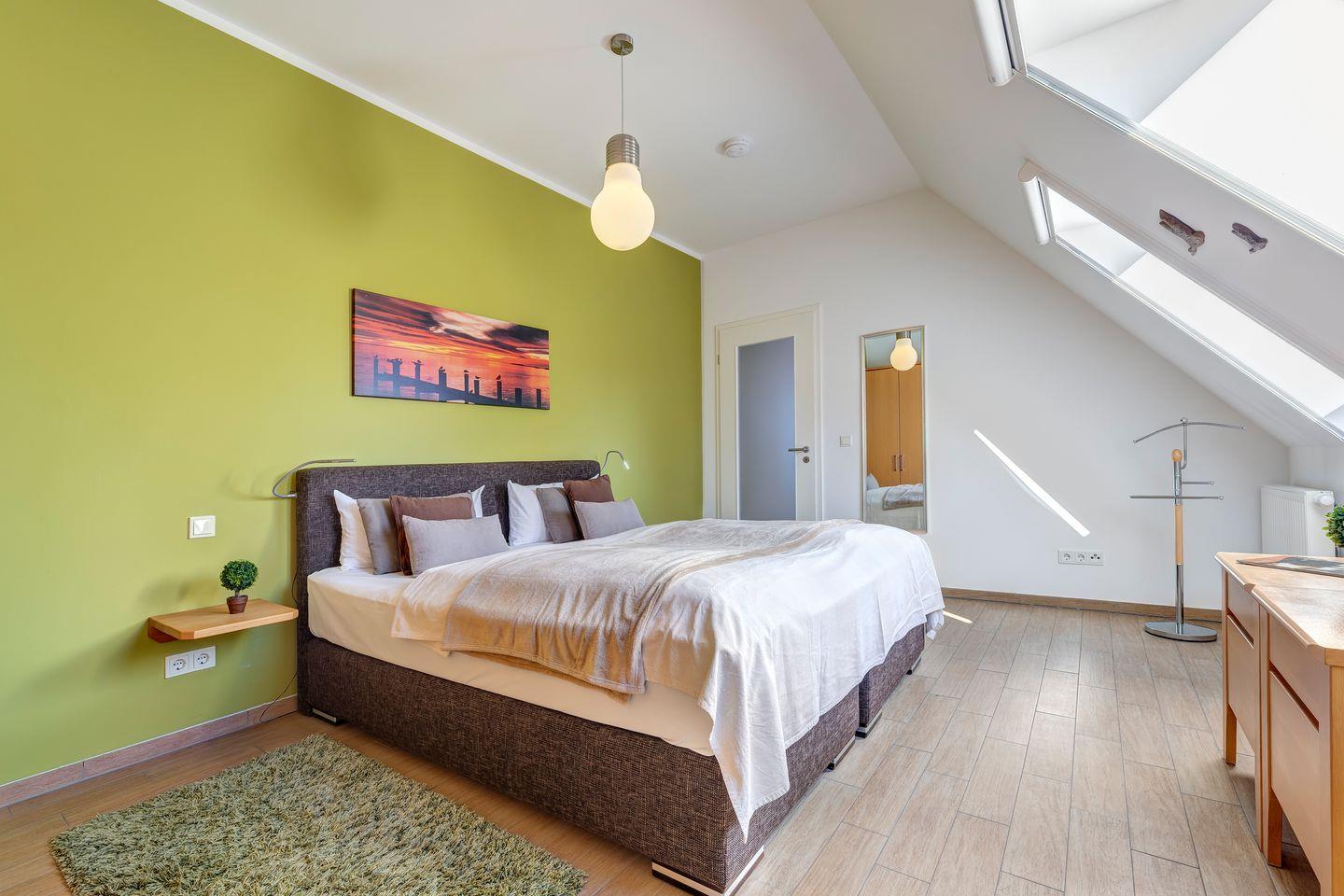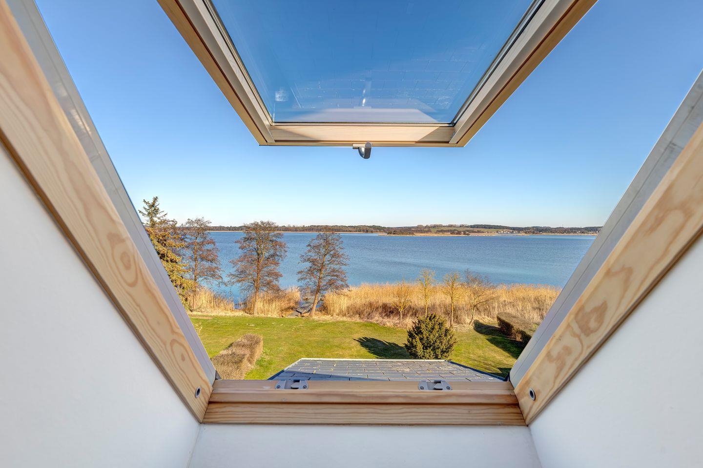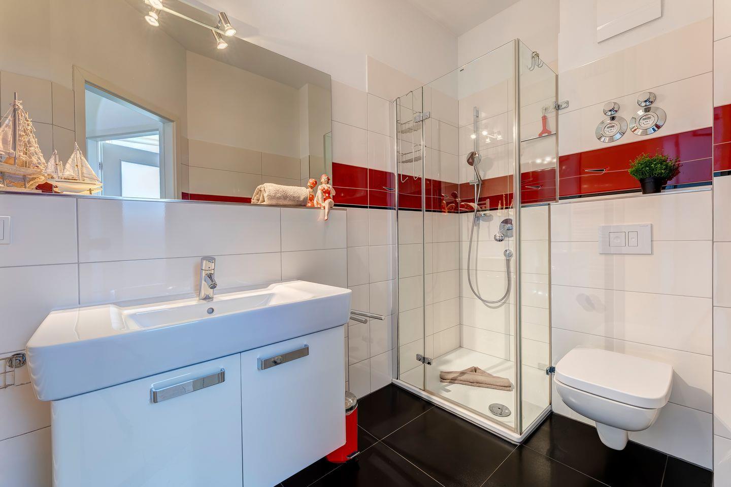 Der obere Bereich der Wohnung beherbergt das Schlafzimmer, ein weiteres Wohn-/Schlafzimmer und das Bad. Das 18 m² große Schlafzimmer bietet einen großzügigen Kleiderschrank und ein komfortables Boxspring-Doppelbett, während auch hier ein beeindruckender Blick auf das Achterwasser garantiert ist. Das etwa 20 m² große Wohn-/Schlafzimmer bietet einen faszinierenden Blick auf den Sonnenaufgang über dem Balmer See. Dieses moderne und hochwertig eingerichtete Zimmer verfügt über eine gemütliche Eckcouch, die sich mit wenigen Handgriffen in ein bequemes Doppelbett verwandeln lässt. Ein zusätzlicher Flachbildfernseher komplettiert die Ausstattung dieses vielseitigen Raumes.