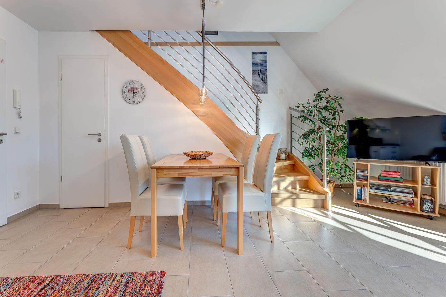 Das geräumige Wohnzimmer verspricht eine behagliche Atmosphäre und öffnet sich zu einem Balkon, von dem aus Sie die atemberaubende Aussicht auf das Achterwasser von morgens bis zum späten Nachmittag genießen können. Die offene Küche lädt mit vollständiger Ausstattung dazu ein, gemeinsam an einem Esstisch mit vier Stühlen gemütlich zu speisen. Ein Gäste-WC und ein Abstellraum runden den Wohnbereich ab.