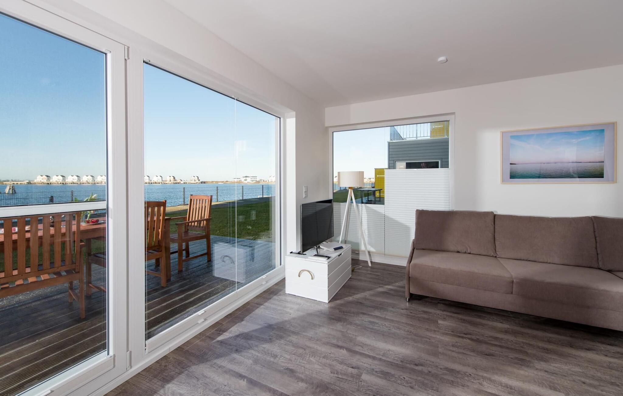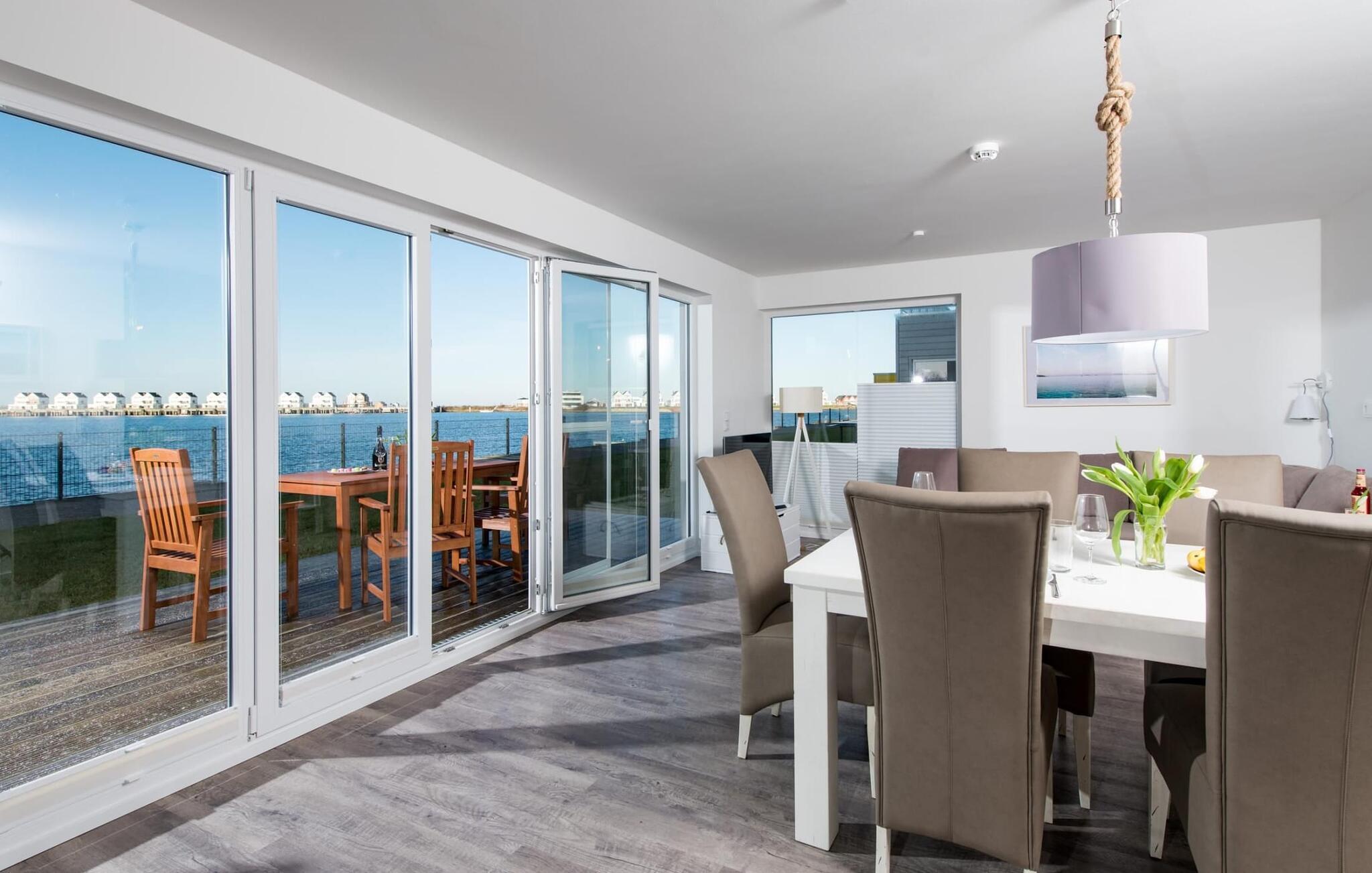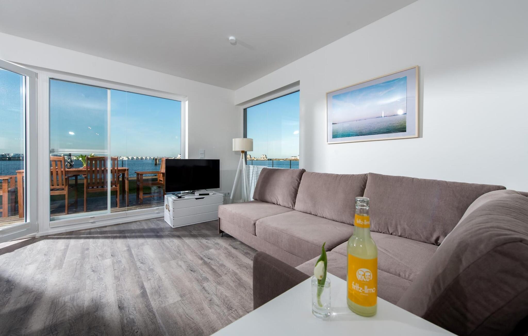 Fra oppholdsrommet og den tilstøtende terrassen har du fantastisk utsikt over marinaen. En havnekino sørger for underholdning under en hyggelig grillkveld eller en romantisk middag med levende lys og en billedskjønn solnedgang.