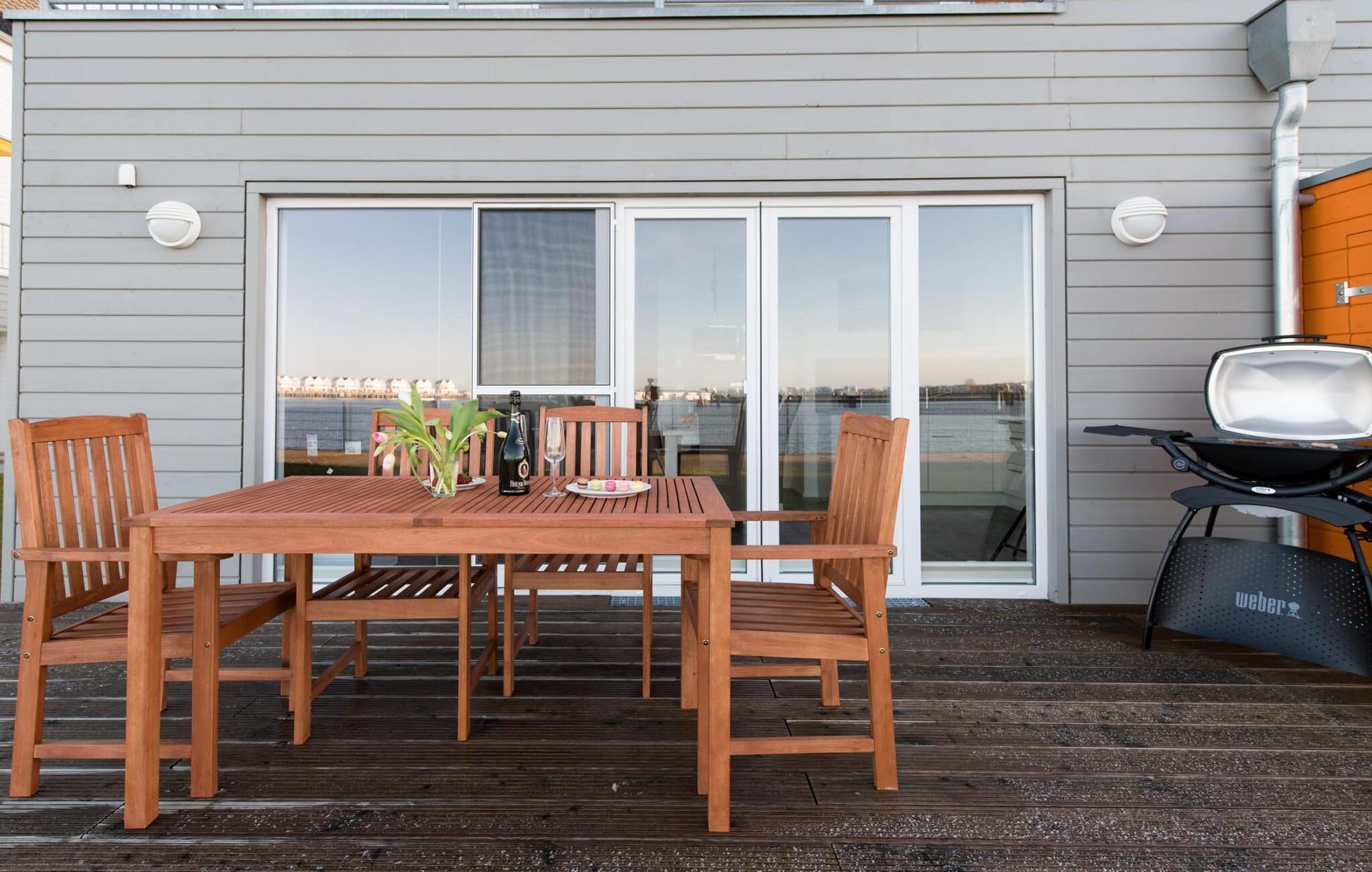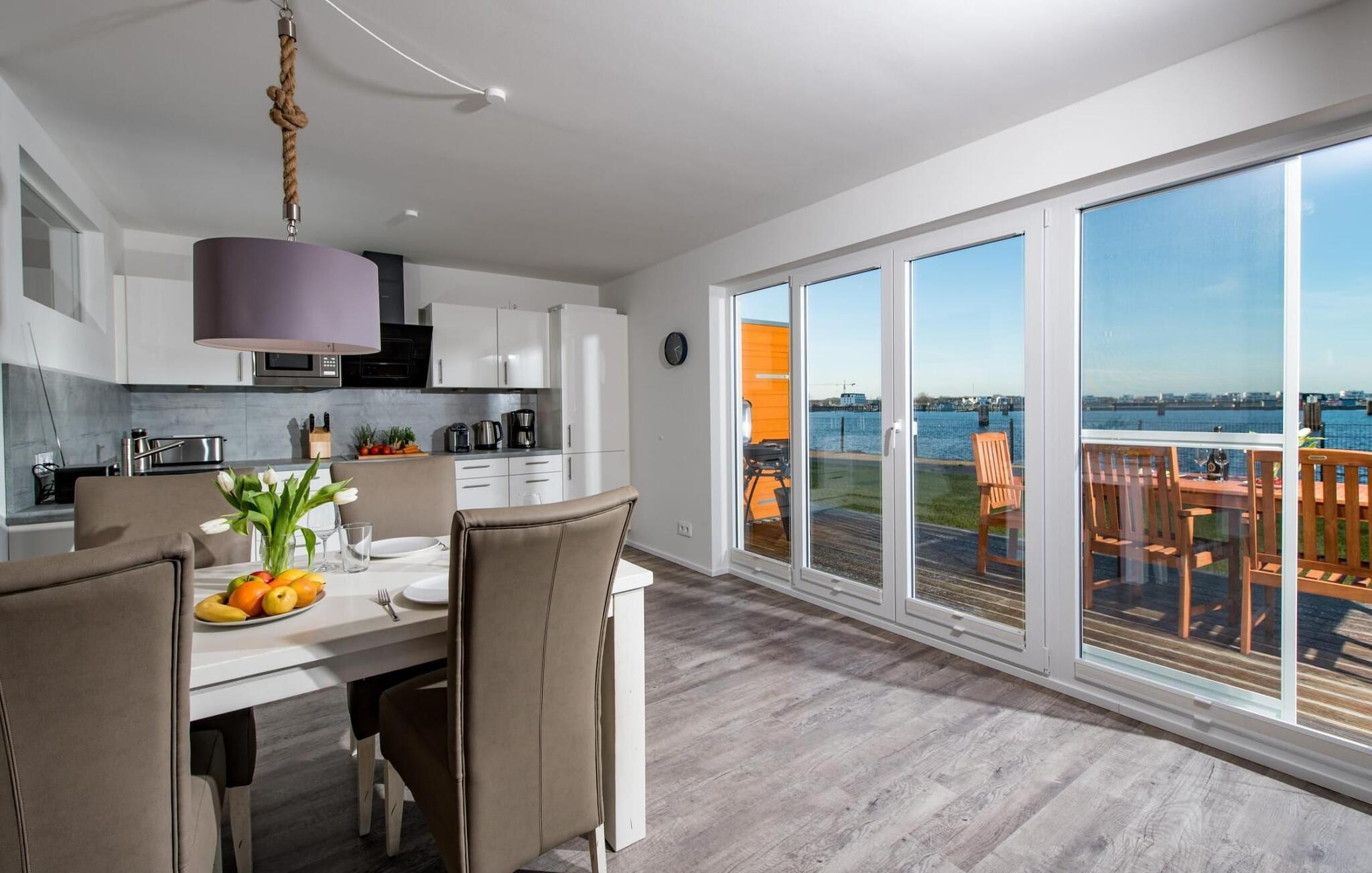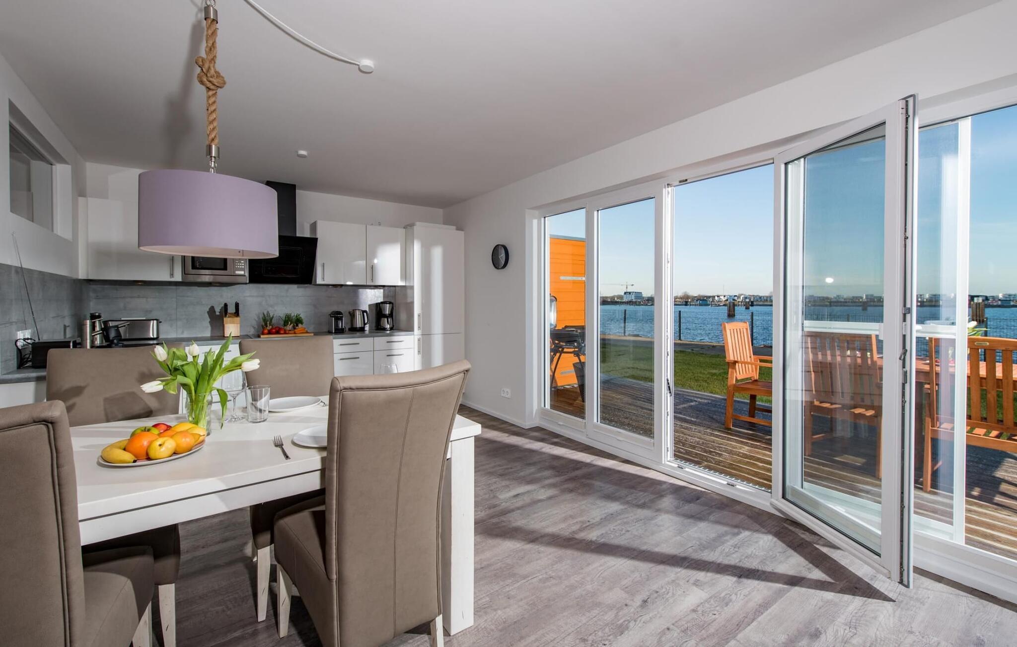 Fra oppholdsrommet og den tilstøtende terrassen har du fantastisk utsikt over marinaen. En havnekino sørger for underholdning under en hyggelig grillkveld eller en romantisk middag med levende lys og en billedskjønn solnedgang.