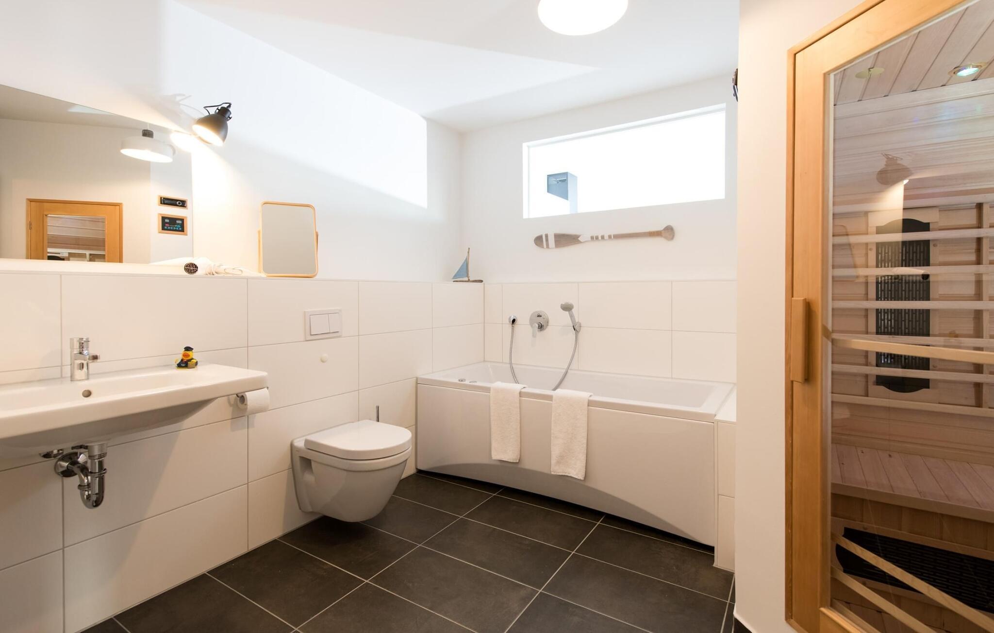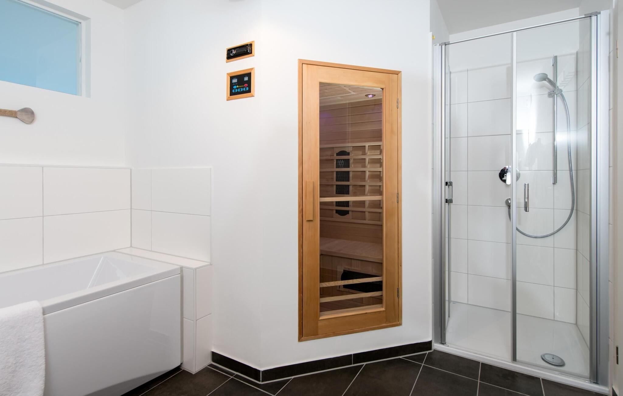 Velværeentusiaster vil få valuta for pengene: En infrarød kabine med hi-fi-lydanlegg og LED-fargelysterapi samt et avslappende boblebad inviterer deg til å slappe av etter en spasertur på stranden. En dusj med nivåtilgang er også tilgjengelig.