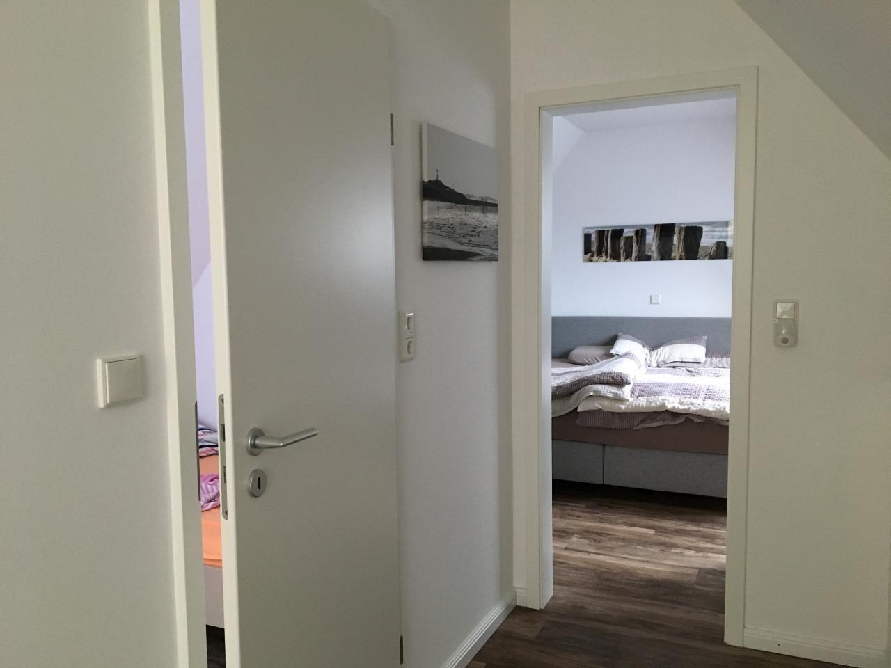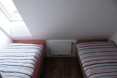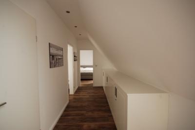 Das Objekt wurde in 2013 fertiggestellt. Die lichtdurchflutete Wohnung ist großzügig geschnitten und verteilt sich auf zwei Ebenen. Im oberen Teil sind die beiden Schlafräume und ein kleines Bad mit WC untergebracht. Das große Elternzimmer ist mit einem modernen Boxspring-Bett ausgestattet, das kleinere Zimmer beinhaltet zwei Einzelbetten. Ein Babybett mit extra Matratze ist verfügbar, ebenso ein Kinderstuhl. (Geschirr u. Besteck für 12 Personen)