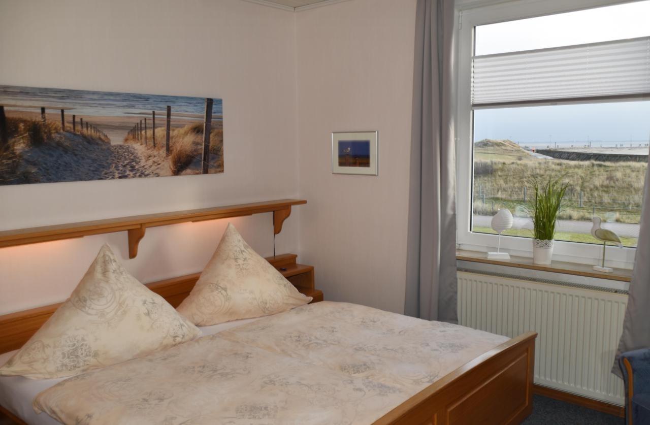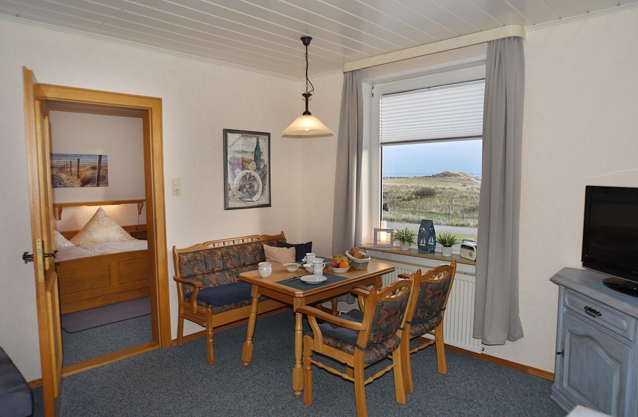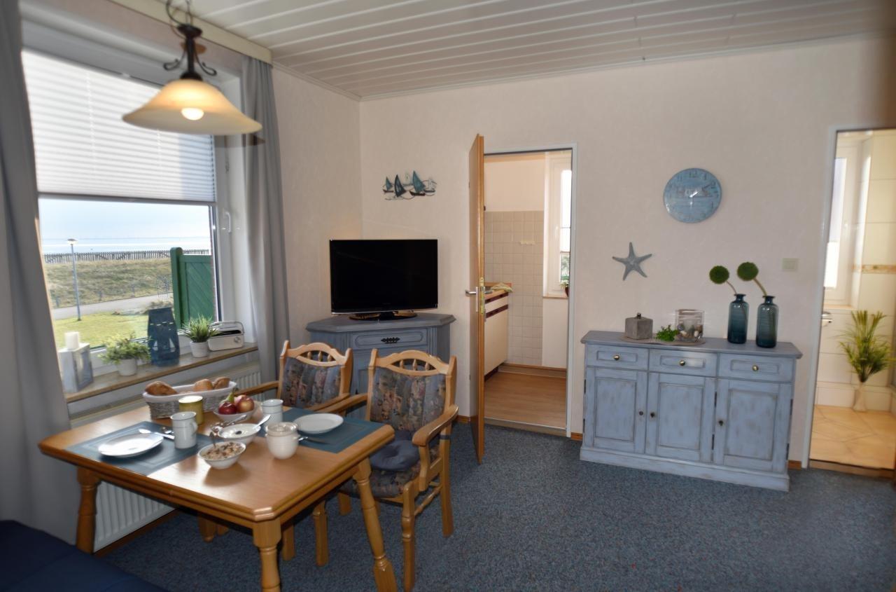 Ferienwohnung im Erdgeschoss mit Blick Richtung Süden auf das Meer, den Hafen, und das Ostende von Norderney mit den Seehundbänken. Schlafzimmer mit Doppelbett 180 x 200 cm und Kleiderschrank, Wohnbereich mit Sitzecke, Sofa und Sat-TV, separate Küche mit Cerankochfeld und Geschirrspüler, Duschbad mit Fenster.