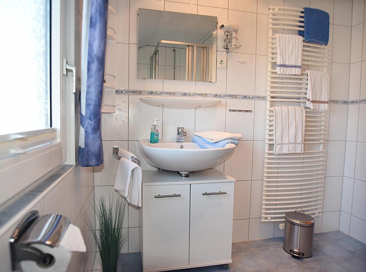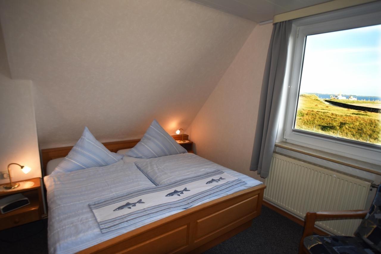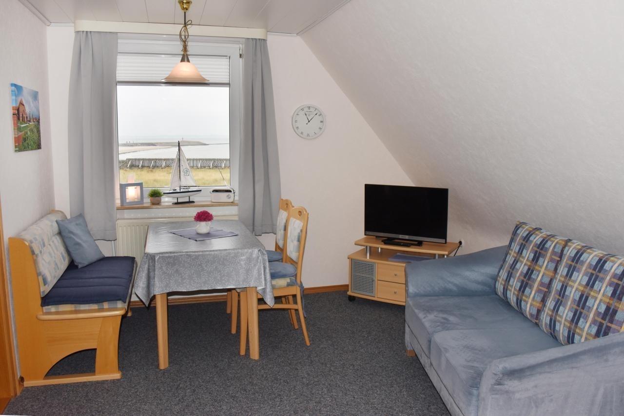 Ferienwohnung in der 1. Etage mit Blick Richtung Süden auf das Meer, den Hafen, und das Ostende von Norderney mit den Seehundbänken. Schlafzimmer mit Doppelbett 180 x 200 cm und Kleiderschrank, Wohnbereich mit Sitzecke, Sofa und Sat-TV, separate Küche mit Cerankochfeld und Geschirrspüler, Duschbad mit Fenster.