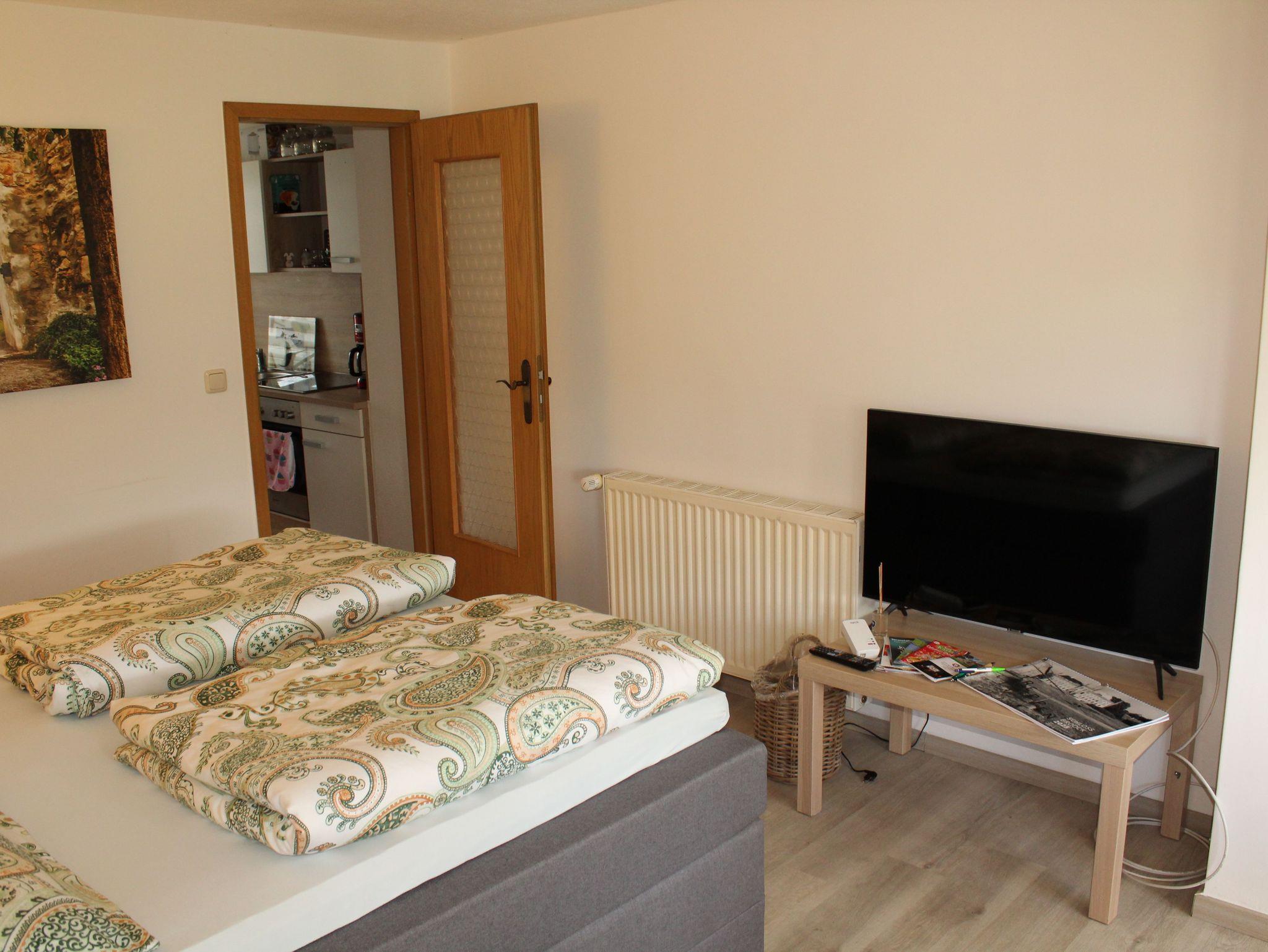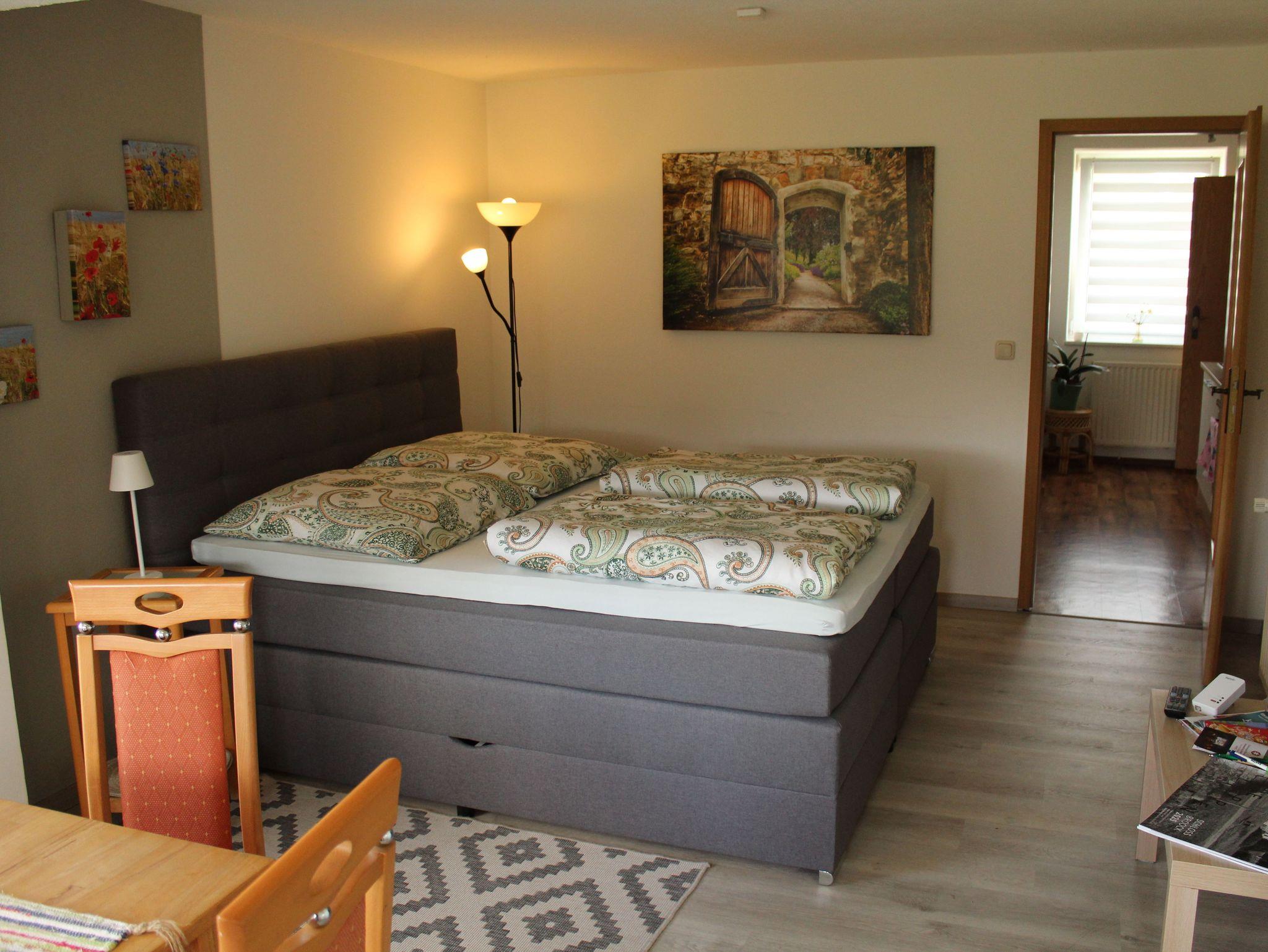 - Kombiniertes Wohn-/Schlafzimmer mit Boxspringbett, Essbereich, TV und Musikabspielmöglichkeit