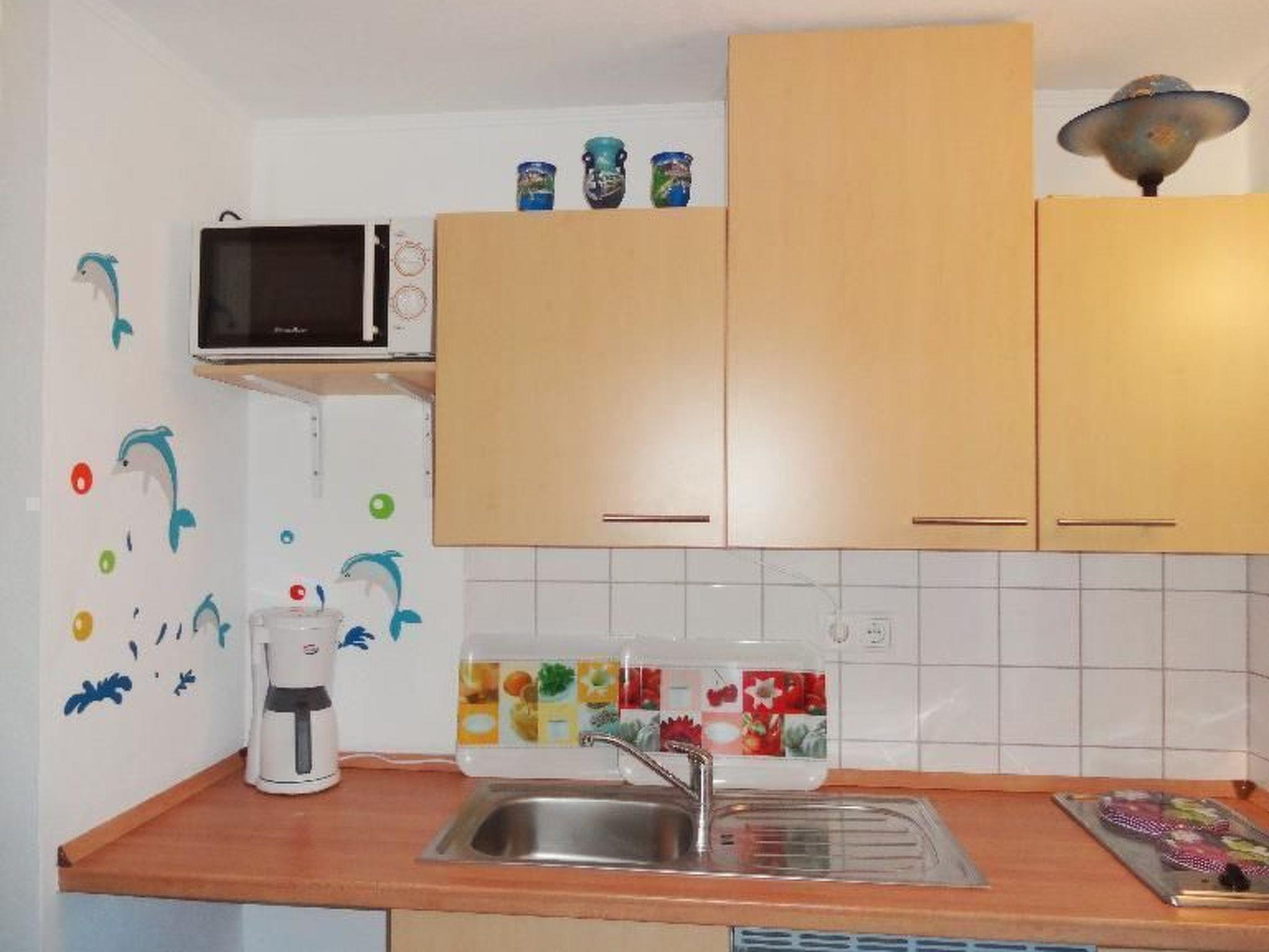 This cosy one-bedroom flat on the ground floor (34 m²) has a terrace and offers a living area with dining area and kitchenette as well as a shower room. The kitchen is equipped with 2 hotplates, a coffee machine, a kettle, an egg boiler, a microwave and crockery. Please note that there is no oven.