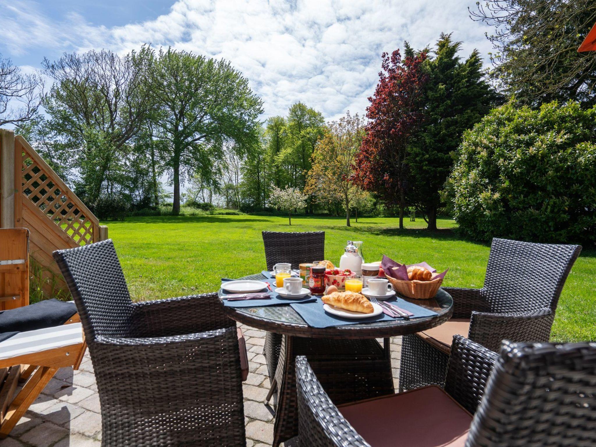 Facing south, the holiday flat has its own terrace with a beach chair. Enjoy the marvellous view of the garden and the wide courtyard where, with a bit of luck, pheasants, hares and deer can be observed. During the season we also offer the delivery of fresh bread rolls directly to the farm.