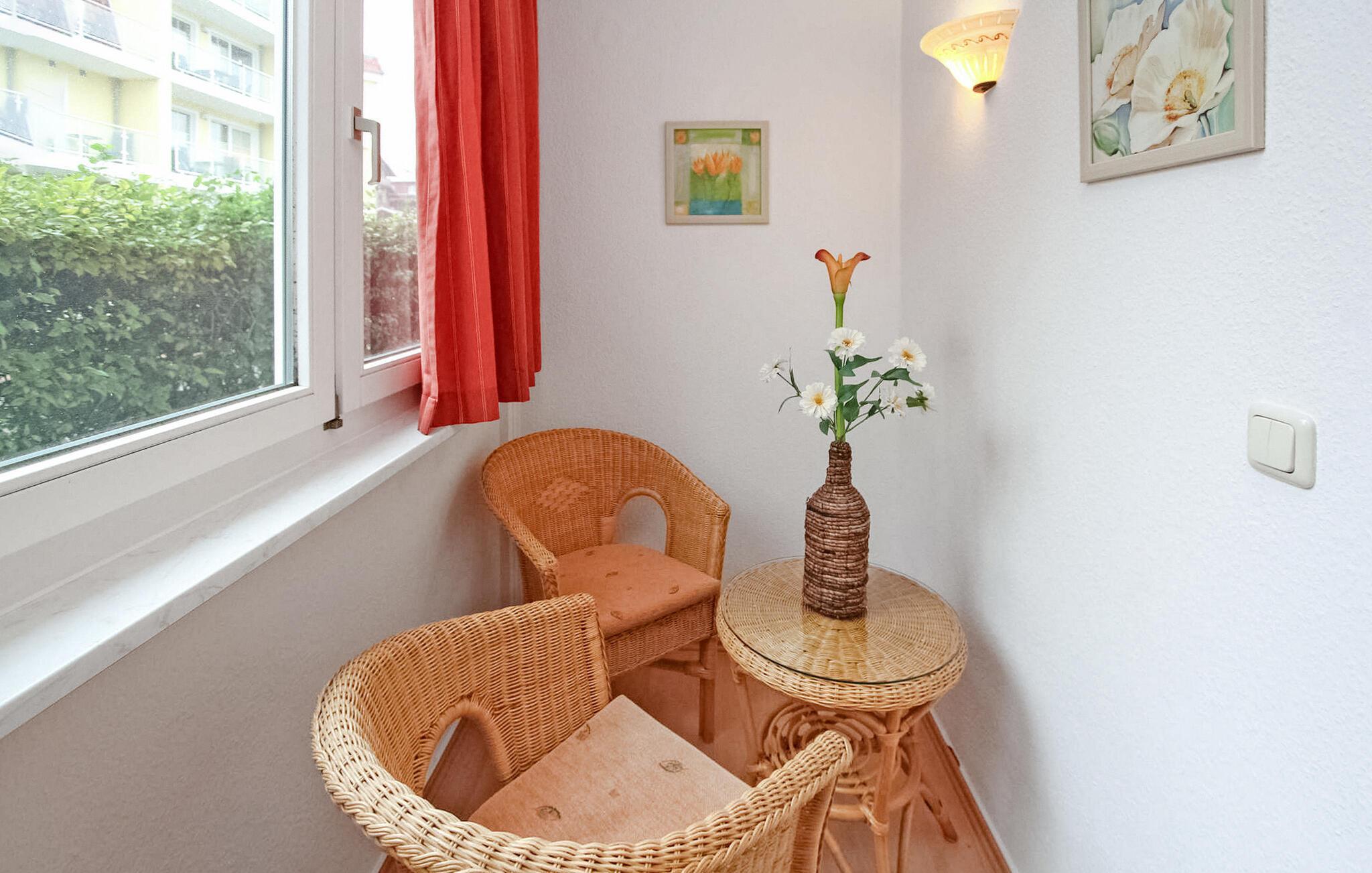 En av fire ferieleiligheter i en boligvilla bygget i typisk spa-arkitektur mellom Østersjøstranden (ca. 100 m) og Schloon-sjøen. Det er egen inngang til leilighetene. Det er én gratis parkeringsplass (begrenset antall) til hver boenhet. Ved fullt belegg og av plasshensyn parkeres gjestebilene etter hverandre, noe som gjør det nødvendig med en innbyrdes ordning. En barneseng er tilgjengelig etter avtale. Totalprisen inkluderer vann- og energiforbruk og sluttrengjøring. Du må selv ta med sengetøy og håndklær. Sykler kan parkeres på eiendommen.