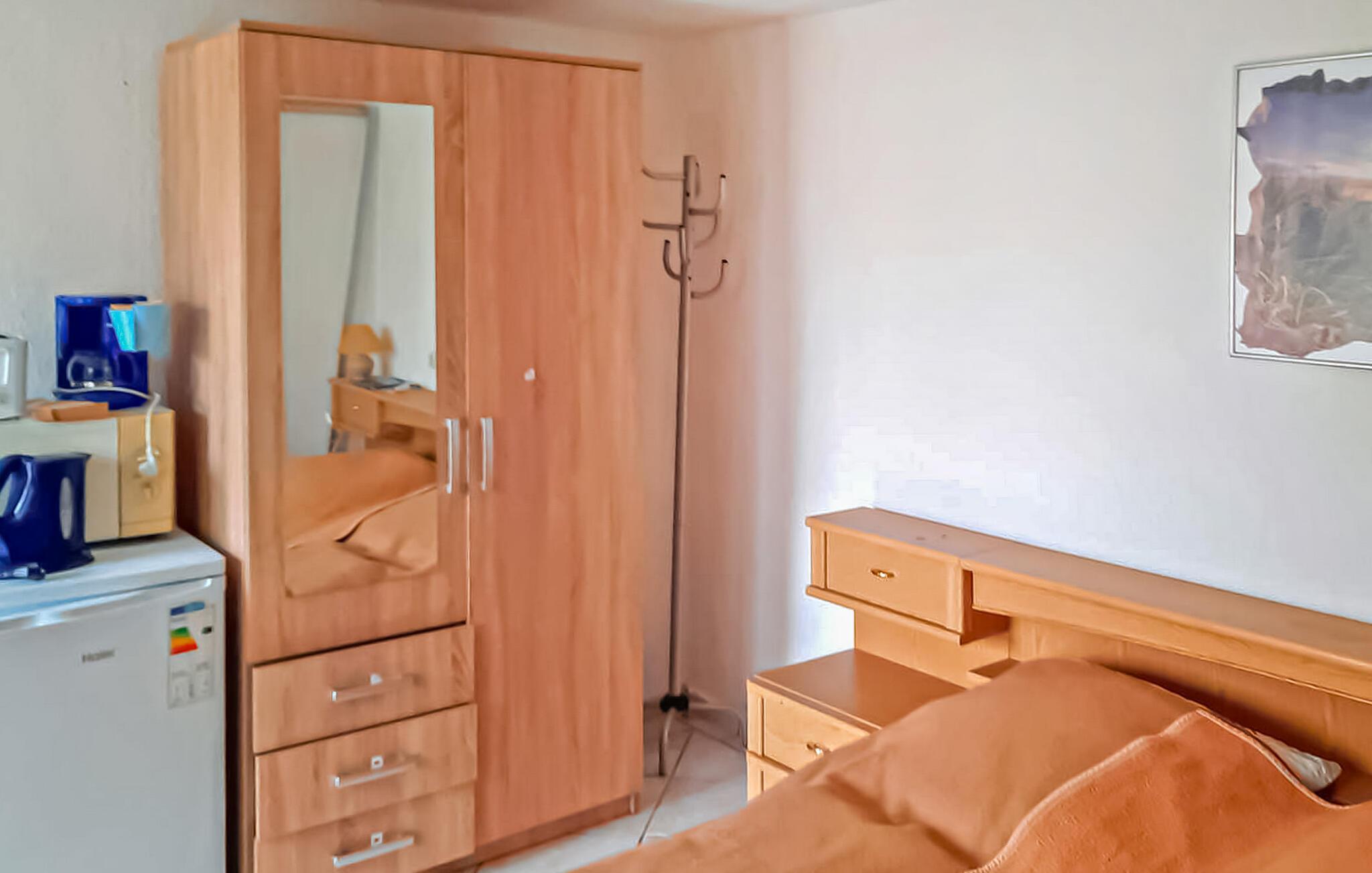 Det separate gjesterommet er innredet med dobbeltseng, flatskjerm-TV, sittegruppe, garderobe, sentralvarme, dusj/WC. Kjøkkenet er utstyrt med kjøleskap, kaffemaskin, mikrobølgeovn og servise. Det er en sittegruppe i hagen med grillfasiliteter og en parkeringsplass. Inkludert i totalprisen: Sluttrengjøring, vann- og energiforbruk. Sengetøy kan medbringes eller leies ved behov. Håndklær må medbringes. Husdyr er ikke tillatt i denne boligen. Hele feriehuset er tilgjengelig fra et belegg på 4 personer. Ferieboligen er ikke egnet for gjester med nedsatt funksjonsevne.